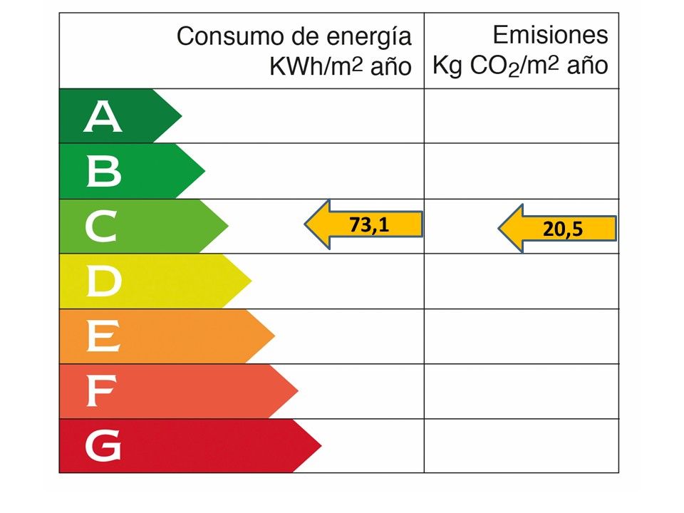 • Valor de consumo energético: 73.1 kWh/(m2*a) • Emisiones CO2: 20.5 kg/m2 • Escala de Emisiones de CO2: C • Clase de eficiencia energética: C