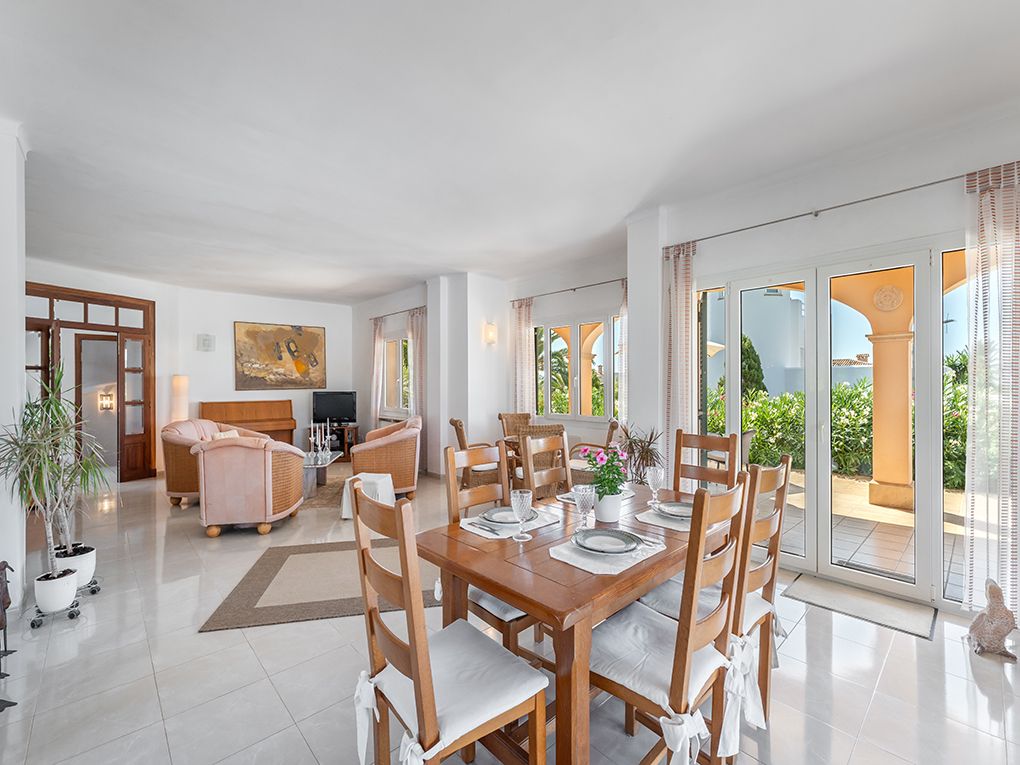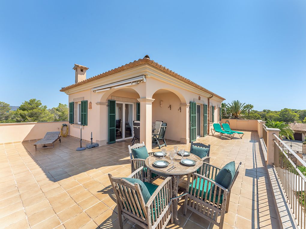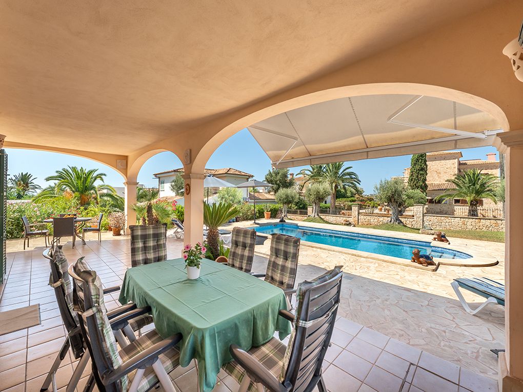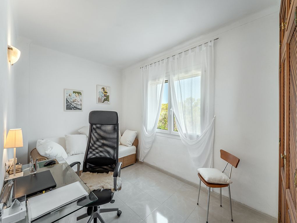 Esta encantadora villa de estilo mallorquín te espera en el corazón de la bien cuidada urbanización Sa Torre Nova, en una espaciosa parcela de 1,374 m². El jardín, diseñado con esmero, con palmeras y olivos, crea una auténtica atmósfera mediterránea con mucha privacidad. La impresionante zona de entrada con puertas dobles se abre a una sala de estar/comedor de planta abierta con acceso directo a la terraza cubierta, ideal para reuniones con familiares y amigos. En la planta baja también se encuentra una cocina moderna, un lavadero, un aseo de cortesía, un dormitorio y una amplia habitación que actualmente se utiliza como sauna y zona de fitness. En el piso superior hay dos dormitorios, uno con baño en suite, y una tercera habitación que actualmente se utiliza como estudio. Desde aquí se puede acceder a la espaciosa terraza en la azotea con cómodos asientos y impresionantes vistas al mar. El aire acondicionado dividido (frío/calor) en un dormitorio y los radiadores aseguran un confort de vida agradable en cada temporada. El área exterior ofrece varias terrazas amplias y una piscina de 50 m², un lugar para relajarse y disfrutar. La ubicación permite caminar hasta la popular Cala Santanyi y ofrece un acceso rápido al encantador pueblo de Santanyí, un refugio con un estilo de vida mallorquín.