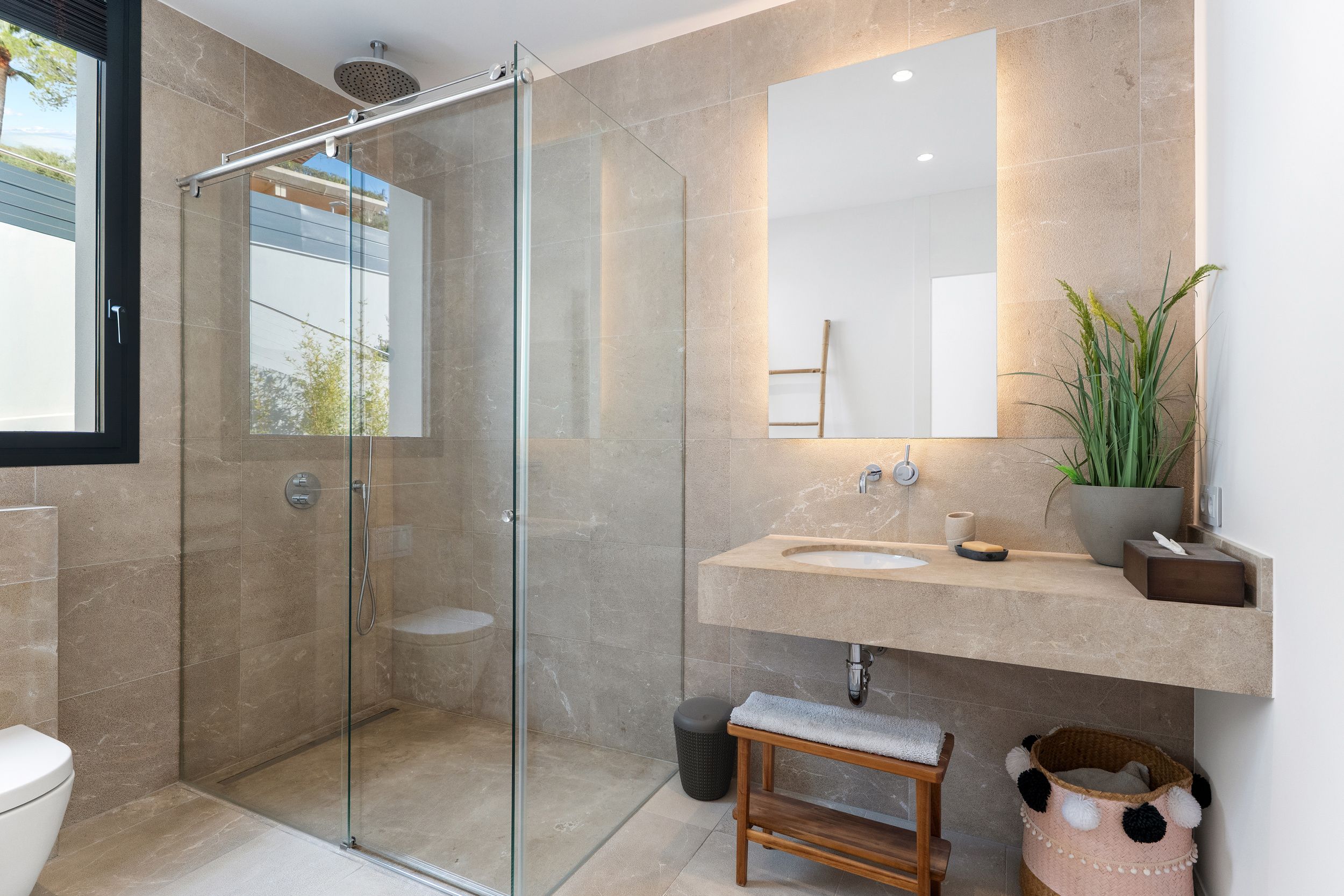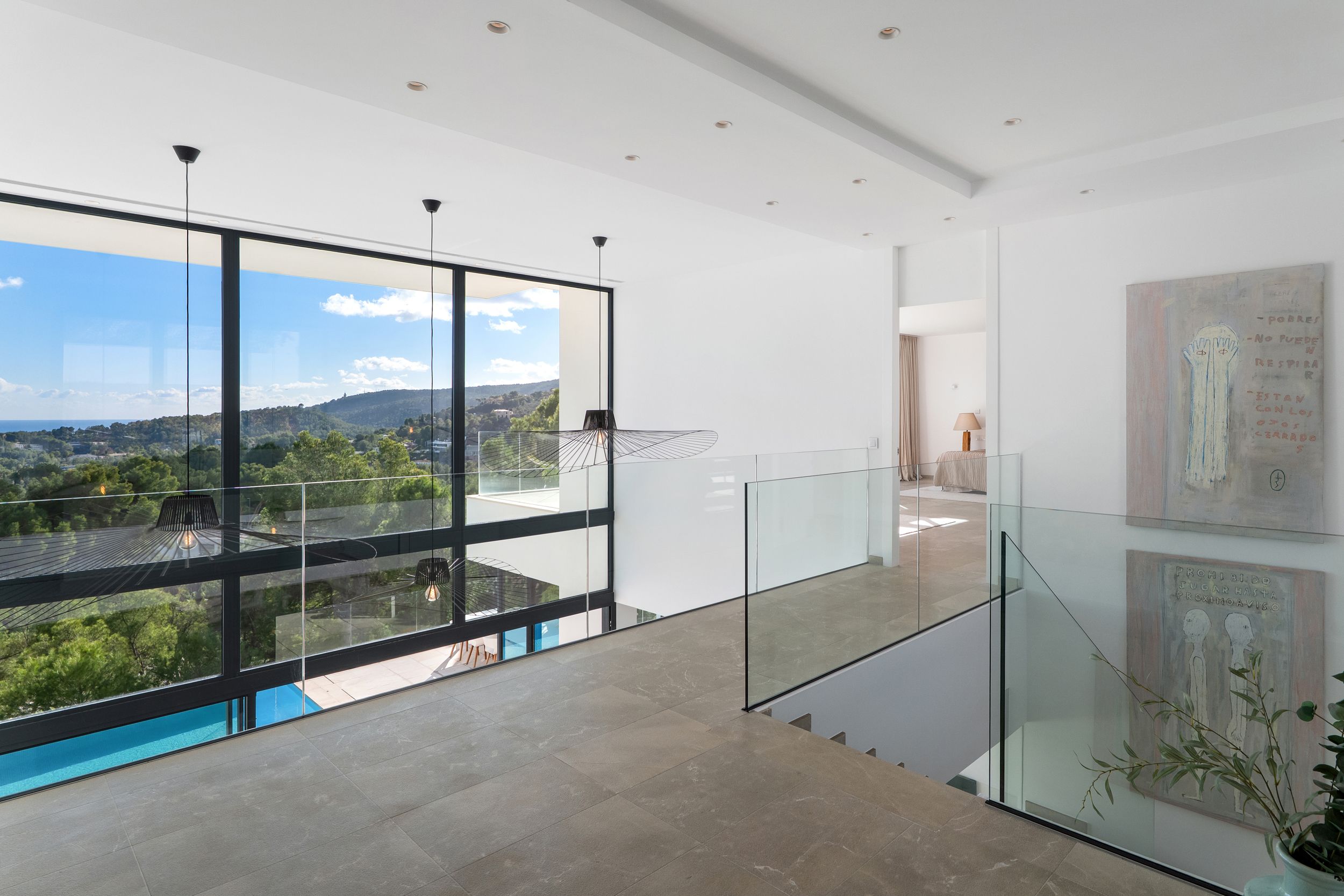 La planta superior alberga tres dormitorios, todos con baño en suite, además de la suite principal, que dispone de un amplio baño y vestidor. Cada dormitorio cuenta con su propia terraza privada, ideal para disfrutar del entorno y las vistas.