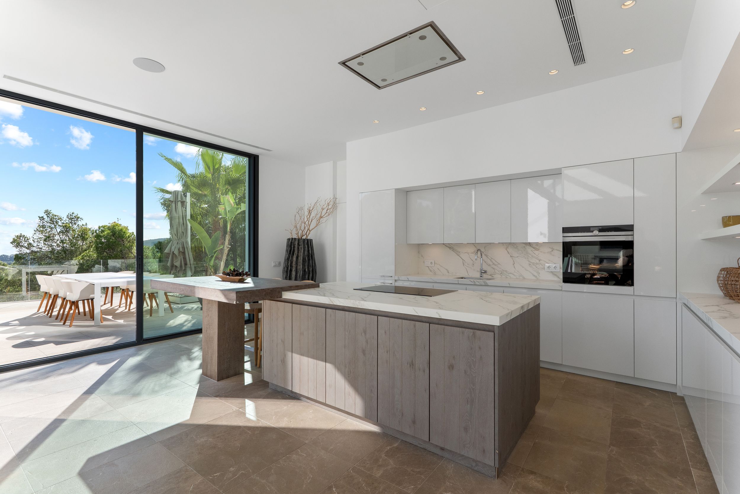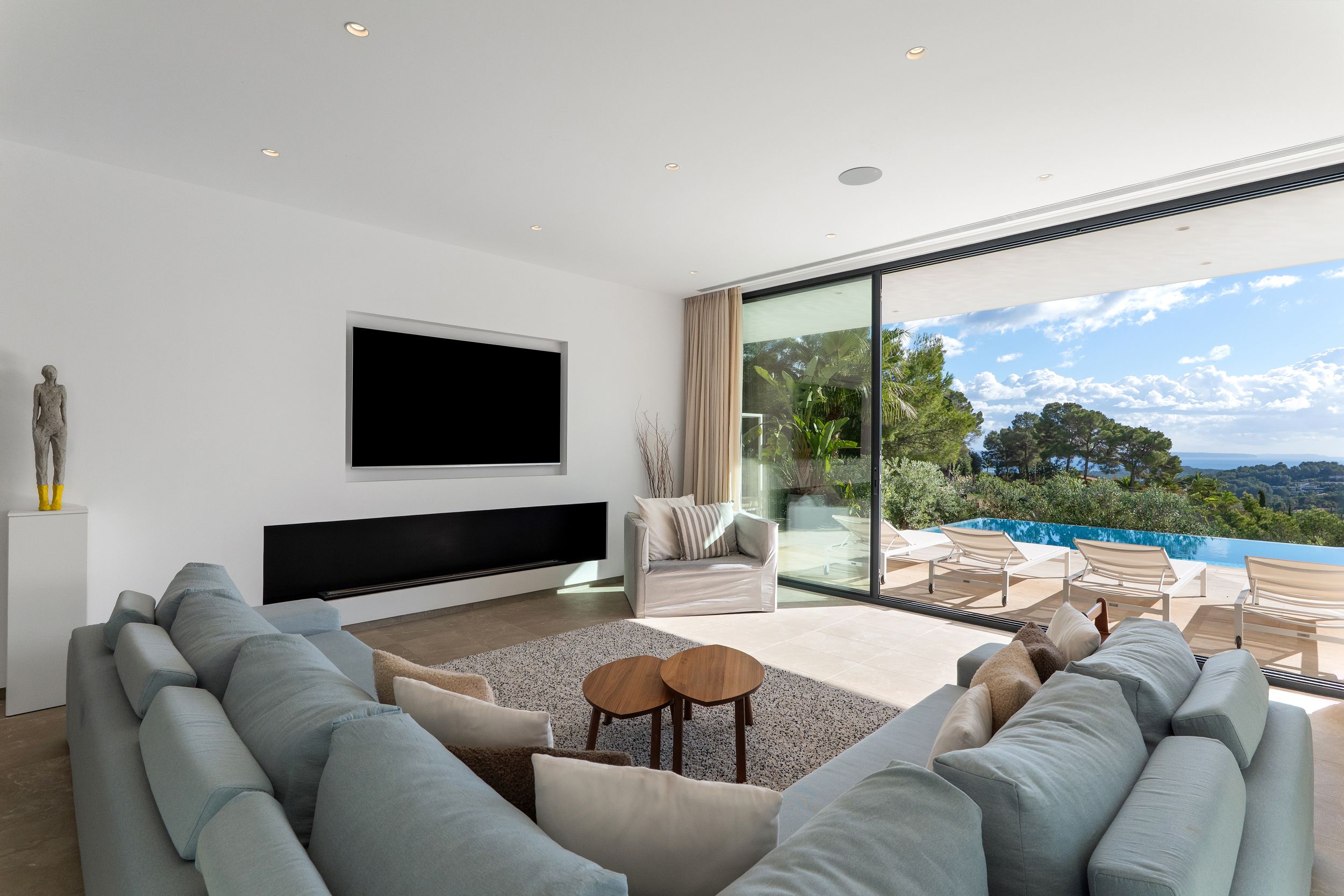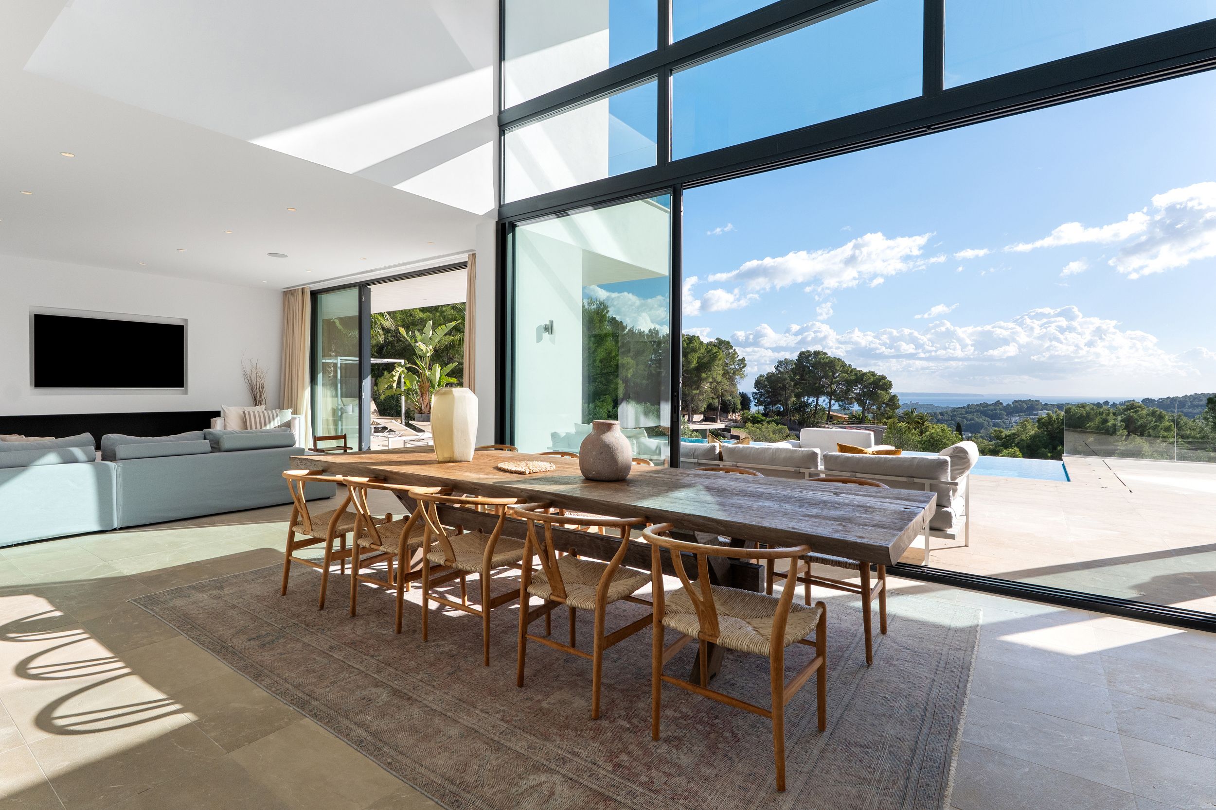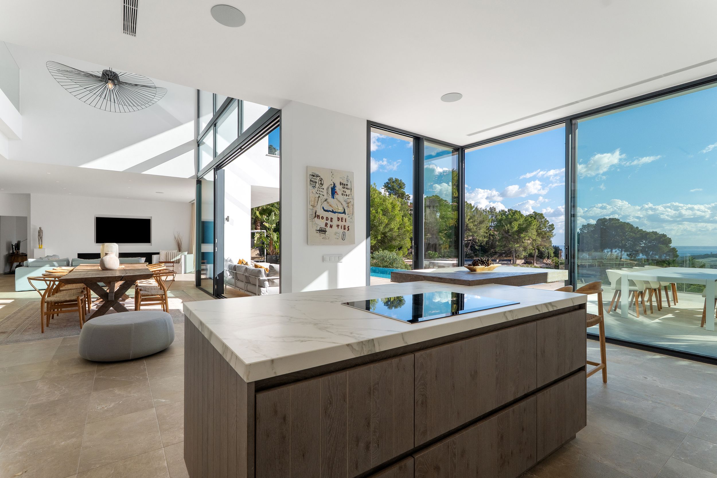 Diseñada con un concepto abierto, la villa cuenta con grandes ventanales correderos que integran armoniosamente los espacios interiores con las amplias zonas exteriores.