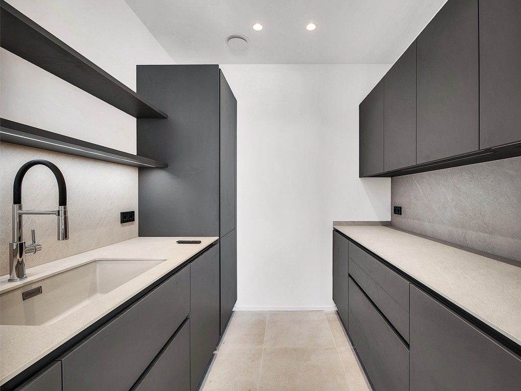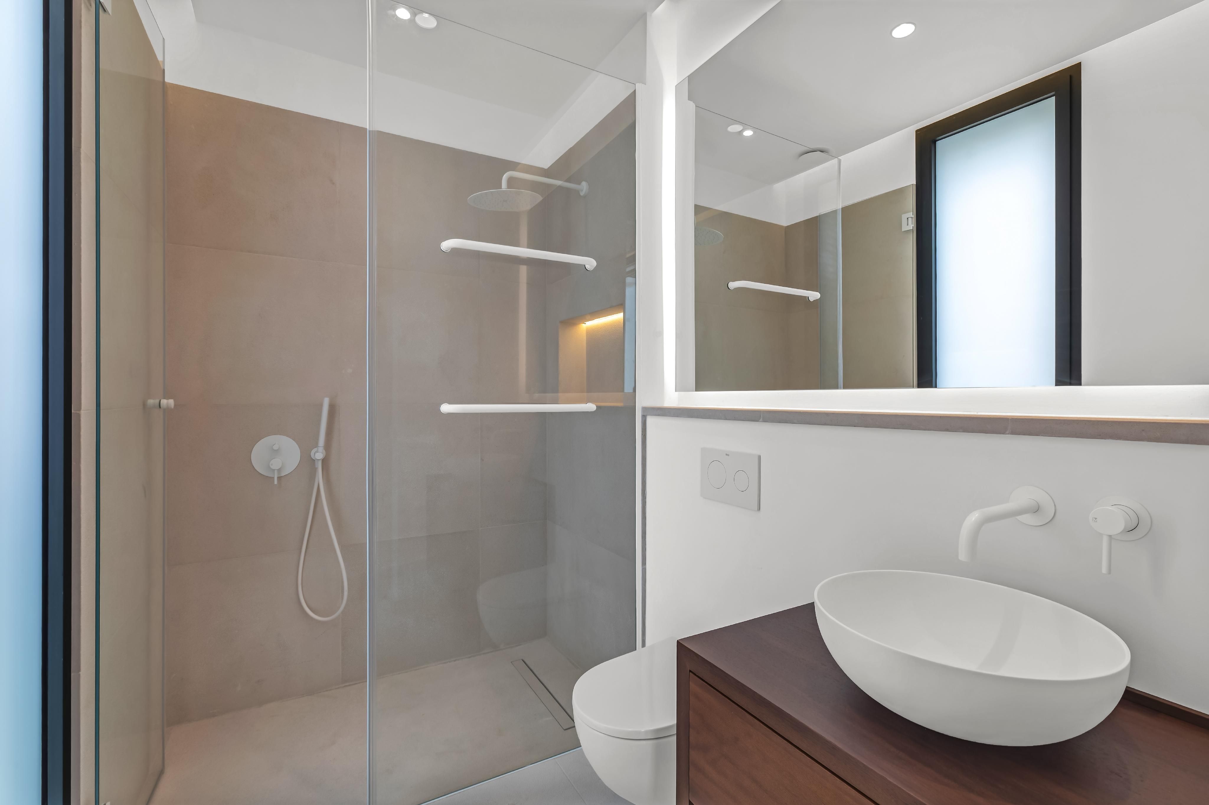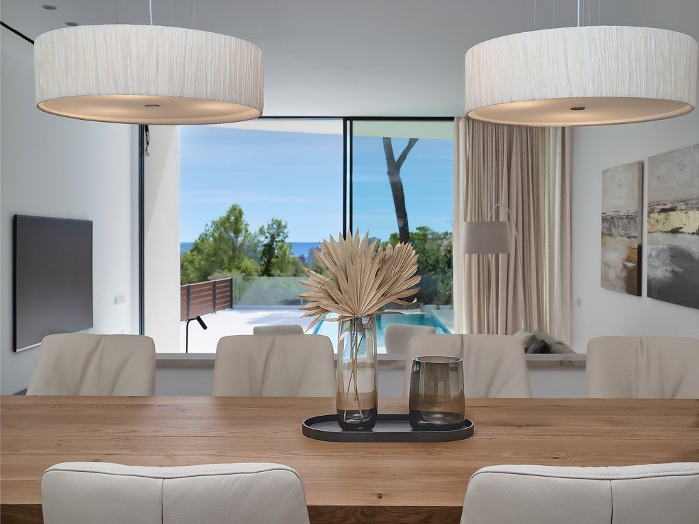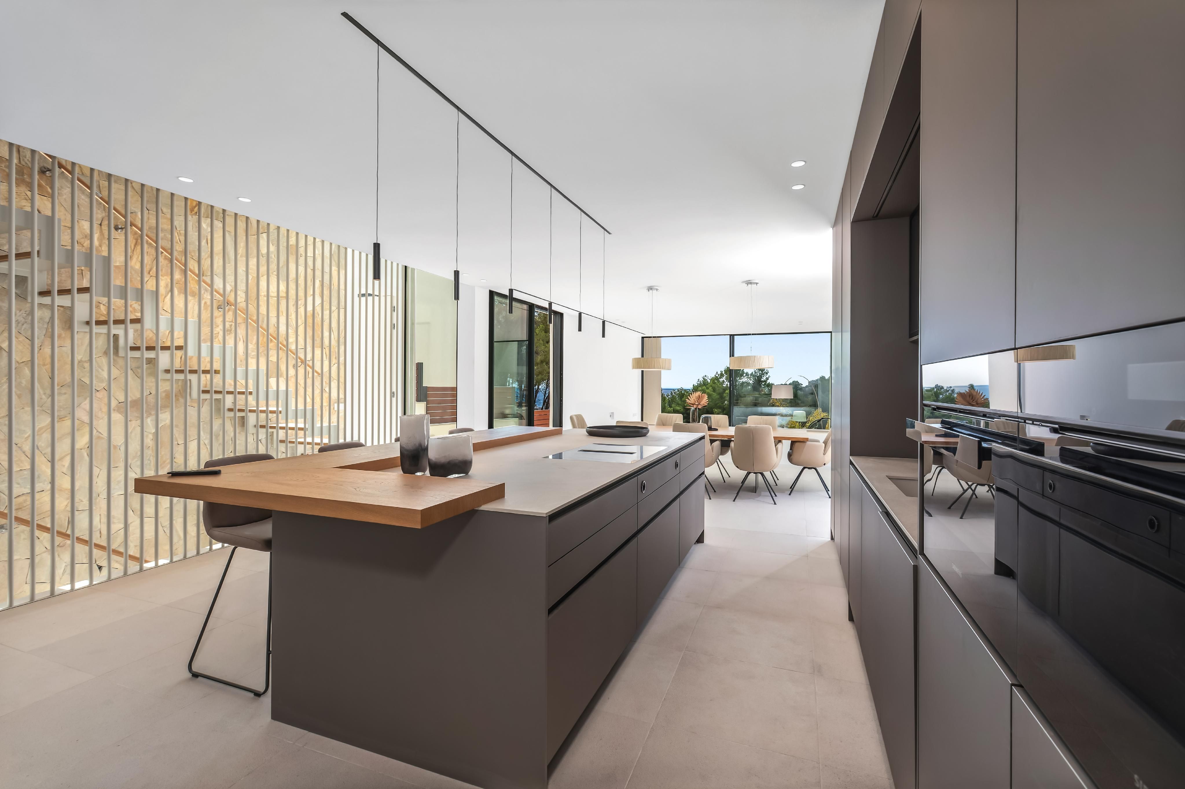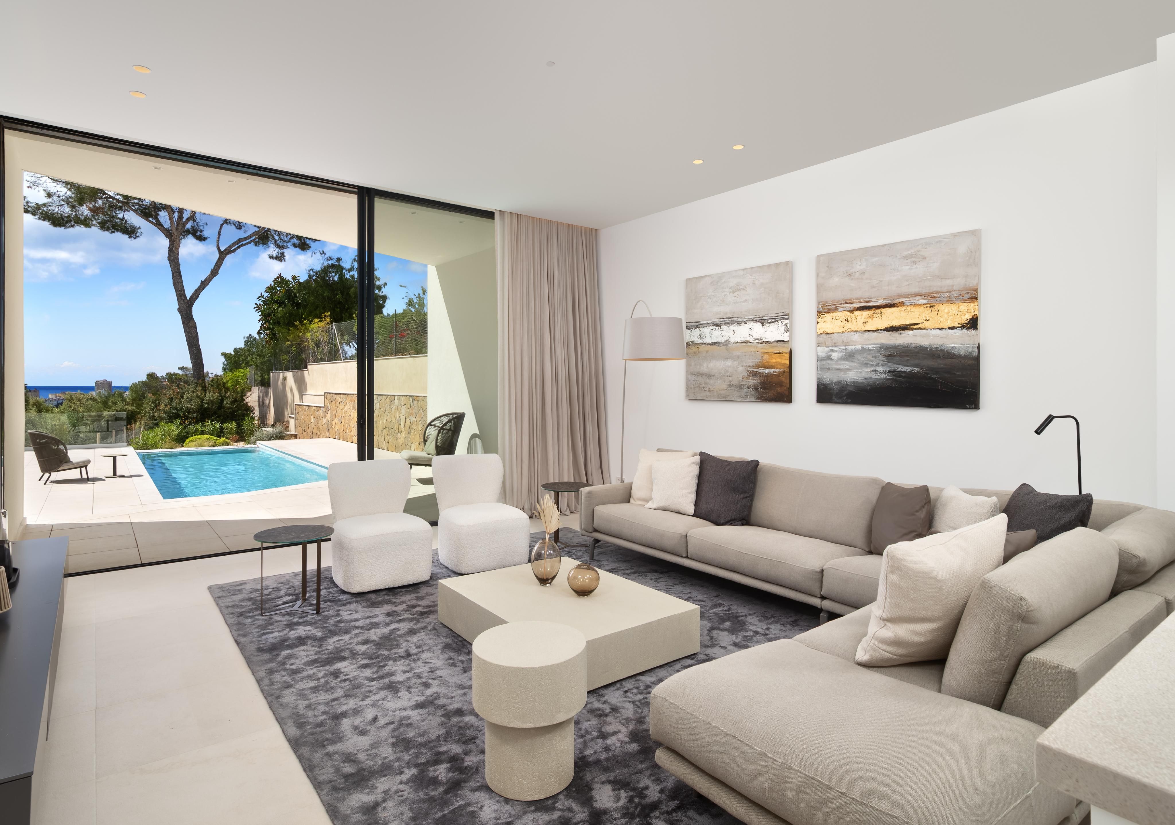 Esta villa con 4 dormitorios y 4 baños ofrece, además de una bonita vista a la vegetación, también una vista parcial al mar. El corazón de la moderna propiedad es el amplio salón y comedor con cocina integrada, que cuenta con una isla de cocina y una barra de desayuno, desde el cual se tiene acceso a la extensa terraza privada de la piscina. Además, en la planta de estar, junto a la cocina abierta, hay una pequeña cocina secundaria, un aseo de cortesía y uno de los 4 dormitorios dobles con baño en suite. Los otros tres espaciosos dormitorios dobles se encuentran en la planta superior y también cuentan con armarios empotrados y su propio baño en suite. En el sótano hay una lavandería totalmente equipada, un trastero y la técnica de la casa. El diseño moderno y la alta calidad de los acabados —que incluyen cocinas LEICHT con electrodomésticos Miele y Siemens, suelos de piedra natural y parqué de roble, puertas de suelo a techo, aire acondicionado y calefacción por suelo radiante con bomba de calor, domótica KNX y un garaje privado— aseguran un estilo de vida cómodo y de primera categoría. A poca distancia a pie se encuentra el pequeño puerto deportivo de Cala Nova, que ofrece una amplia variedad de actividades acuáticas, así como varias calas de arena, tiendas y restaurantes. Además, en las cercanías hay varias escuelas internacionales, lo que convierte a esta propiedad en el hogar perfecto para familias que desean residir todo el año en Mallorca.