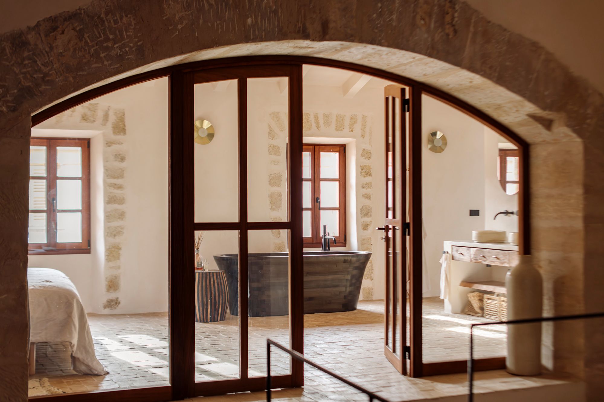 La visite commence par le batiport majorquin, où d'impressionnantes doubles portes ouvrent un espace empreint d'histoire. Au rez-de-chaussée, les sols en pierre d'origine et les murs en pierre rénovés soulignent le caractère local, tandis que les arcs en pierre de Marès restaurés et les hauts plafonds créent une sensation d'espace et de lumière naturelle. À ce niveau se trouve une pièce flexible qui sert actuellement de bureau à domicile et qui a été conçue à l'origine comme une chambre à coucher avec salle de bain en suite.