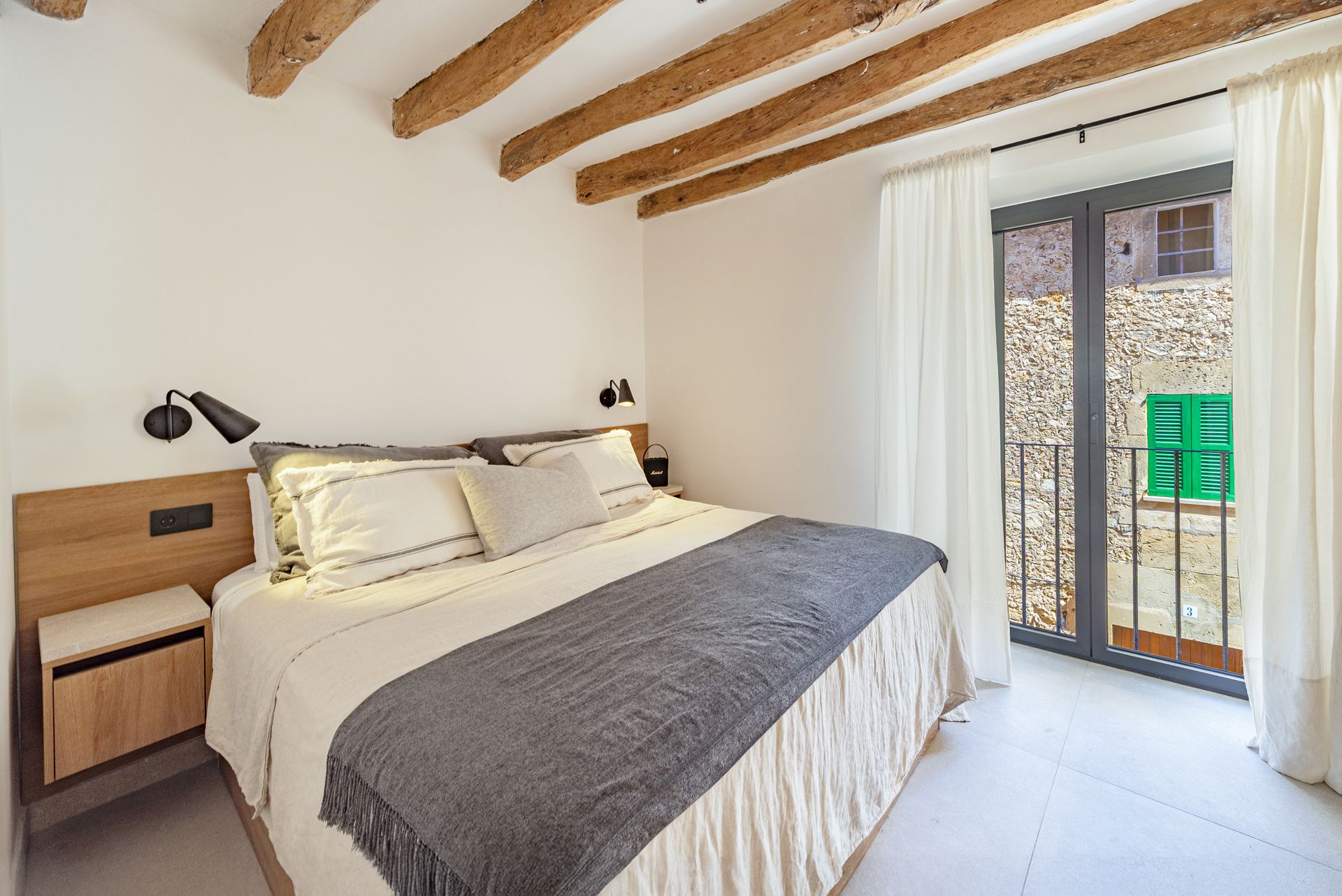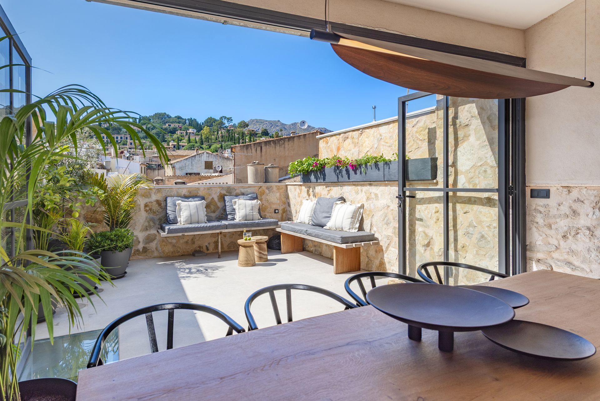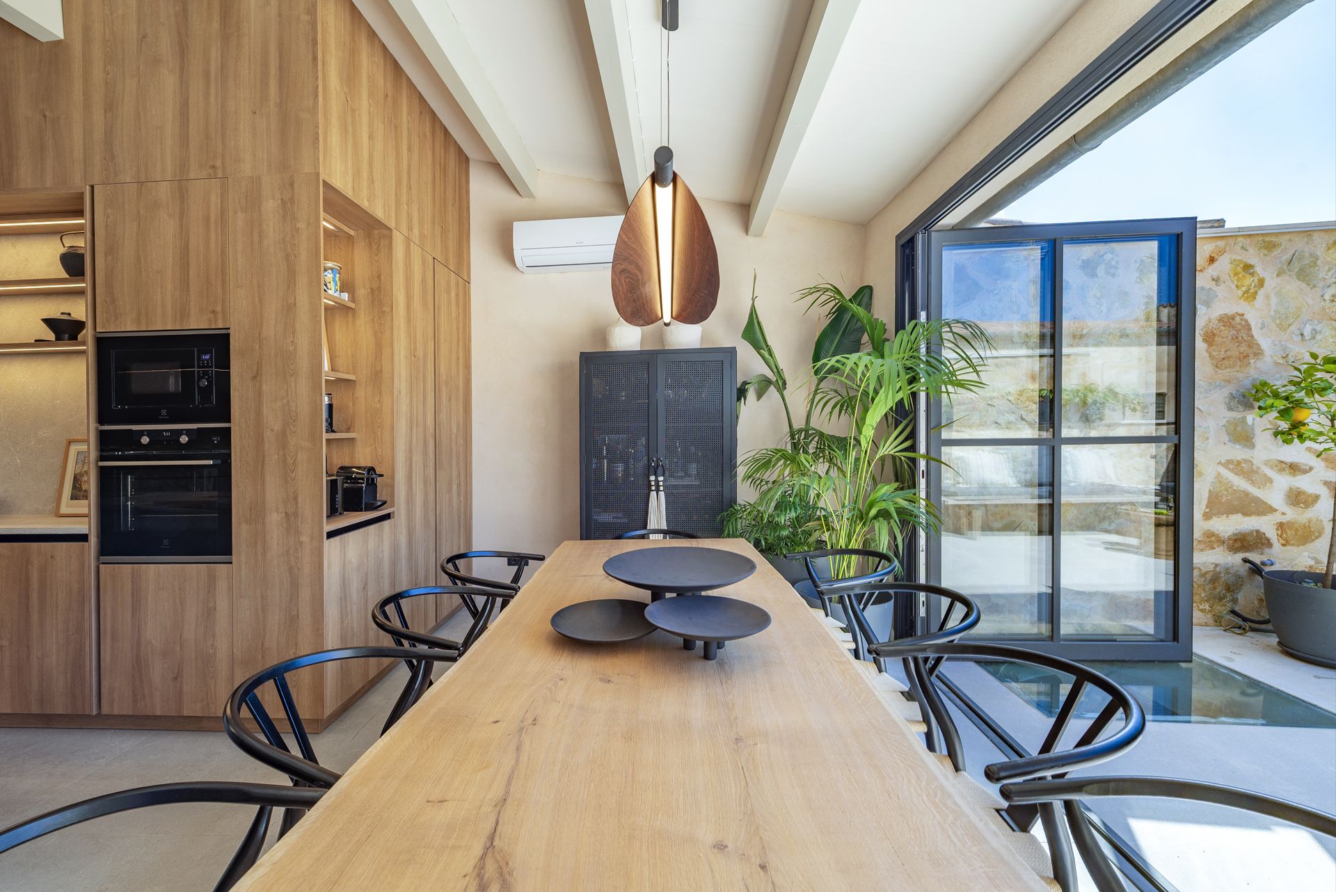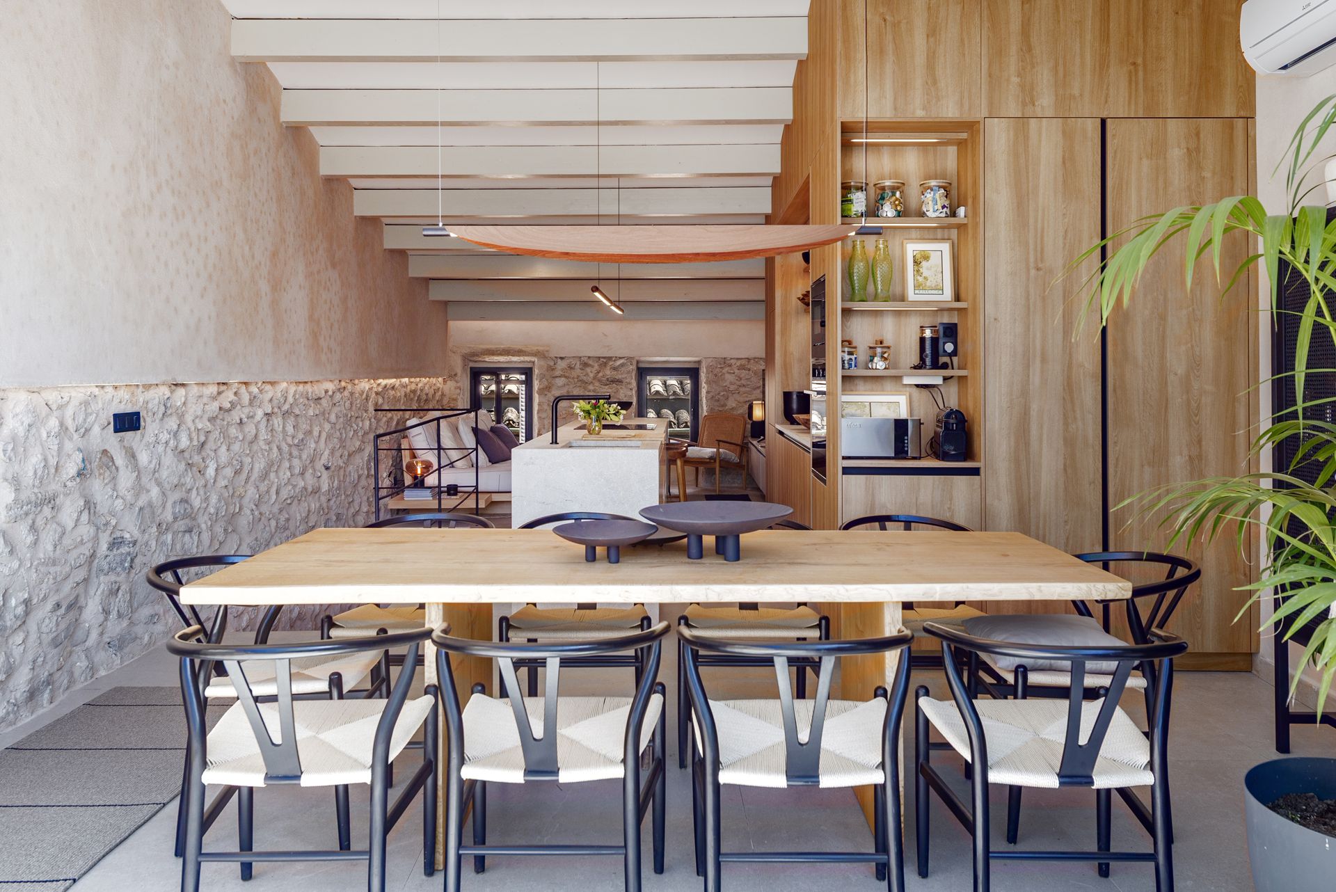 La décoration combine des lignes épurées et harmonieuses avec des meubles design et des éléments artisanaux locaux, créant une ambiance chaleureuse, équilibrée et avec sa propre personnalité.