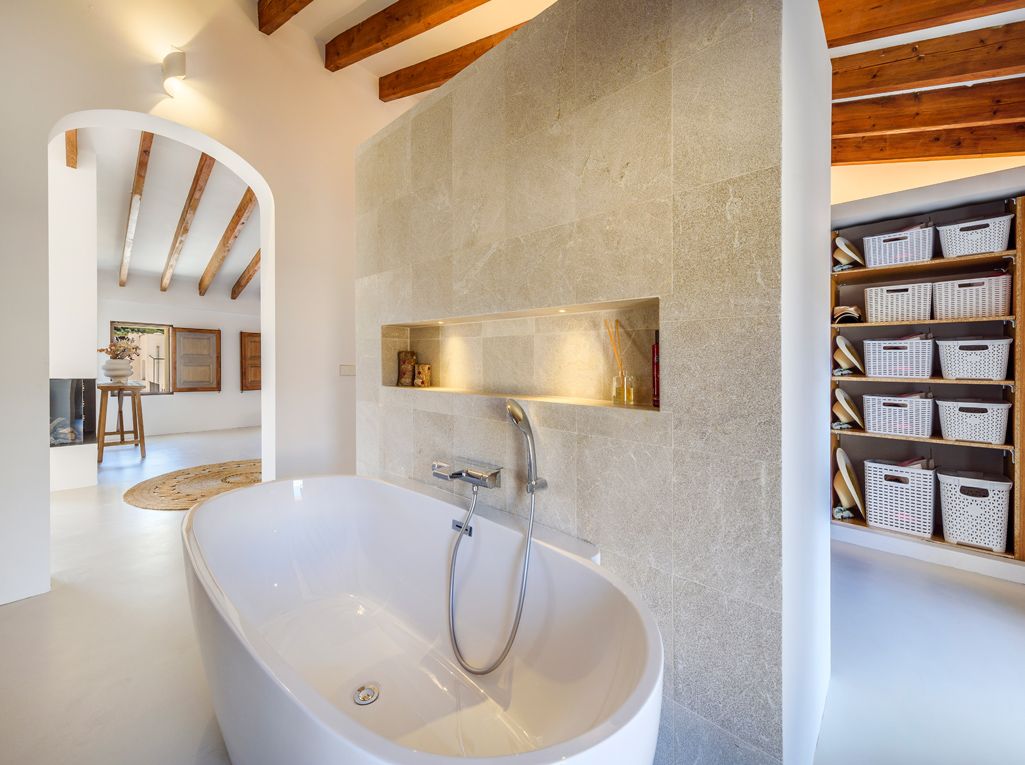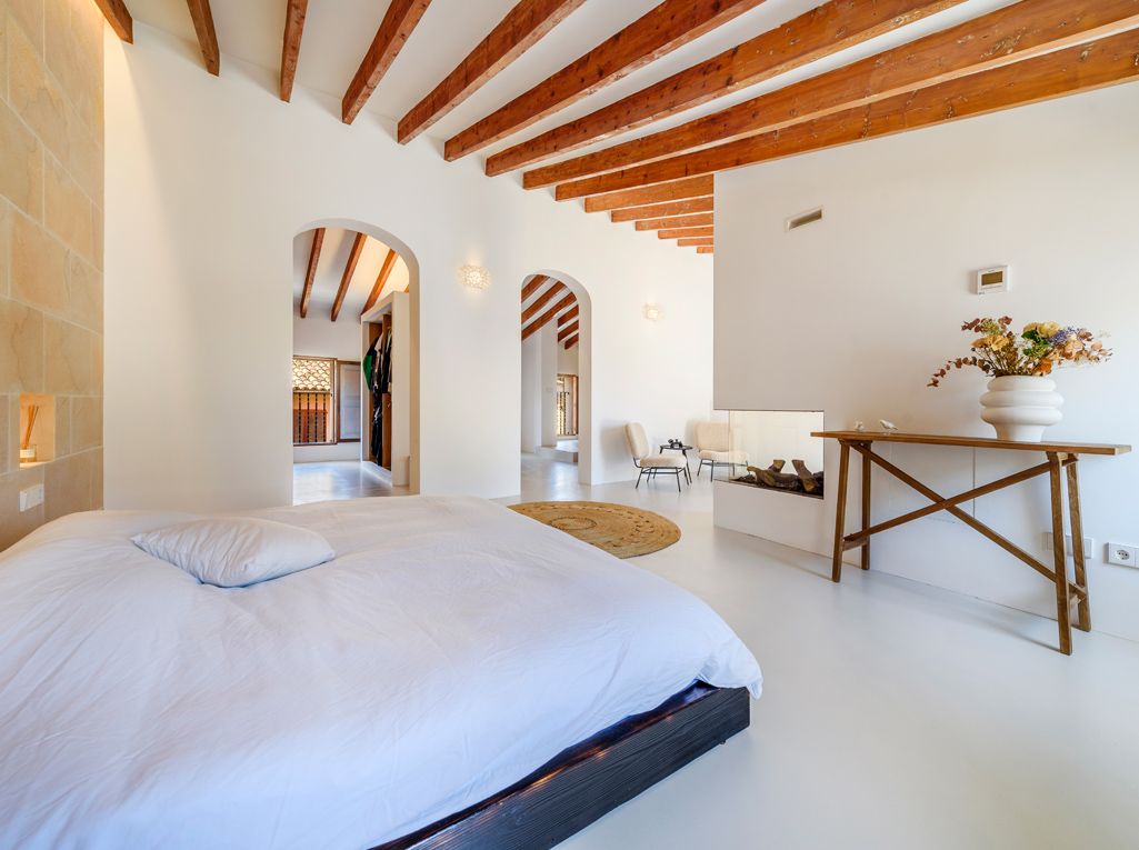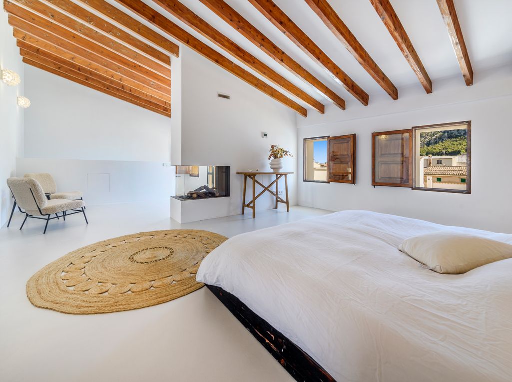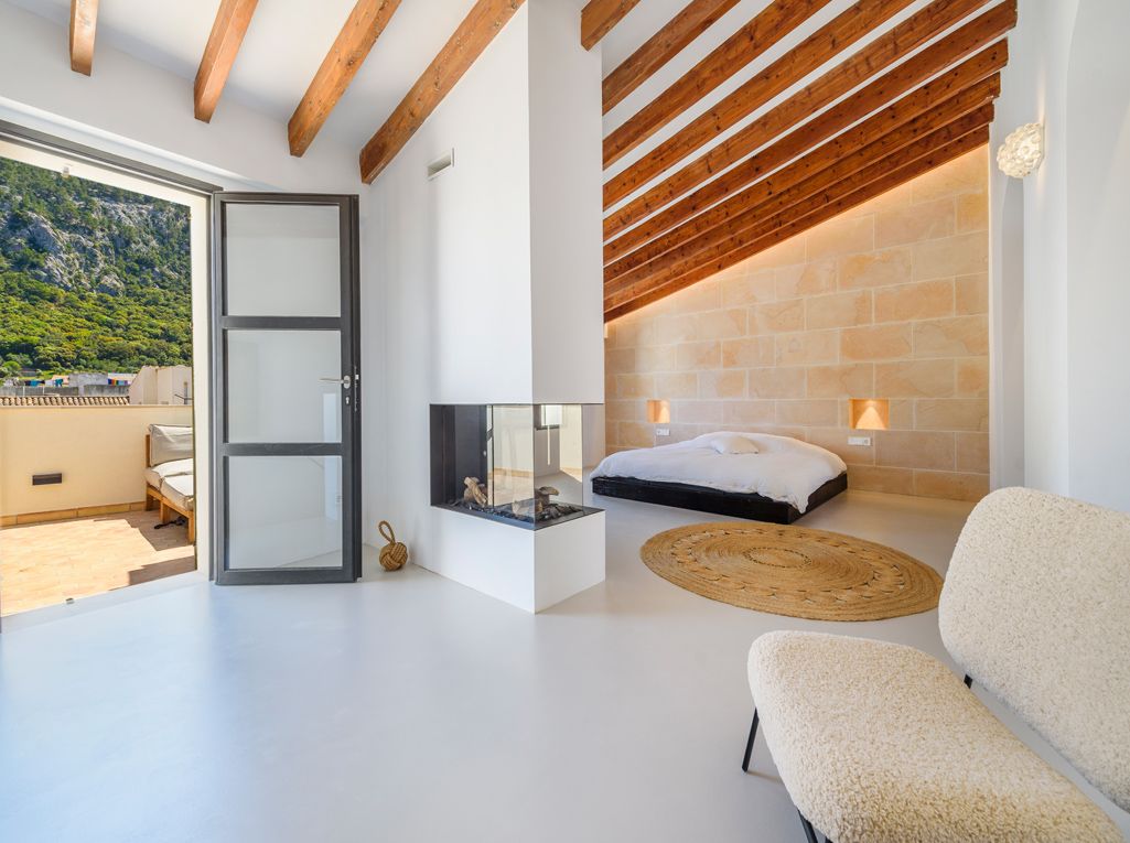 Dernier étage : Une superbe suite parentale avec dressing, salle de bain en suite (baignoire îlot et douche à l’italienne), salon privé avec cheminée et terrasse panoramique sur les toits de Pollensa.