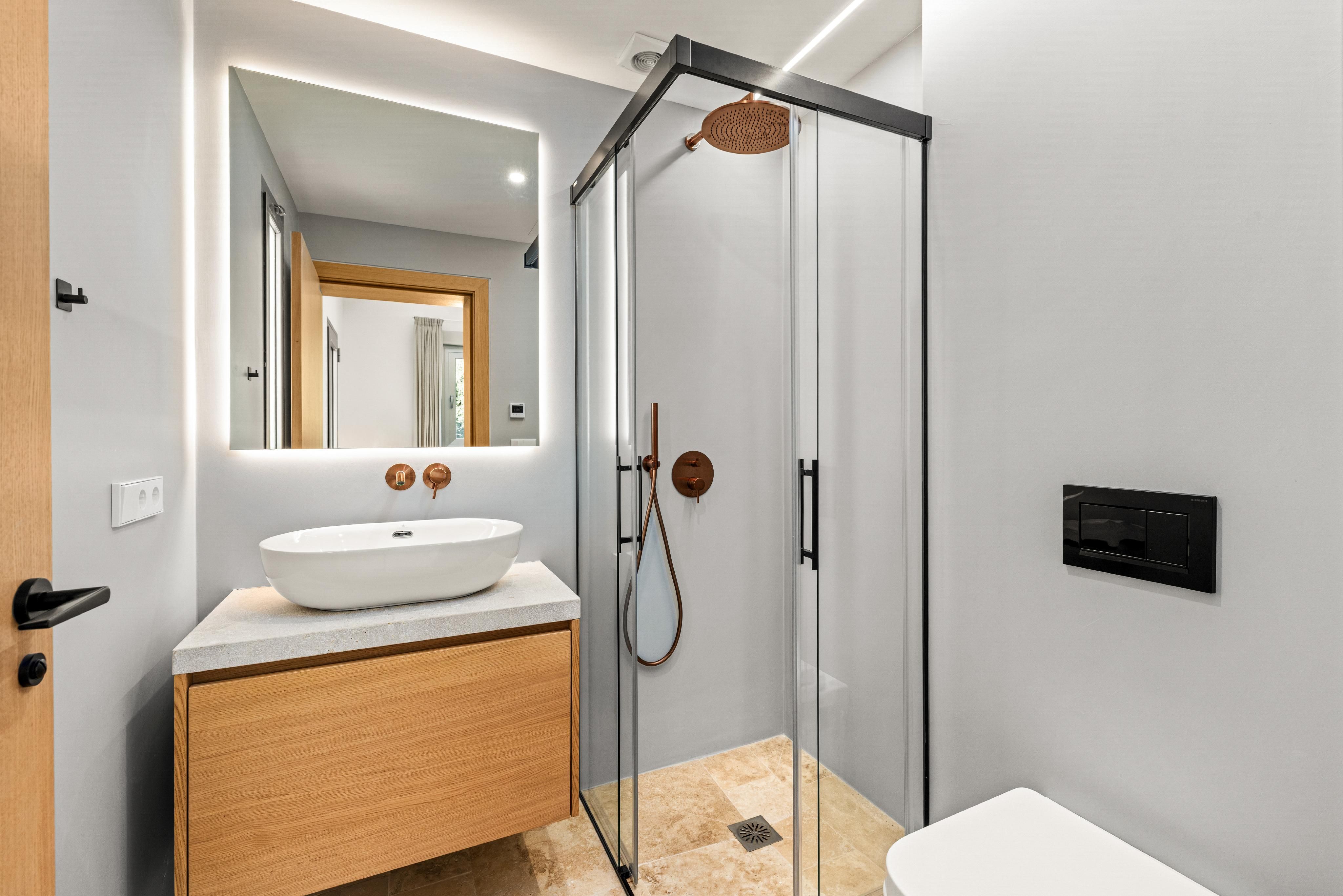 une surface habitable d'environ 547 m2. Le niveau d'habitation principal, au niveau du jardin et de la piscine, se répartit entre un salon spacieux, une salle à manger, une cuisine entièrement équipée et des toilettes pour invités, ainsi qu'une buanderie et une chambre d'amis. À l'étage supérieur se trouve la chambre principale avec dressing et salle de bains en suite.