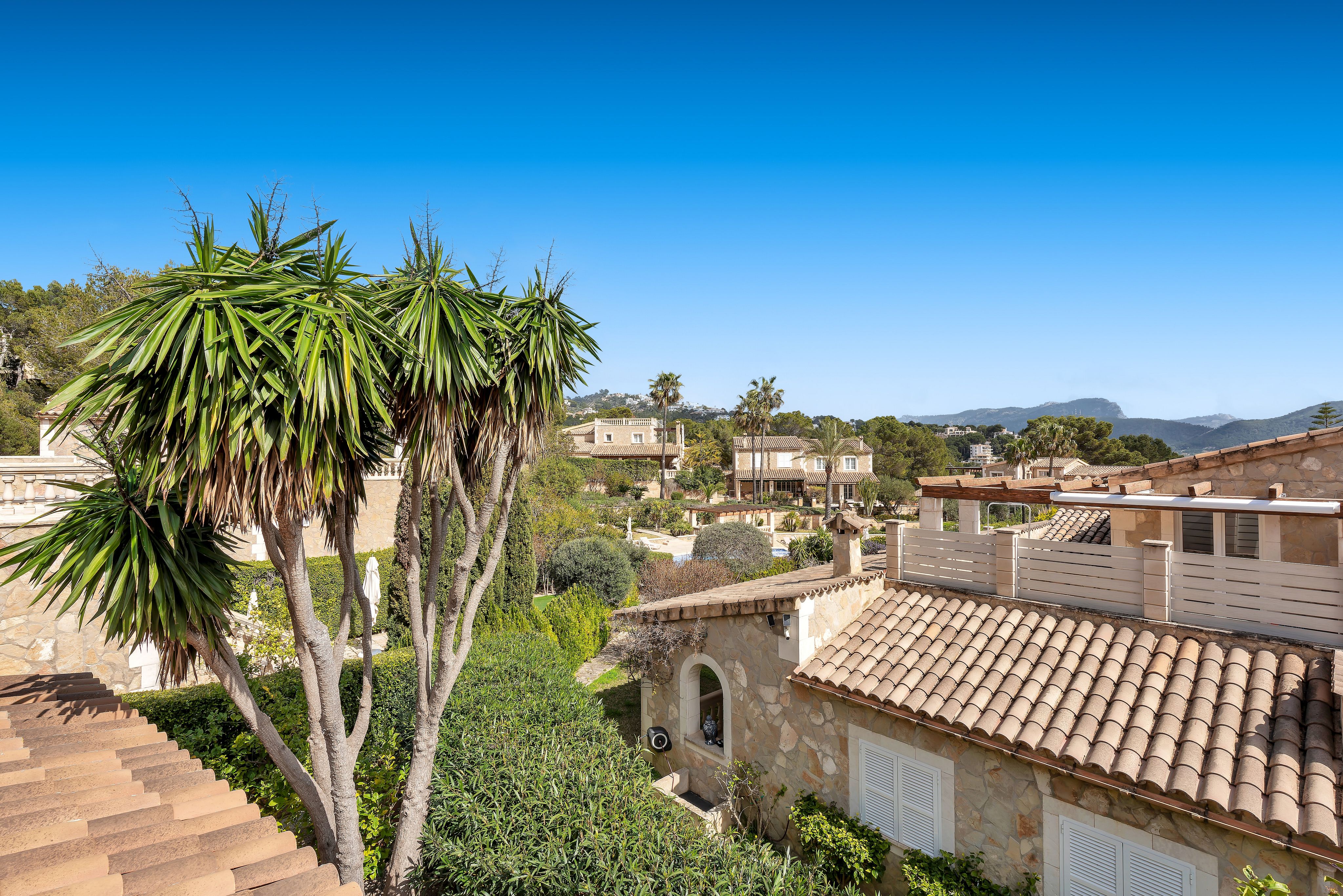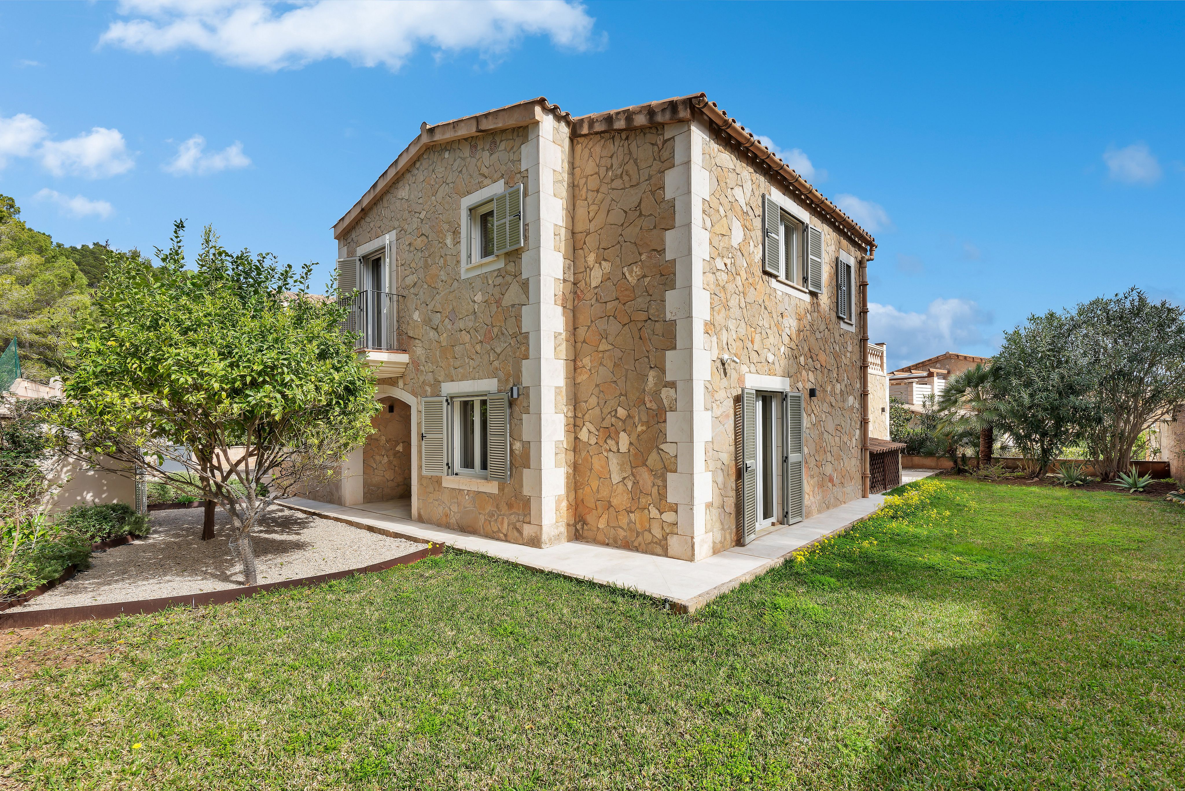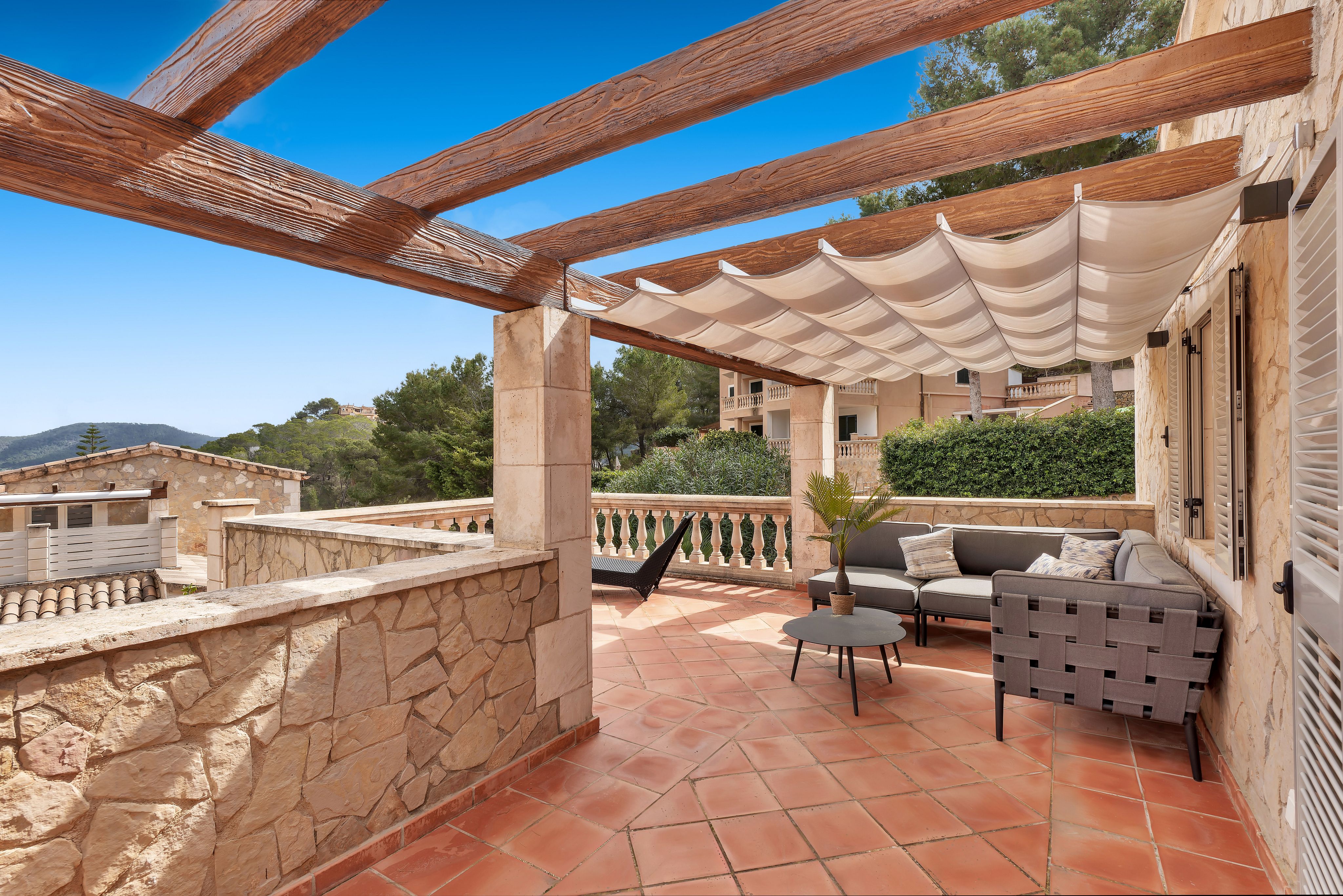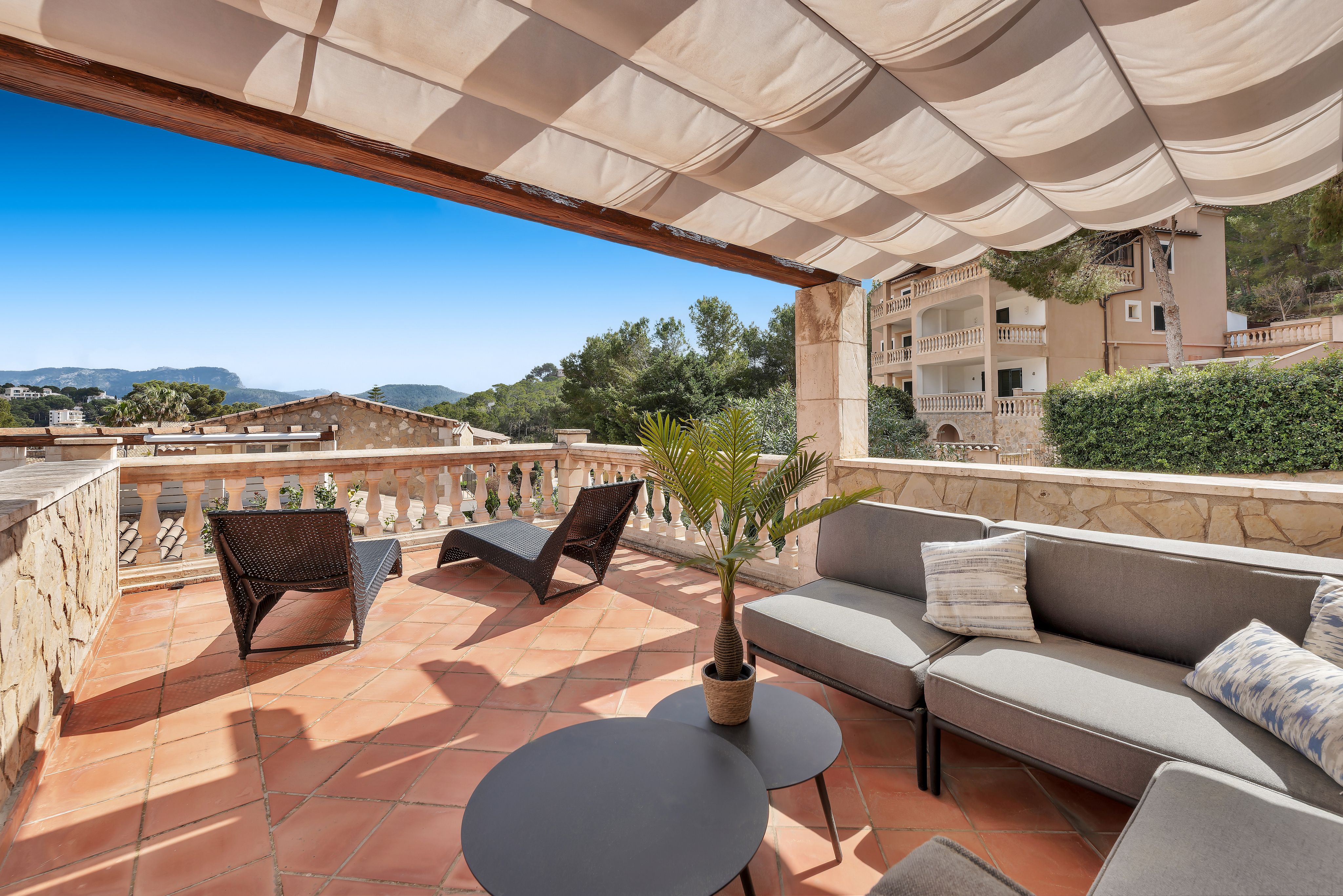 Cette confortable villa avec jardin privé, entièrement rénovée en 2020, est située dans un petit complexe résidentiel très bien entretenu avec une très grande piscine commune. Le complexe se trouve à proximité du club nautique et de la promenade du port de Puerto Andratx. Le jardin privé bien entretenu, les grandes terrasses couvertes et découvertes ainsi qu'un vaste espace piscine invitent à se détendre en plein air. Il s'agit d'une propriété de vacances idéale ! La répartition est la suivante : Au rez-de-chaussée se trouve un très grand salon/salle à manger avec sortie sur la terrasse avec BBQ, une cuisine entièrement équipée qui jouxte le salon, deux chambres à coucher, une salle de bains d'invités ainsi qu'une salle de bains entièrement équipée. À l'étage supérieur se trouvent deux chambres à coucher, un dressing et deux salles de bains. De là, on accède également à la grande terrasse sur le toit. Les autres extras incluent : Parking, climatisation chaud/froid et chauffage au sol dans toute la villa.