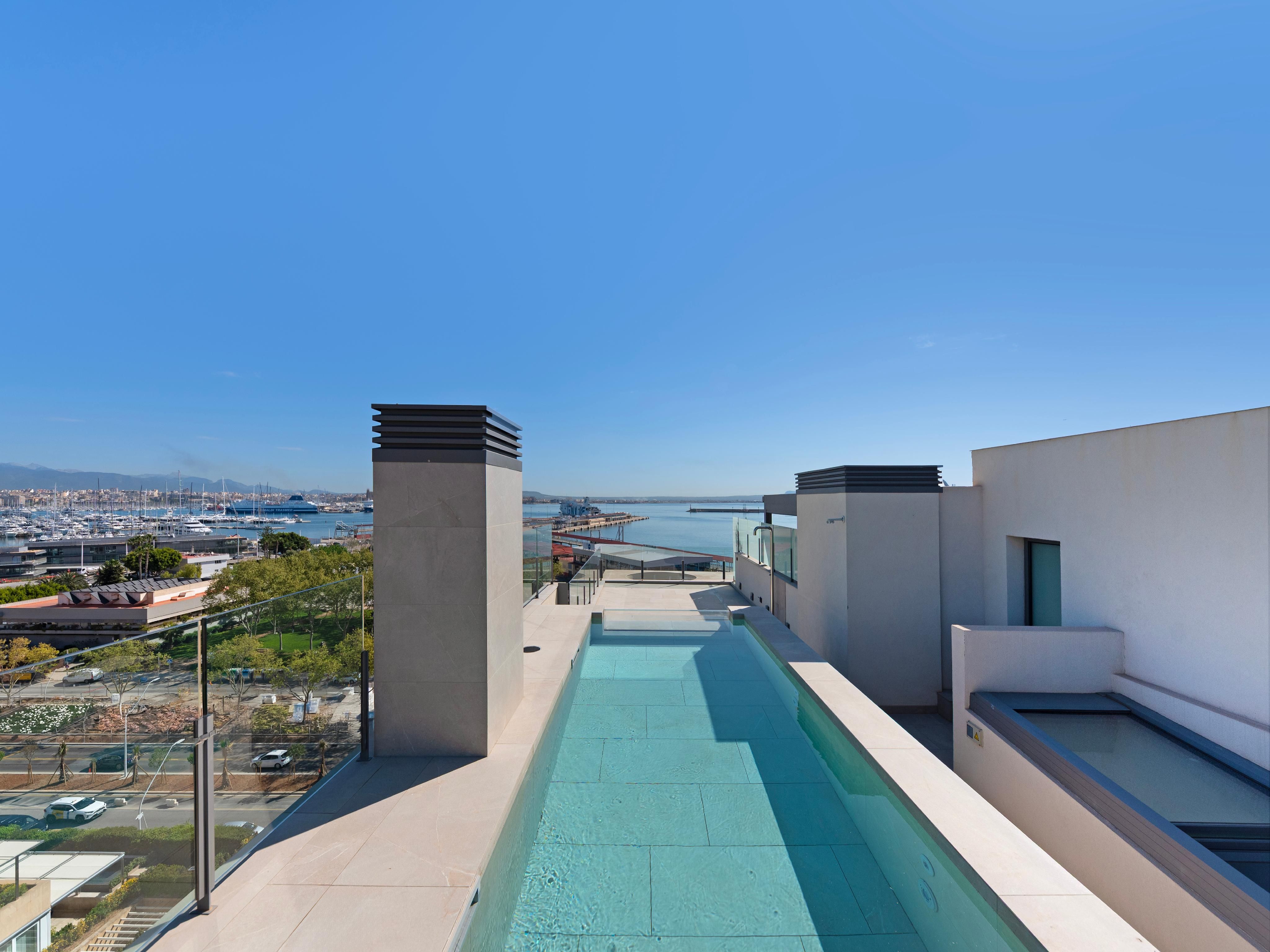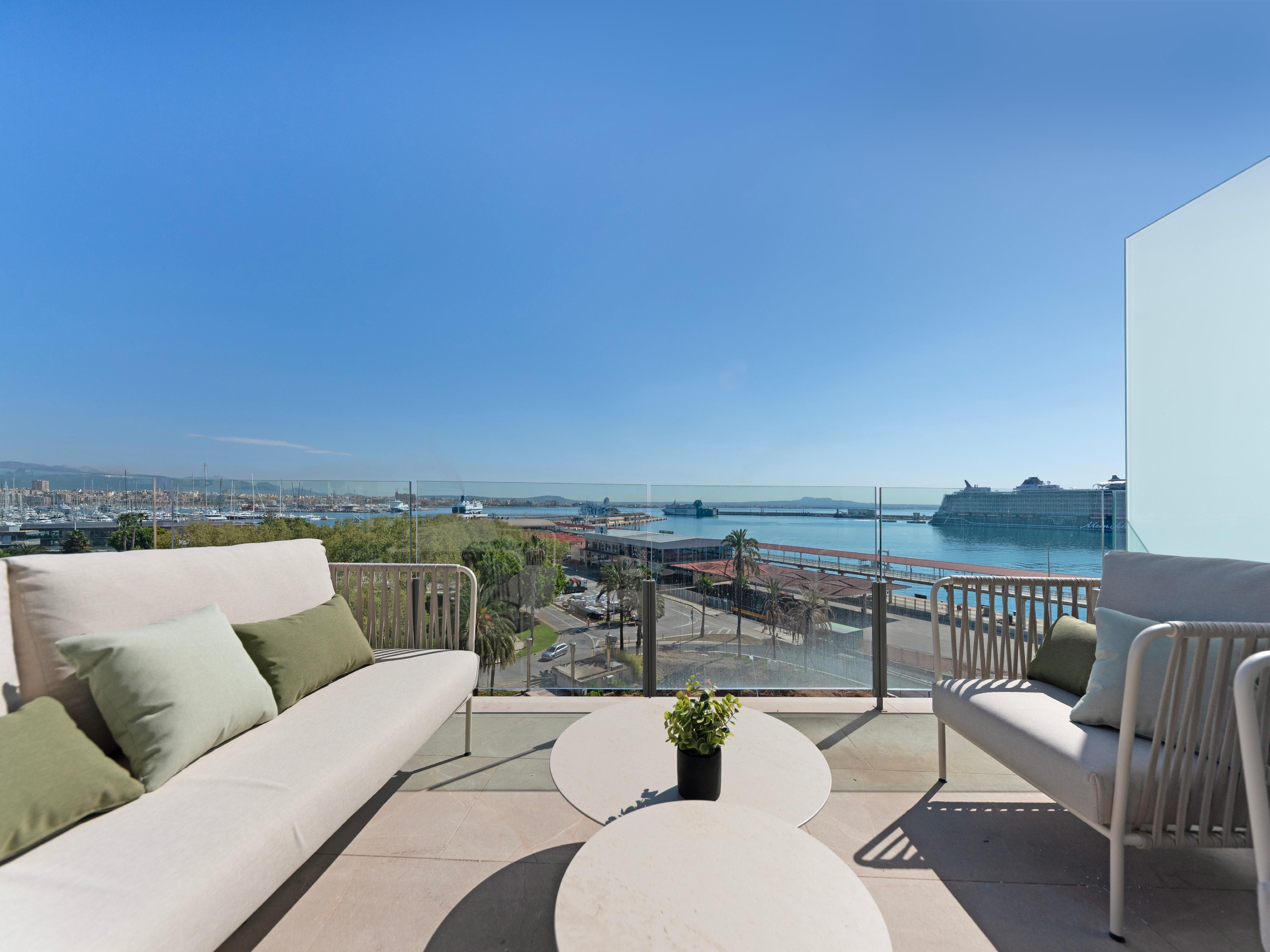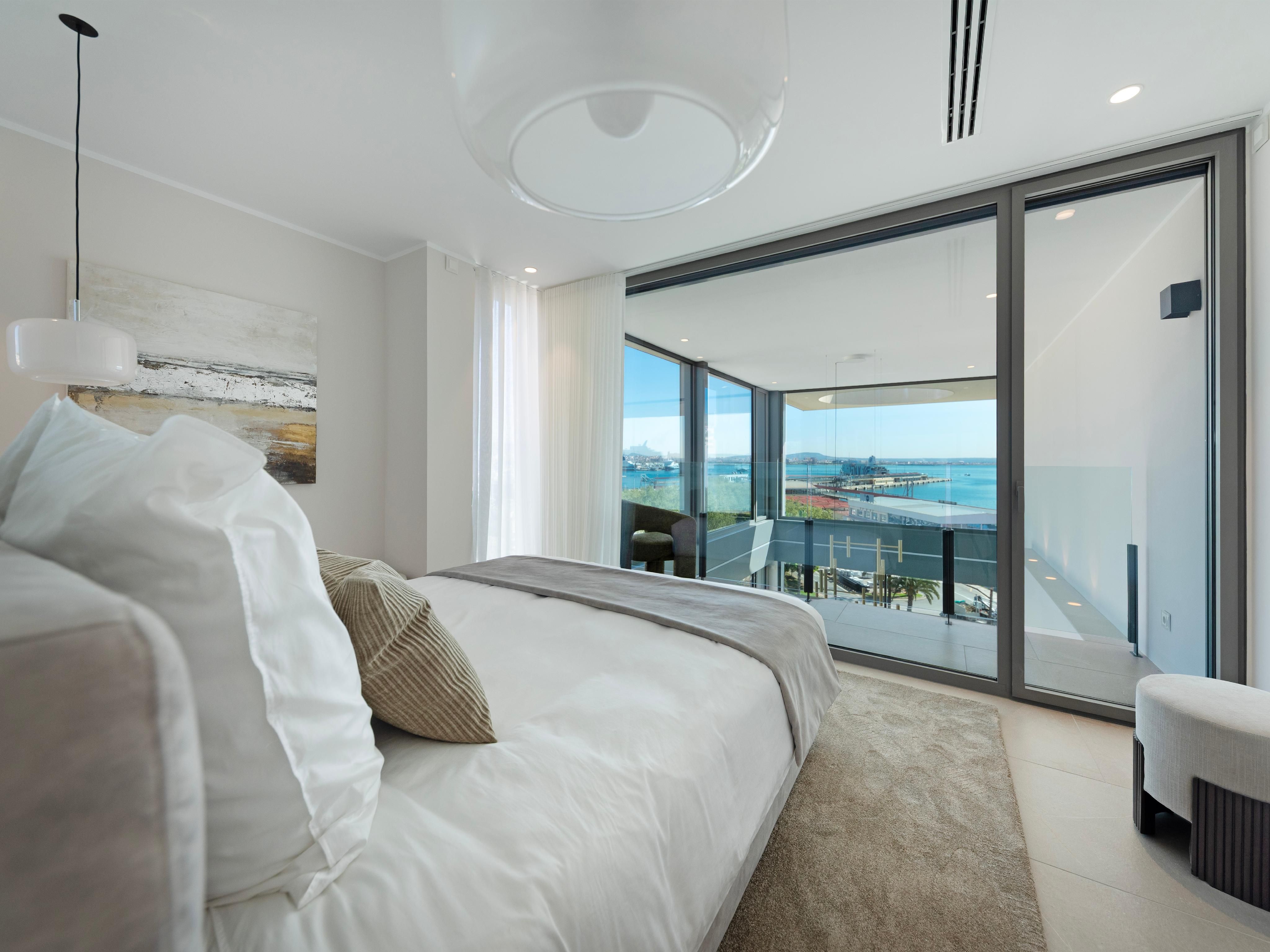 Questo complesso di appartamenti di lusso con 15 esclusivi appartamenti vista mare è stato appena completato nella prima linea di mare del famoso Paseo Marítimo di Palma. Oltre a un design moderno e a viste fantastiche, offre una grande piscina all'aperto con terrazza solarium e un'area benessere con palestra, sauna e piscina coperta. Inoltre, dispone di ascensori e di un grande garage sotterraneo su 3 livelli con ampi posti auto, stazioni di ricarica per auto elettriche e ripostigli. Qui vivrete in un comfort moderno proprio accanto al famoso e lussuoso Club de Mar, che accoglie ogni anno alcuni dei più grandi superyacht del mondo e che attualmente è in fase di completa modernizzazione e ristrutturazione. Il centro di Palma è raggiungibile in pochi minuti e l'aeroporto è a soli 10 minuti di auto. Il moderno edificio si distingue per la sua forma asimmetrica, la facciata in vetro di alta qualità e lo speciale rivestimento in pietra. I 12 appartamenti e i 3 attici duplex sono tutti dotati di soggiorno e sala da pranzo a pianta aperta, cucina integrata con isola di cottura e ampie terrazze. Grazie alle ampie finestre a tutta altezza, tutti gli appartamenti sono luminosi e inondati di luce. Gli spaziosi attici duplex, situati al 5° e 6° piano, offrono una vista mozzafiato sul mare, sulla città con la sua famosa cattedrale e sul pittoresco paesaggio montano, oltre a una terrazza privata sul tetto con piscina. L'arredamento di alta qualità degli appartamenti comprende: Cucina di design Nolte con elettrodomestici da incasso Siemens e piano cottura Bora con aspiratore integrato, armadi a muro, riscaldamento a pavimento, aria condizionata e sistema smart-home KNX.