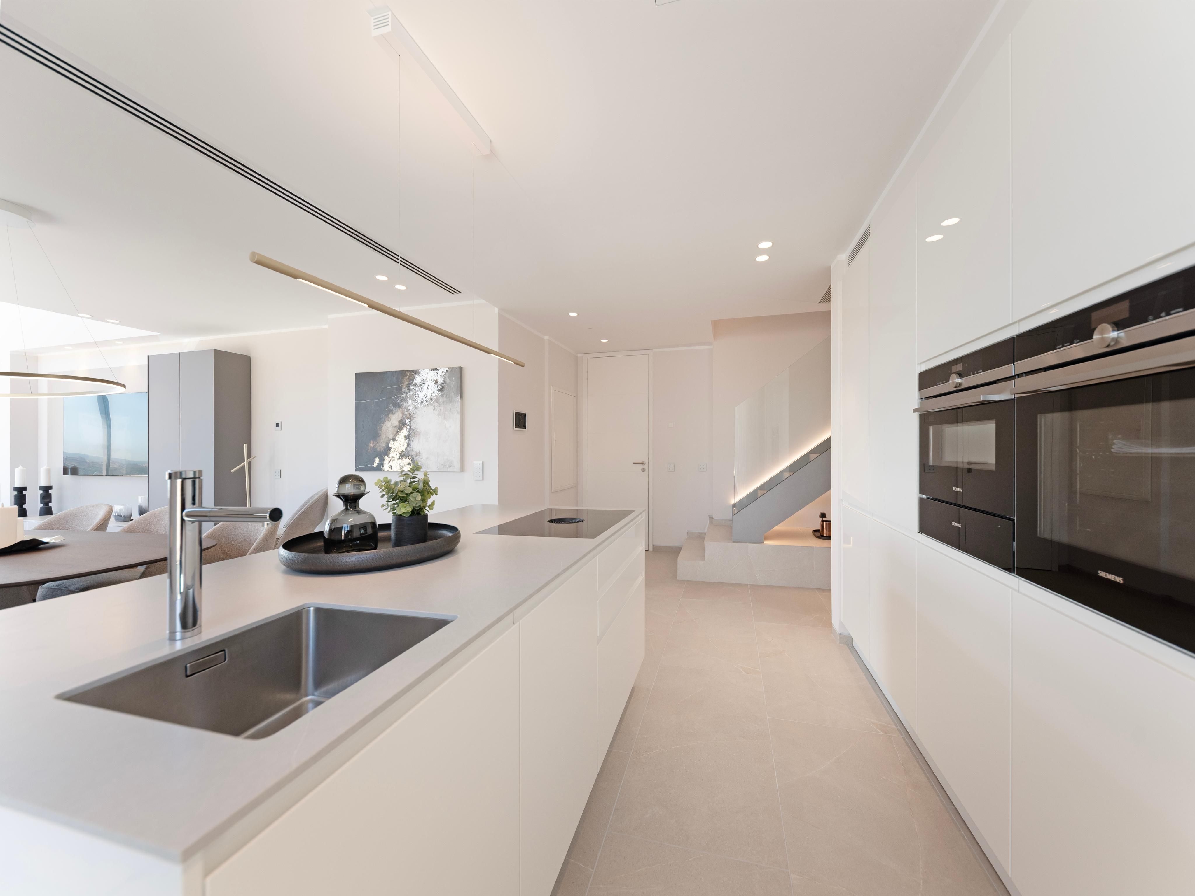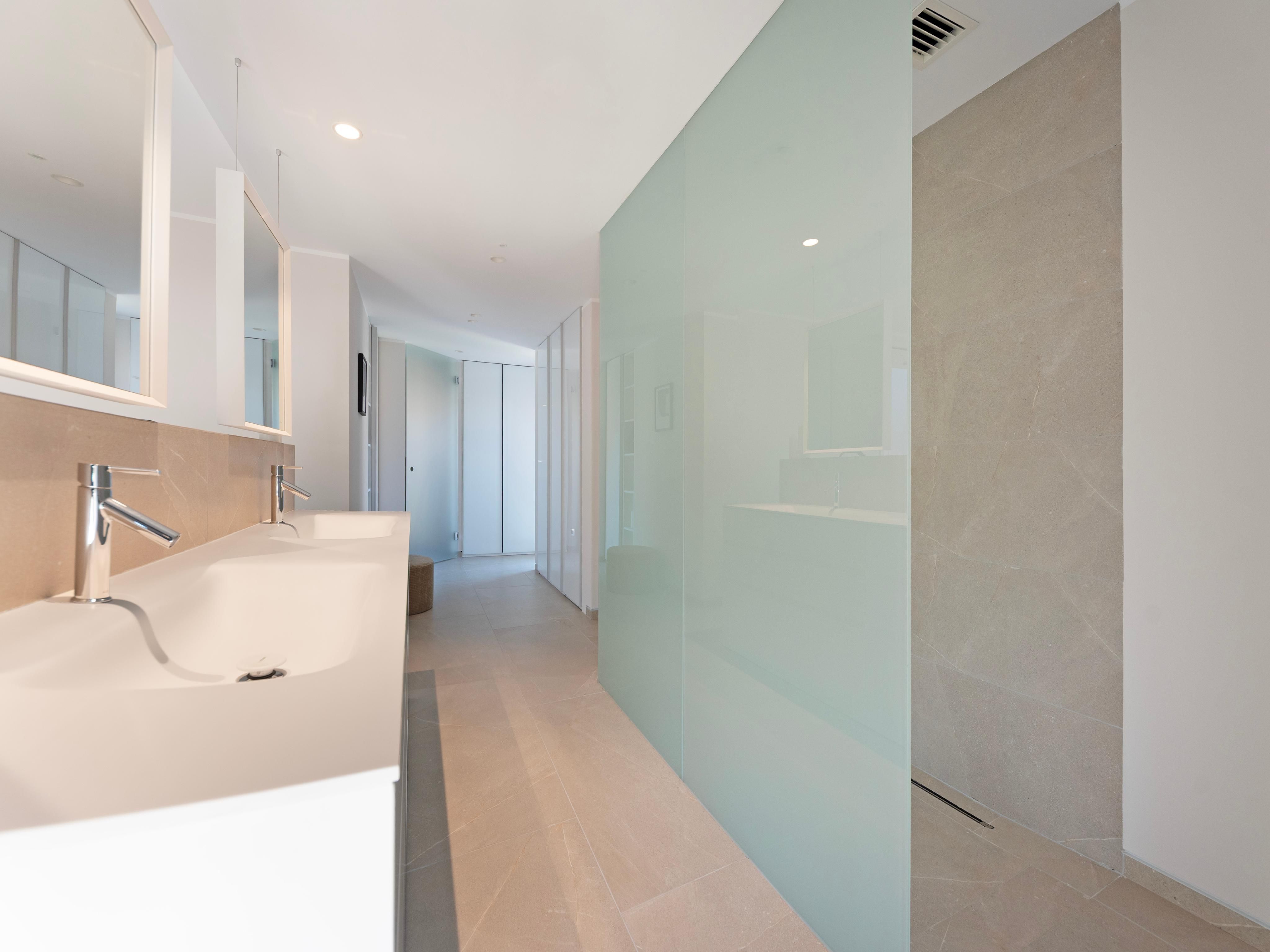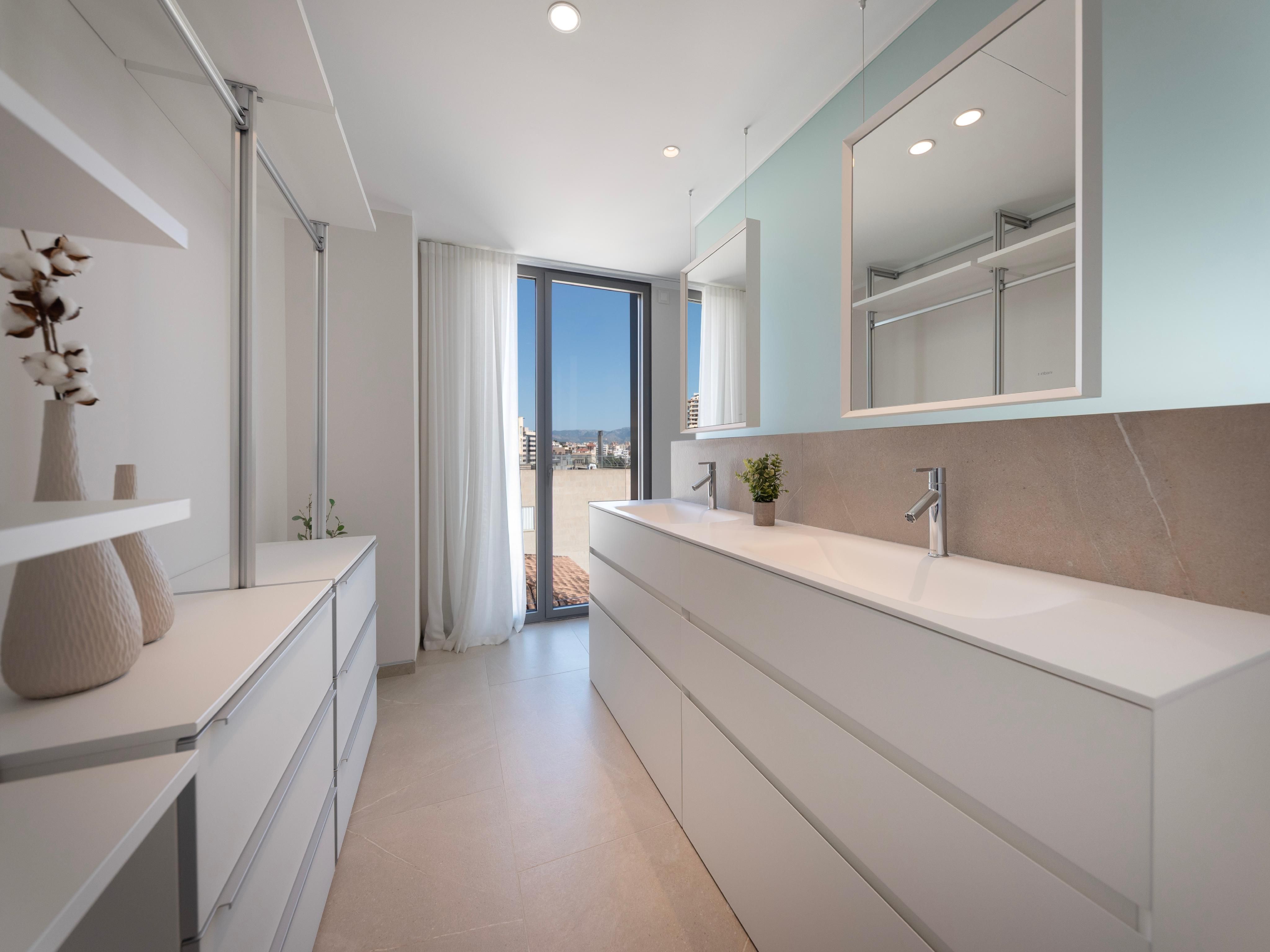 Questo complesso di appartamenti di lusso con 15 esclusivi appartamenti vista mare è stato appena completato nella prima linea di mare del famoso Paseo Marítimo di Palma. Oltre a un design moderno e a viste fantastiche, offre una grande piscina all'aperto con terrazza solarium e un'area benessere con palestra, sauna e piscina coperta. Inoltre, dispone di ascensori e di un grande garage sotterraneo su 3 livelli con ampi posti auto, stazioni di ricarica per auto elettriche e ripostigli. Qui vivrete in un comfort moderno proprio accanto al famoso e lussuoso Club de Mar, che accoglie ogni anno alcuni dei più grandi superyacht del mondo e che attualmente è in fase di completa modernizzazione e ristrutturazione. Il centro di Palma è raggiungibile in pochi minuti e l'aeroporto è a soli 10 minuti di auto. Il moderno edificio si distingue per la sua forma asimmetrica, la facciata in vetro di alta qualità e lo speciale rivestimento in pietra. I 12 appartamenti e i 3 attici duplex sono tutti dotati di soggiorno e sala da pranzo a pianta aperta, cucina integrata con isola di cottura e ampie terrazze. Grazie alle ampie finestre a tutta altezza, tutti gli appartamenti sono luminosi e inondati di luce. Gli spaziosi attici duplex, situati al 5° e 6° piano, offrono una vista mozzafiato sul mare, sulla città con la sua famosa cattedrale e sul pittoresco paesaggio montano, oltre a una terrazza privata sul tetto con piscina. L'arredamento di alta qualità degli appartamenti comprende: Cucina di design Nolte con elettrodomestici da incasso Siemens e piano cottura Bora con aspiratore integrato, armadi a muro, riscaldamento a pavimento, aria condizionata e sistema smart-home KNX.