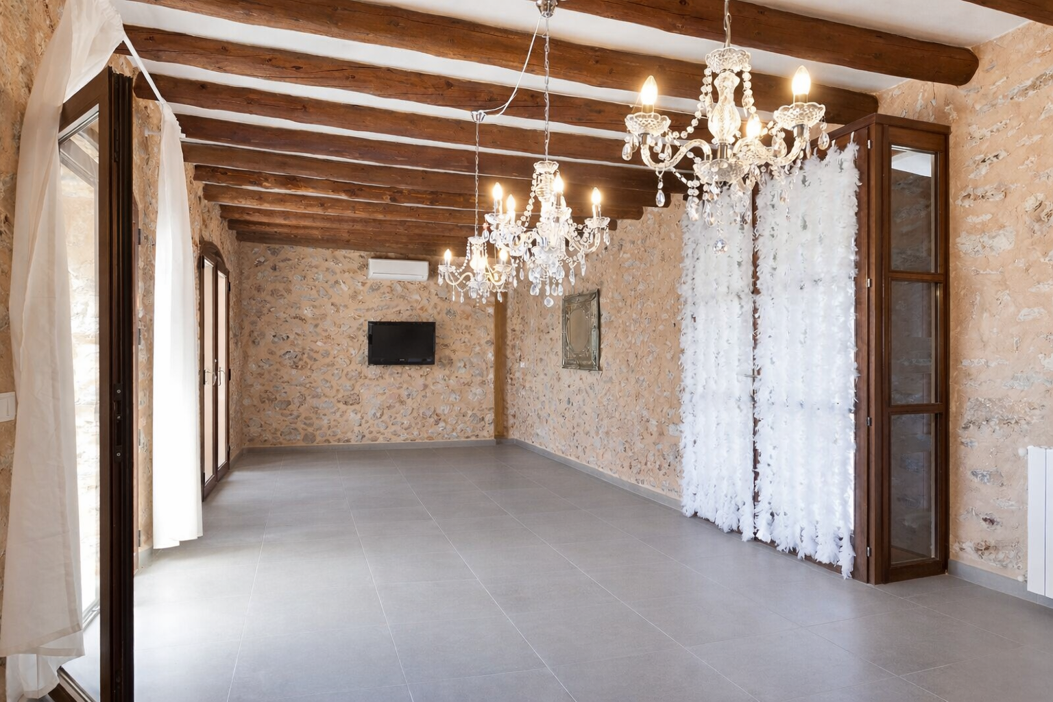 La proprietà offre un'atmosfera calda e invitante, combinando un esterno rustico con i comfort moderni. Muri in pietra a vista, grandi piastrelle, soffitti alti e travi in legno a vista creano un equilibrio armonioso tra il carattere tradizionale di Maiorca e la vita contemporanea.