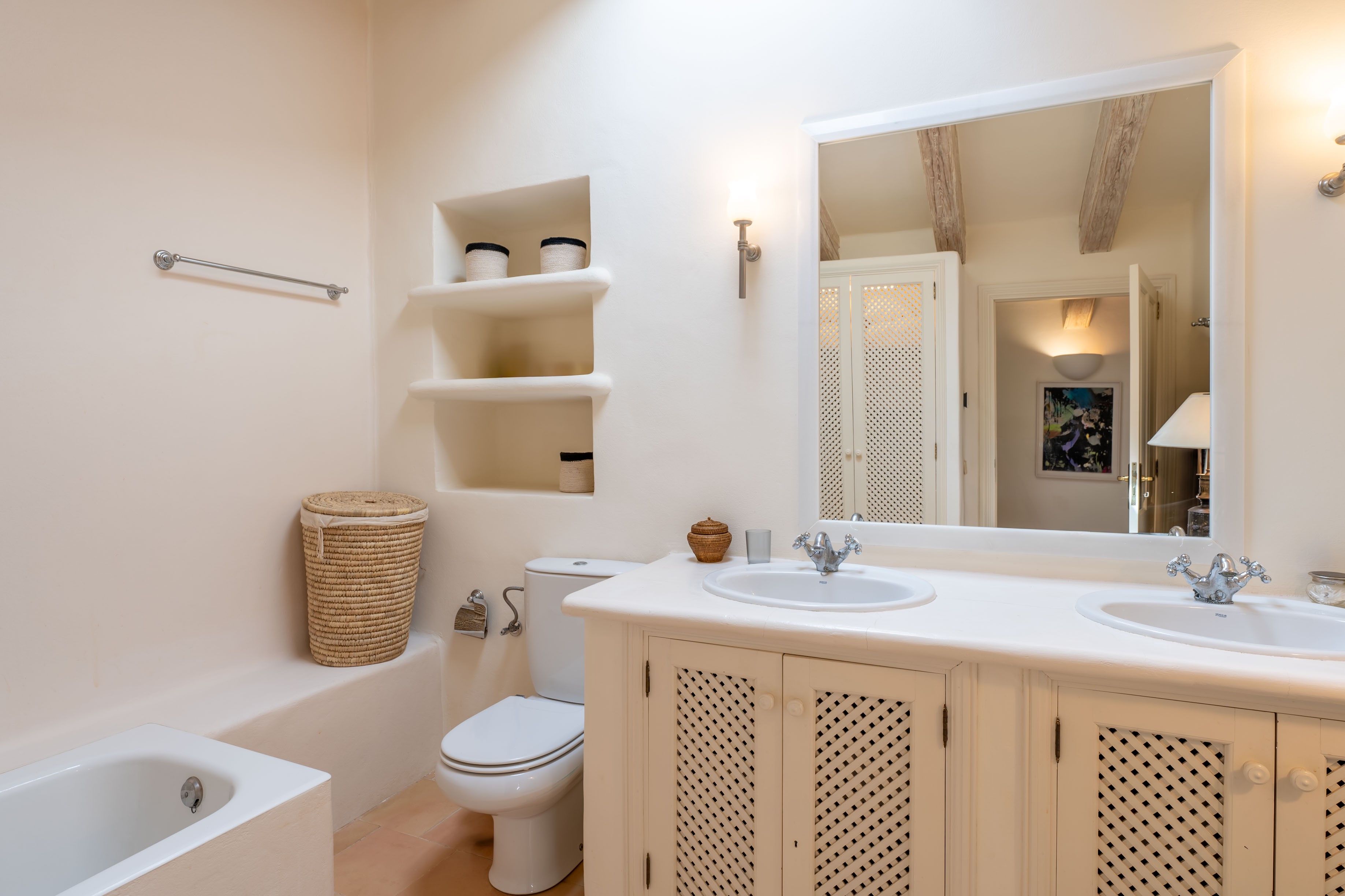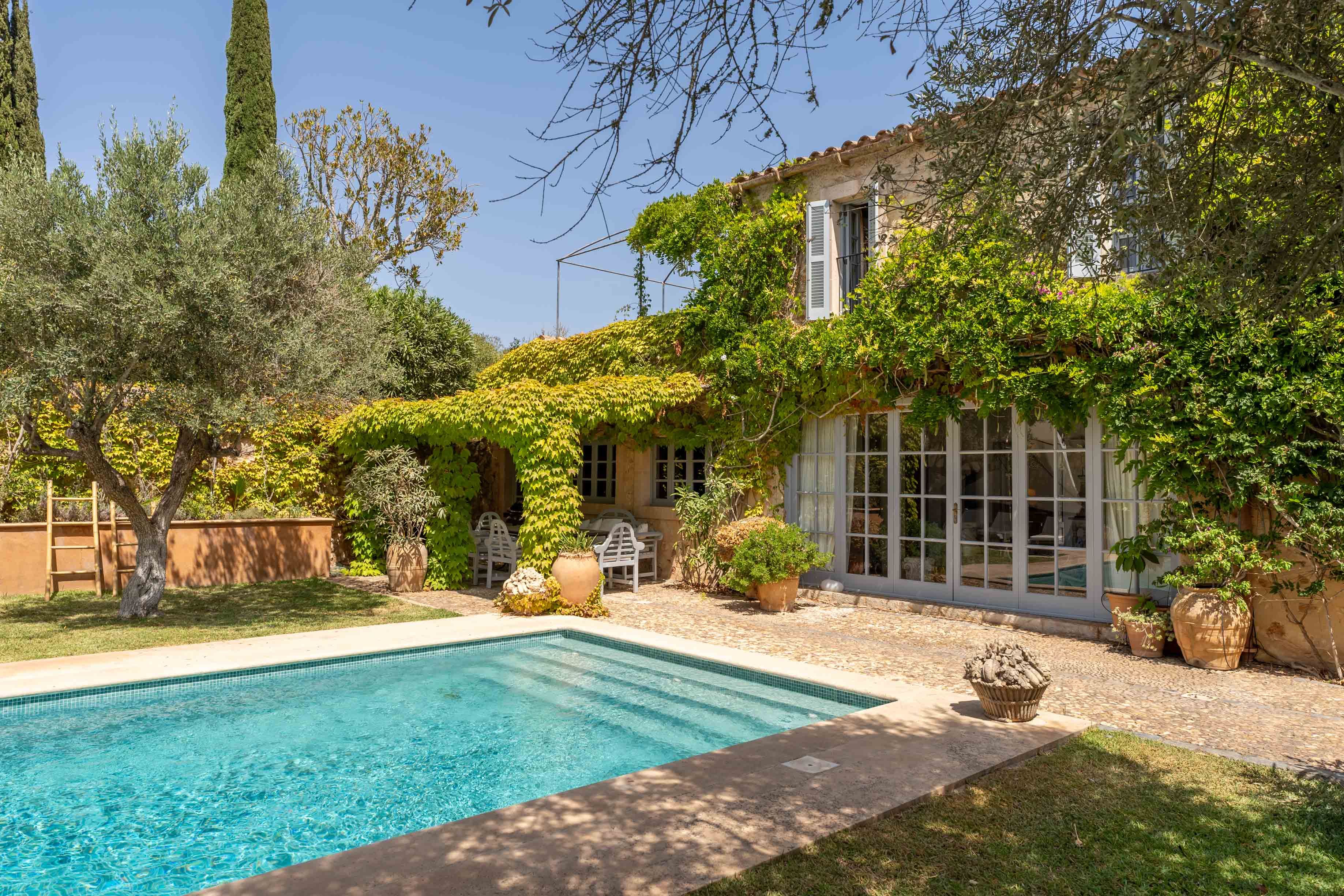 Questa splendida casa di campagna è immersa nelle colline di Es Carritxó su un terreno in stile mediterraneo. Qui potrete sperimentare pace e privacy allo stato puro. Elementi naturali come il legno e la pietra naturale, combinati con un'architettura armoniosa, creano un'atmosfera molto speciale. Si accede alla casa, arredata con cura, attraverso un incantevole patio con una piscina di circa 37 m². La piscina è circondata da romantiche aree salotto parzialmente coperte, da una sala yoga e da una sauna incastonata in una casetta di pietra. Al piano terra si è accolti da un ampio ingresso. Da qui si accede alla graziosa cucina con annessa dispensa, all'accogliente soggiorno con camino e accesso al giardino posteriore e allo studio. Una camera da letto con bagno privato e armadi a muro e un WC per gli ospiti completano questo livello. Al piano superiore si trovano una spaziosa camera da letto principale e un'alcova ludica - entrambe le camere da letto sono dotate di bagno privato e armadi a muro. Un'altra camera da letto di gusto con bagno separato, armadi a muro e accesso alla terrazza soleggiata è disponibile su questo livello. Il riscaldamento a pavimento e l'aria condizionata garantiscono una temperatura gradevole in casa tutto l'anno. All'esterno si trovano anche un ripostiglio e un locale tecnico con lavatrice. Un posto auto coperto offre spazio per due auto e il vialetto ha spazio sufficiente per altre auto. La proprietà è completata dall'impianto fotovoltaico presente sul terreno. La città più vicina, Cas Concos, è raggiungibile in pochi minuti di auto. Questa proprietà ha un fascino molto particolare e una vista lontana fino al mare. L'affitto mensile va da 11.500 a 16.500 €, a seconda della stagione - si prega di informarsi.