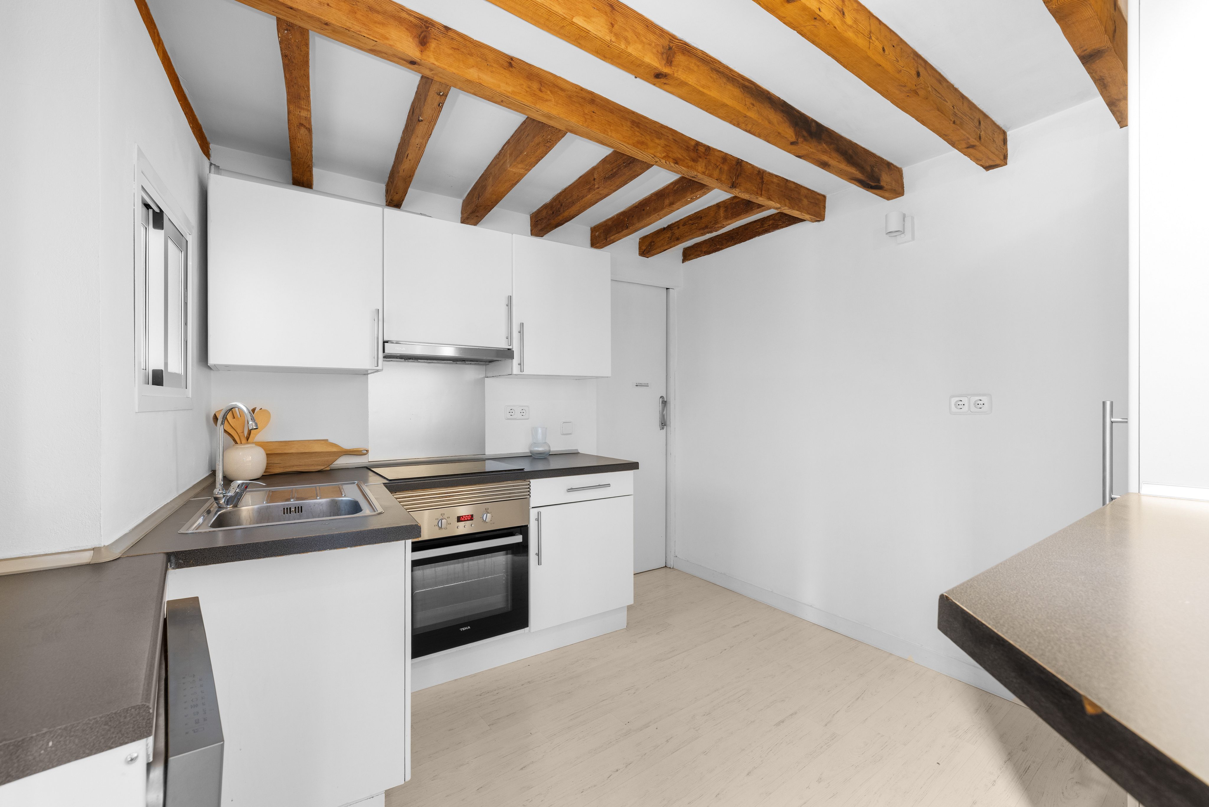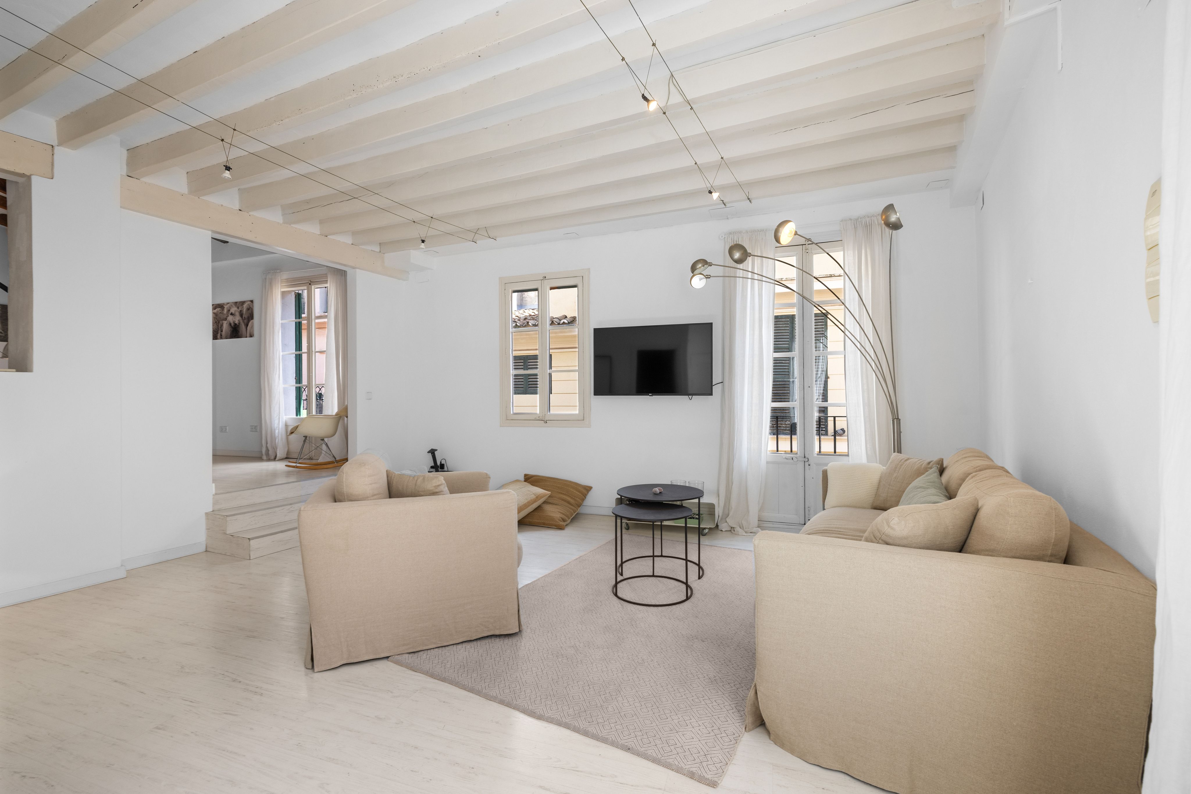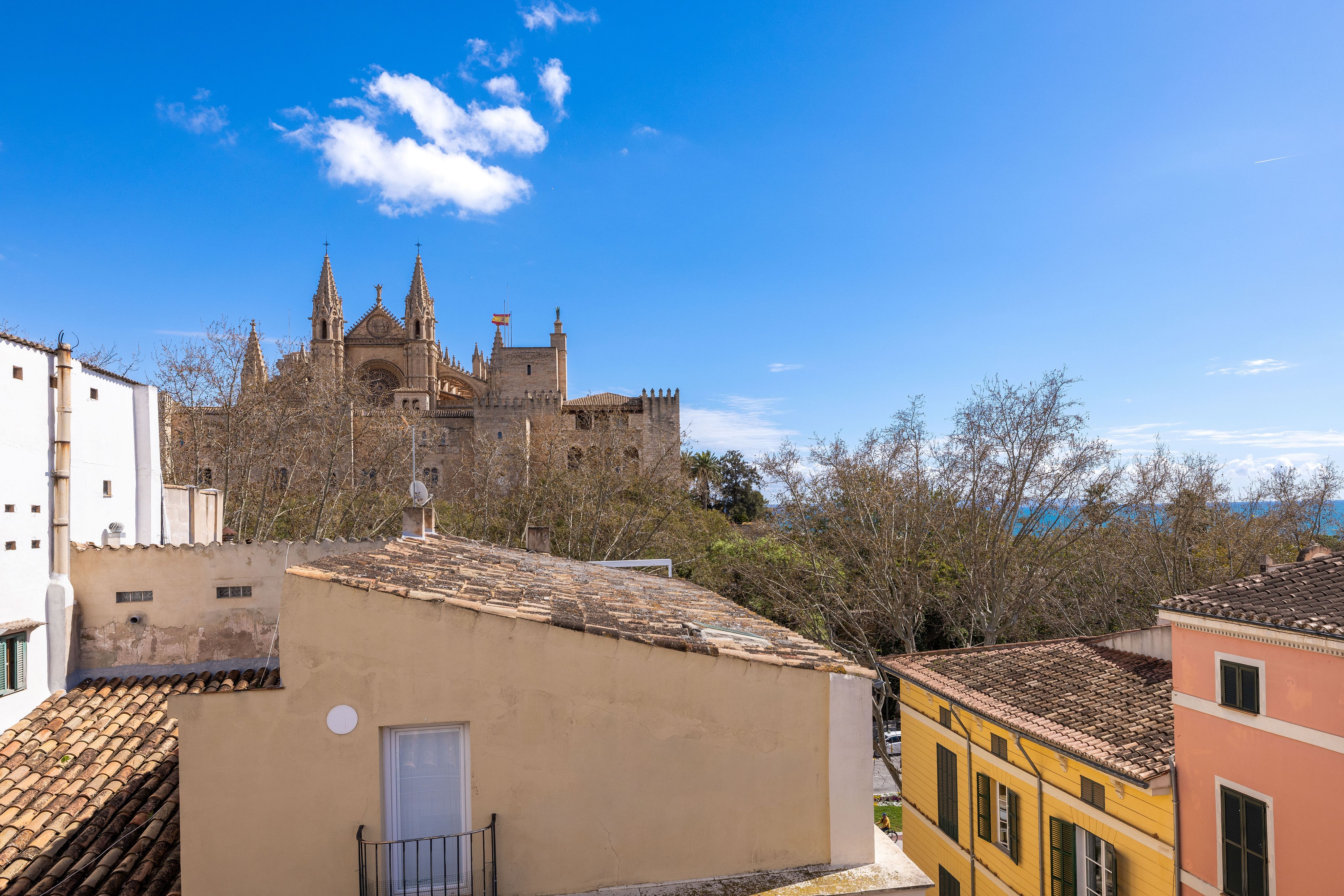 Al livello d'ingresso, si viene accolti da un ampio soggiorno e da una zona pranzo, elegantemente separati da pochi gradini. Gli alti soffitti con travi in legno a vista conferiscono al soggiorno un'atmosfera luminosa e aperta, con un carattere caldo e rustico. La cucina separata è funzionale e ha un ripostiglio adiacente. Le camere da letto sono tre in totale, due delle quali si trovano al piano superiore e sono quindi particolarmente riservate. Ogni camera da letto ha il proprio bagno, mentre al livello principale si trova anche un WC per gli ospiti. Numerosi armadi a muro e tre balconi offrono comfort e praticità e l'appartamento è in parte arredato di recente. L'aria condizionata con funzione caldo/freddo garantisce un clima piacevole tutto l'anno. Un piano e mezzo più in alto, una terrazza comune sul tetto invita a godersi il sole e a lasciar vagare lo sguardo sui tetti della città. La posizione in una tranquilla strada secondaria, circondata da edifici storici e vicoli stretti e acciottolati, incarna il tipico stile di vita mediterraneo. Allo stesso tempo, nelle immediate vicinanze si trovano attrazioni culturali, piccoli caffè, boutique esclusive e ristoranti di prima classe. Il porto e la famosa cattedrale sono facilmente raggiungibili a piedi, rendendo questa casa speciale una base ideale per vivere appieno la vibrante Palma.