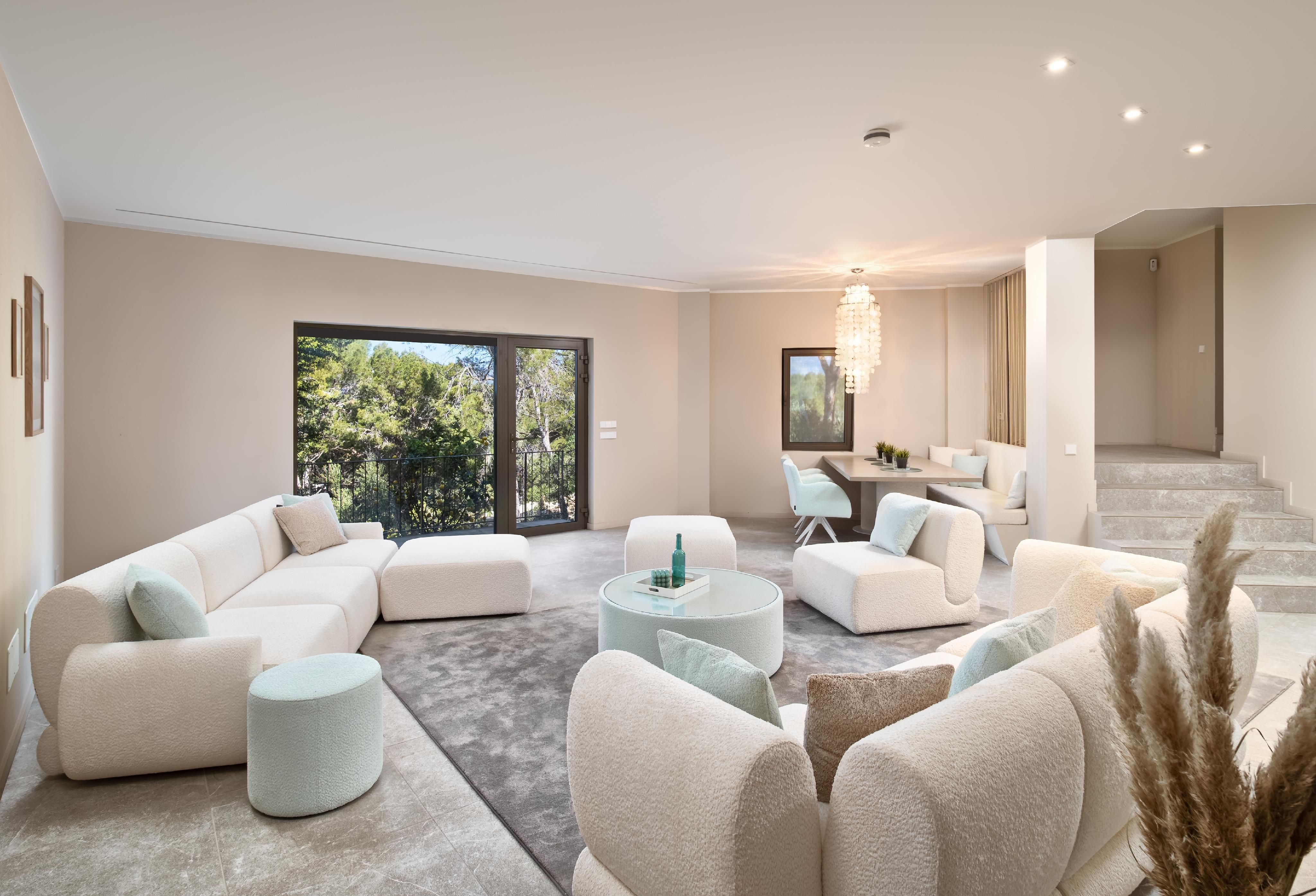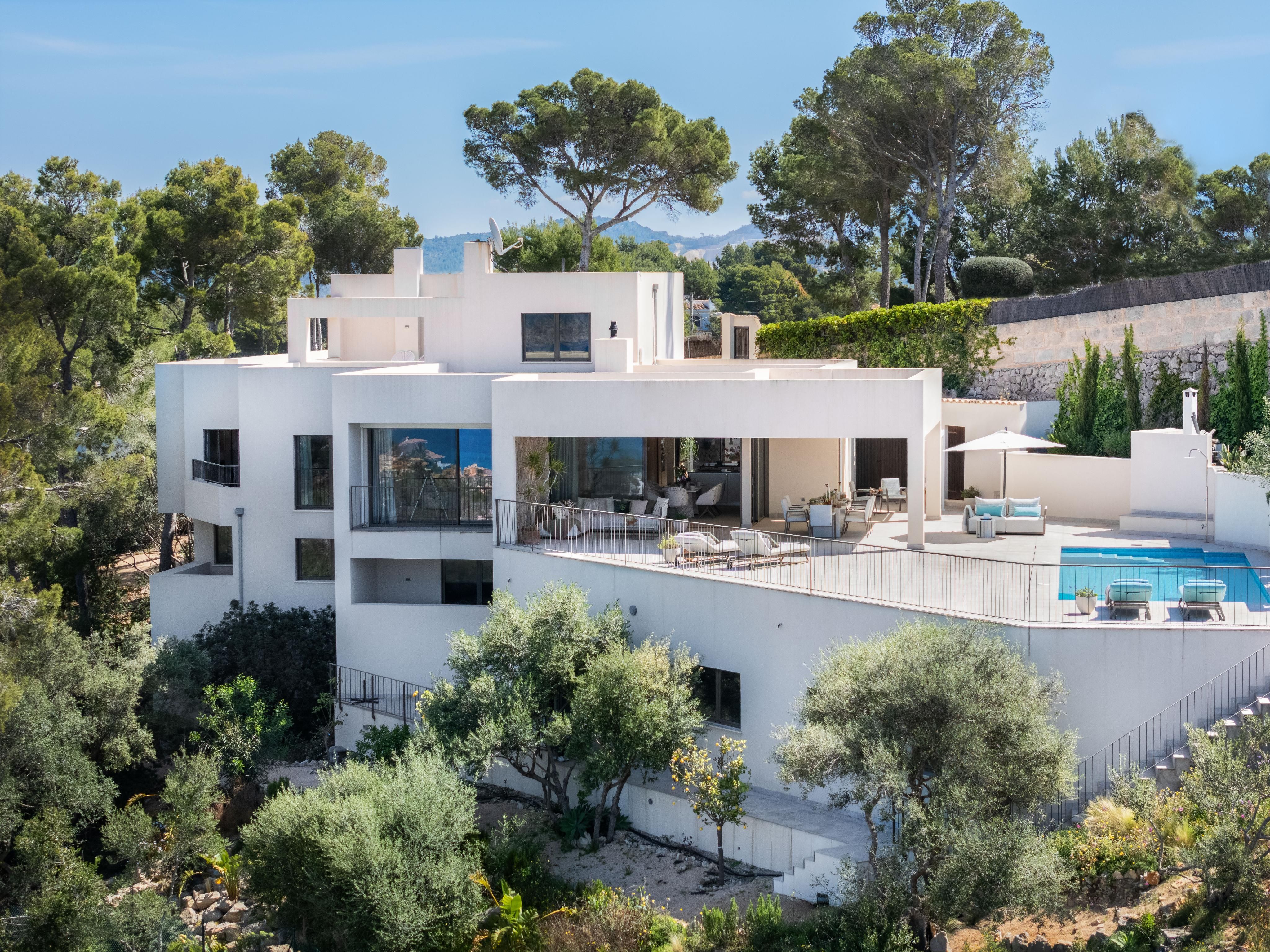 Questa villa, che è stata ampiamente modernizzata nel 2023, si trova su una collina elevata a Costa de la Calma, una tranquilla zona residenziale sopra la baia di Santa Ponsa. Da qui si gode di un'ampia vista sulla costa e sul mare aperto. L'atmosfera è particolarmente suggestiva nelle ore serali: la posizione esposta a sud-ovest permette di ammirare affascinanti tramonti quasi ogni giorno, che si possono ammirare da diverse aree della villa. La proprietà si estende su tre piani e colpisce per il suo design chiaro, gli ambienti luminosi e la concezione degli spazi ben studiata. Il fulcro è costituito dal soggiorno e dalla zona pranzo a pianta aperta con una cucina americana di alta qualità. Un camino offre un piacevole calore e un'atmosfera accogliente nelle giornate più fresche. Da quest'area si accede direttamente alla spaziosa terrazza con zona pranzo coperta e piscina a sfioro con acqua salata, un luogo ideale per trascorrere momenti tranquilli o per socializzare. La villa offre un totale di cinque camere da letto, ognuna con il proprio bagno. Al livello principale si trova la camera da letto principale con spogliatoio e bagno privato. Al piano superiore si trova un'altra camera da letto con bagno e terrazza privata, che ha un ingresso separato e può quindi essere utilizzata come appartamento per gli ospiti. Il livello inferiore della casa può essere utilizzato in vari modi: c'è una sala fitness con sauna e doccia, una camera da letto con bagno privato e un appartamento per gli ospiti accessibile separatamente con due camere da letto e cucina preinstallata - una soluzione ideale per i visitatori o per soggiorni più lunghi. L'offerta è completata da un WC per gli ospiti, un ripostiglio, diversi ripostigli e un garage doppio con accesso diretto alla casa. Una combinazione di riscaldamento a pavimento e radiatori assicura un clima interno piacevole in tutte le aree. Anche l'area esterna è stata progettata con cura: la piscina di acqua salata e le varie aree per sedersi e prendere il sole si integrano armoniosamente nel quadro generale e offrono molto spazio per rilassarsi. La posizione elevata crea una sensazione di spazio, tranquillità e privacy. Questa villa combina una vita moderna con uno stile di vita mediterraneo in una posizione tranquilla ma ben collegata: una casa ideale sia per la vita quotidiana che come rifugio.