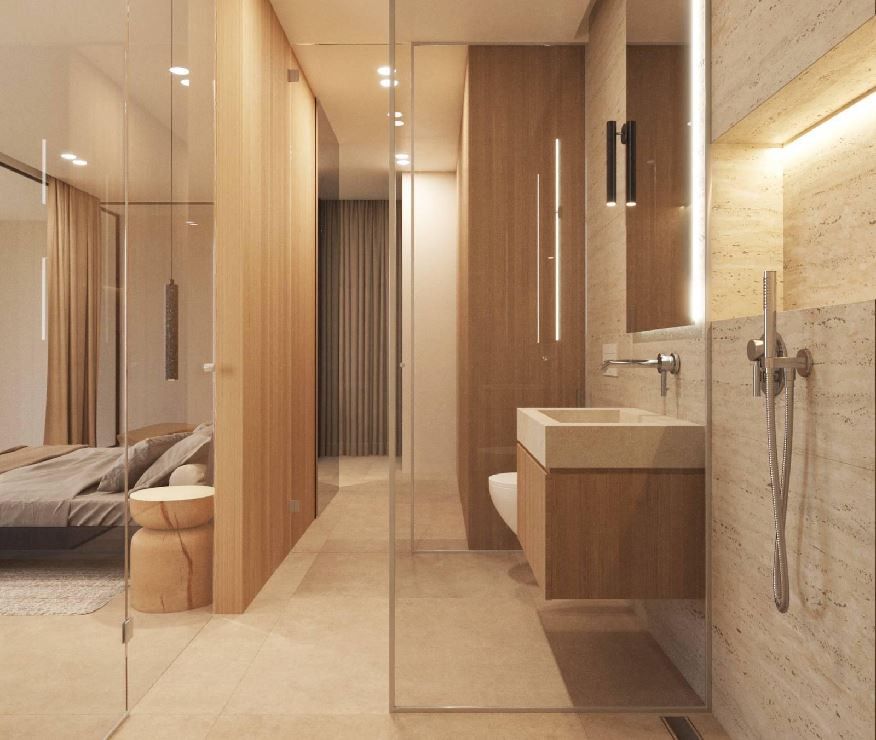 Per quanto riguarda le finiture, sono stati scelti pavimenti in gres porcellanato e bagni con sanitari sospesi dal design semplice. La climatizzazione è assicurata dal riscaldamento aerotermico a pavimento e dal condizionamento centralizzato con pompa di calore, per garantire un buon comfort termico tutto l'anno. Si tratta di una costruzione contemporanea e solida che soddisfa gli standard attuali e offre un'esperienza abitativa onesta.