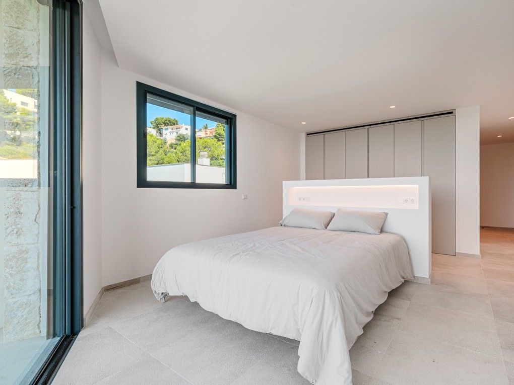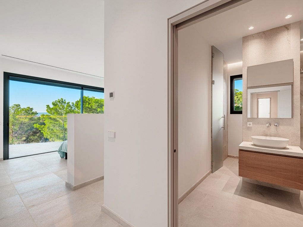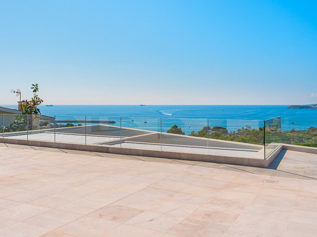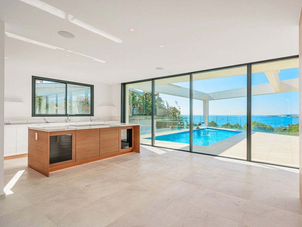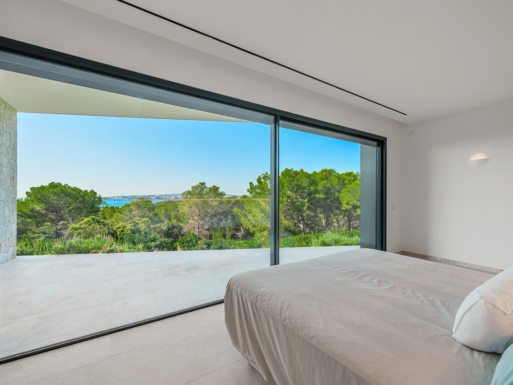 Situata nell'elegante zona residenziale di Costa d'en Blanes, appena sopra il porto di Puerto Portals, questa villa di nuova costruzione offre una meravigliosa opportunità di godere dello stile di vita mediterraneo. Con una splendida vista sul mare e un giardino pianeggiante, la proprietà è ideale per vivere tutto l'anno e vicino alle scuole locali e internazionali o per chi desidera una casa vicino alla propria barca. Entrando nella proprietà si viene immediatamente accolti dalla vista sul mare attraverso le finestre a tutta altezza. La zona giorno, pranzo e cucina è a pianta aperta e conduce alla soleggiata terrazza della piscina esposta a sud. Su questo livello si trova anche una camera da letto per gli ospiti con bagno privato, accesso dal garage doppio e un WC per gli ospiti. Al piano inferiore si trovano una camera da letto principale con accesso al giardino, altre due camere da letto per gli ospiti e una lavanderia. Il giardino invita al relax e la terrazza sul tetto è il luogo ideale per guardare il sole scomparire dietro le montagne. Le caratteristiche della proprietà includono: Pavimenti in pietra, riscaldamento a pavimento, aria condizionata, pareti in pietra naturale, impianto musicale, tende elettriche, piscina con fontana massaggiante.