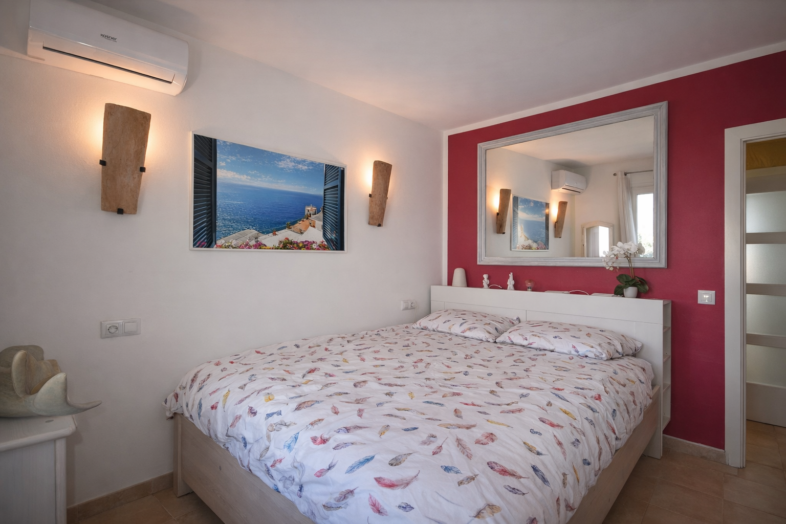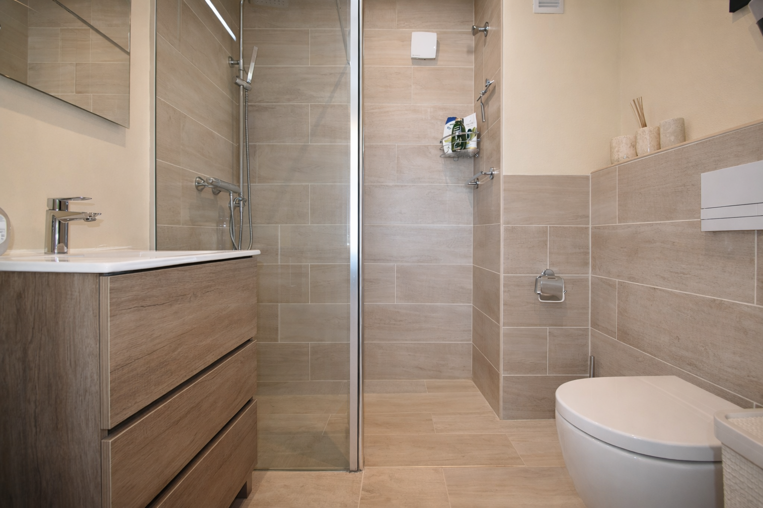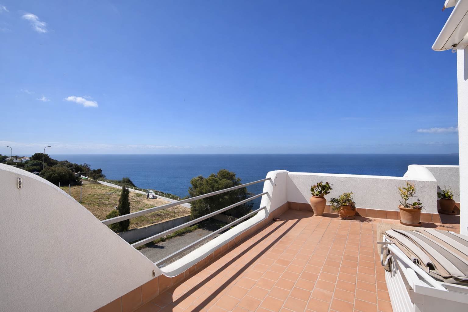 Een hoogtepunt is het ruime terras van 32 m² met vrij uitzicht op de zee en de omliggende bergen. De oriëntatie op het westen maakt het de ideale plek om te genieten van spectaculaire zonsondergangen.