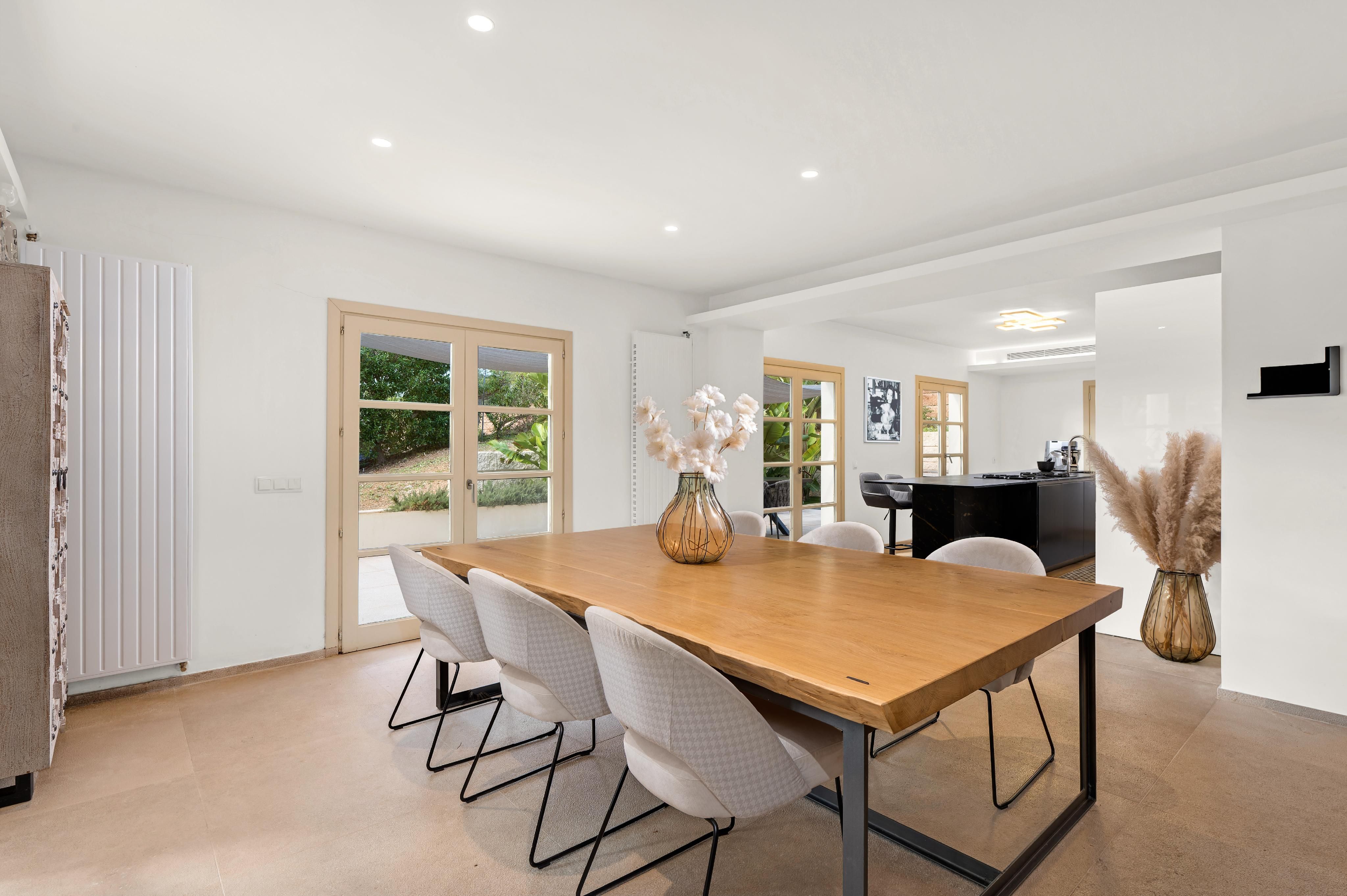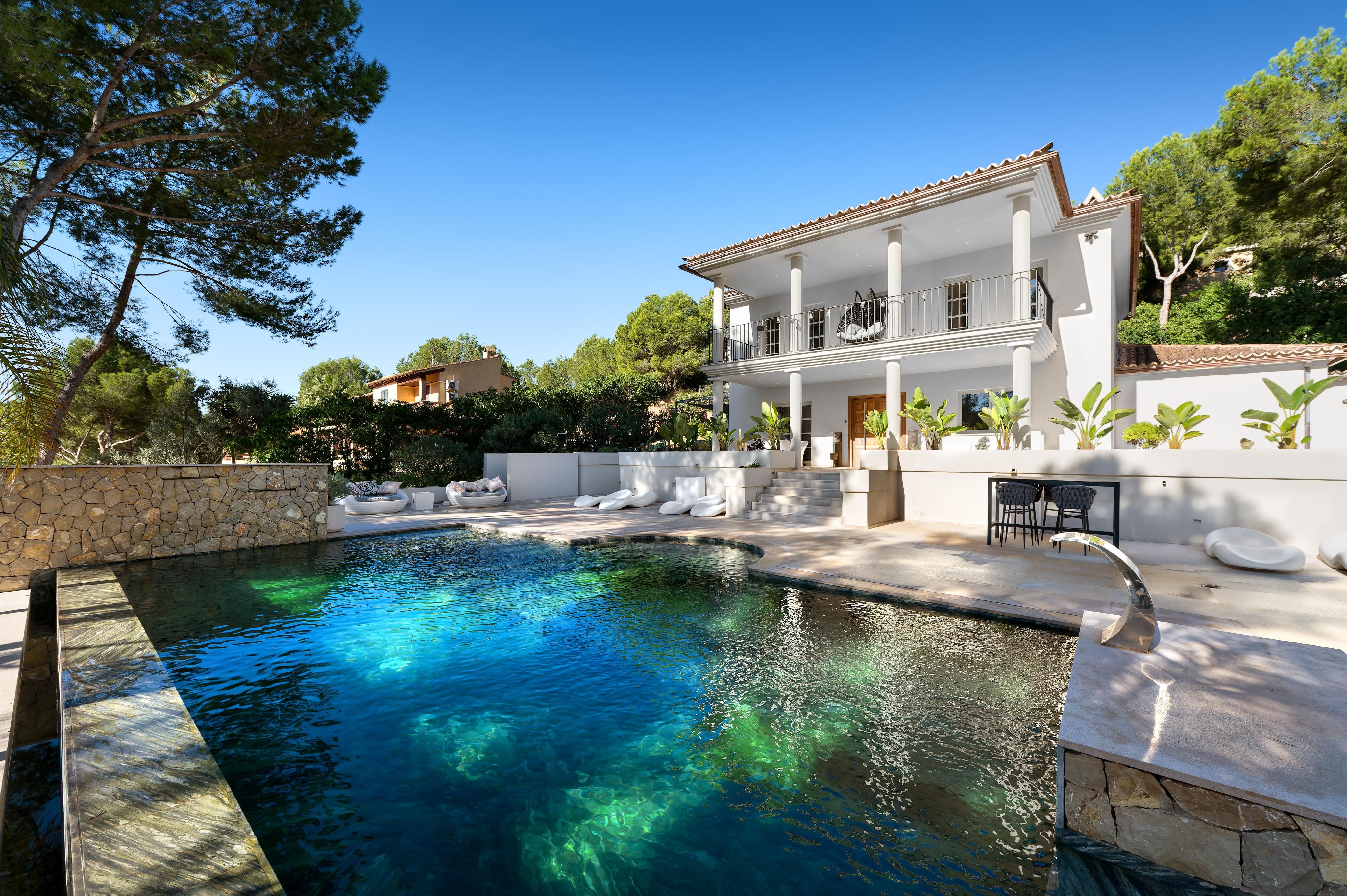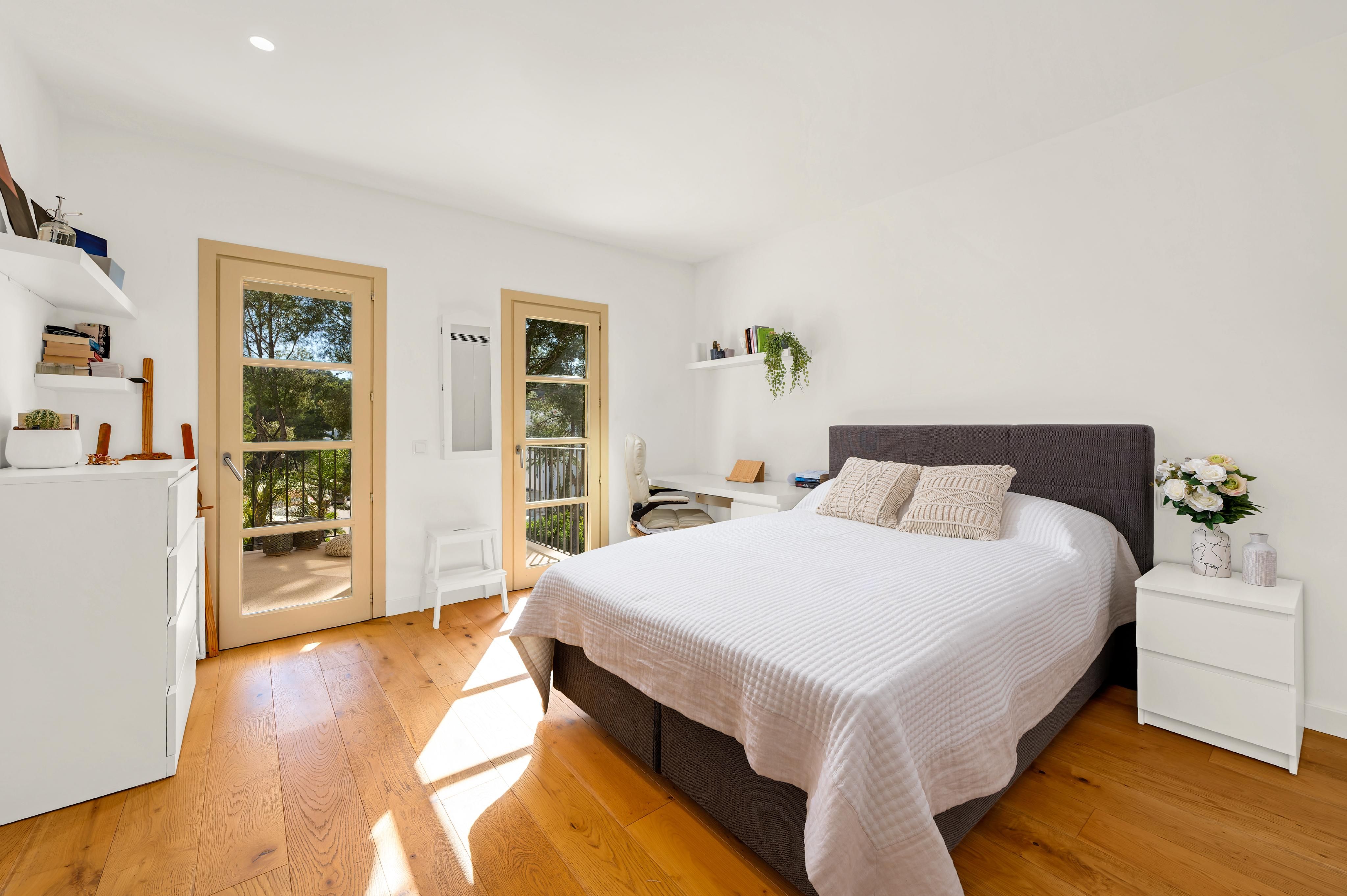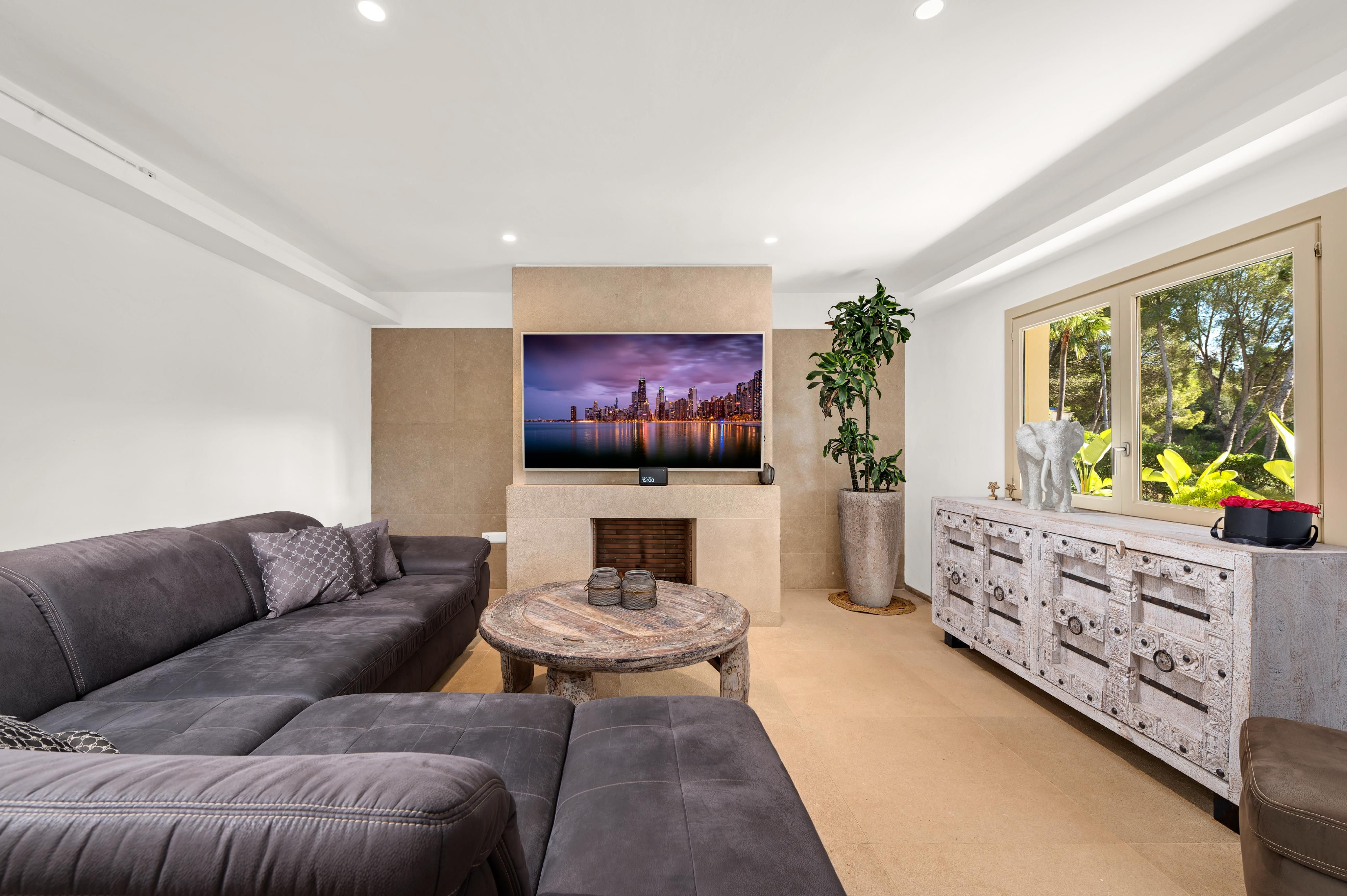 Deze charmante villa ligt in de rustige woonwijk Costa de la Calma, op slechts 600 meter van het strand. Het huis ligt op een ruim perceel van ongeveer 2.000 m² op het zuiden en biedt veel privacy, zon en mediterrane flair. De lichte, open woonkamer creëert een warme en uitnodigende sfeer - perfect voor het gezinsleven en vooral leuk voor de jongere leden van het huishouden. De ruime overdekte en open terrassen bieden ideale ruimtes om te ontspannen of gezellig samen te zijn en nodigen je uit om gezellige avonden door te brengen met familie en vrienden onder de Mallorcaanse hemel terwijl je geniet van culinaire hoogstandjes. Een bijzonder hoogtepunt is het zwembad van 54 m², dat prachtig betegeld is met Granito Verde Paraná van hoge kwaliteit en een vleugje elegantie en verfijning toevoegt aan de buitenruimte. De villa heeft vijf ruime slaapkamers en vier badkamers, evenals verwarming en warme en koude airconditioning voor comfort het hele jaar door. Een gastenappartement biedt extra flexibiliteit en privacy voor bezoekers. Een ideale gelegenheid om te genieten van het mediterrane leven op zijn best - op een van de meest rustige en gewilde locaties in het zuidwesten van Mallorca.