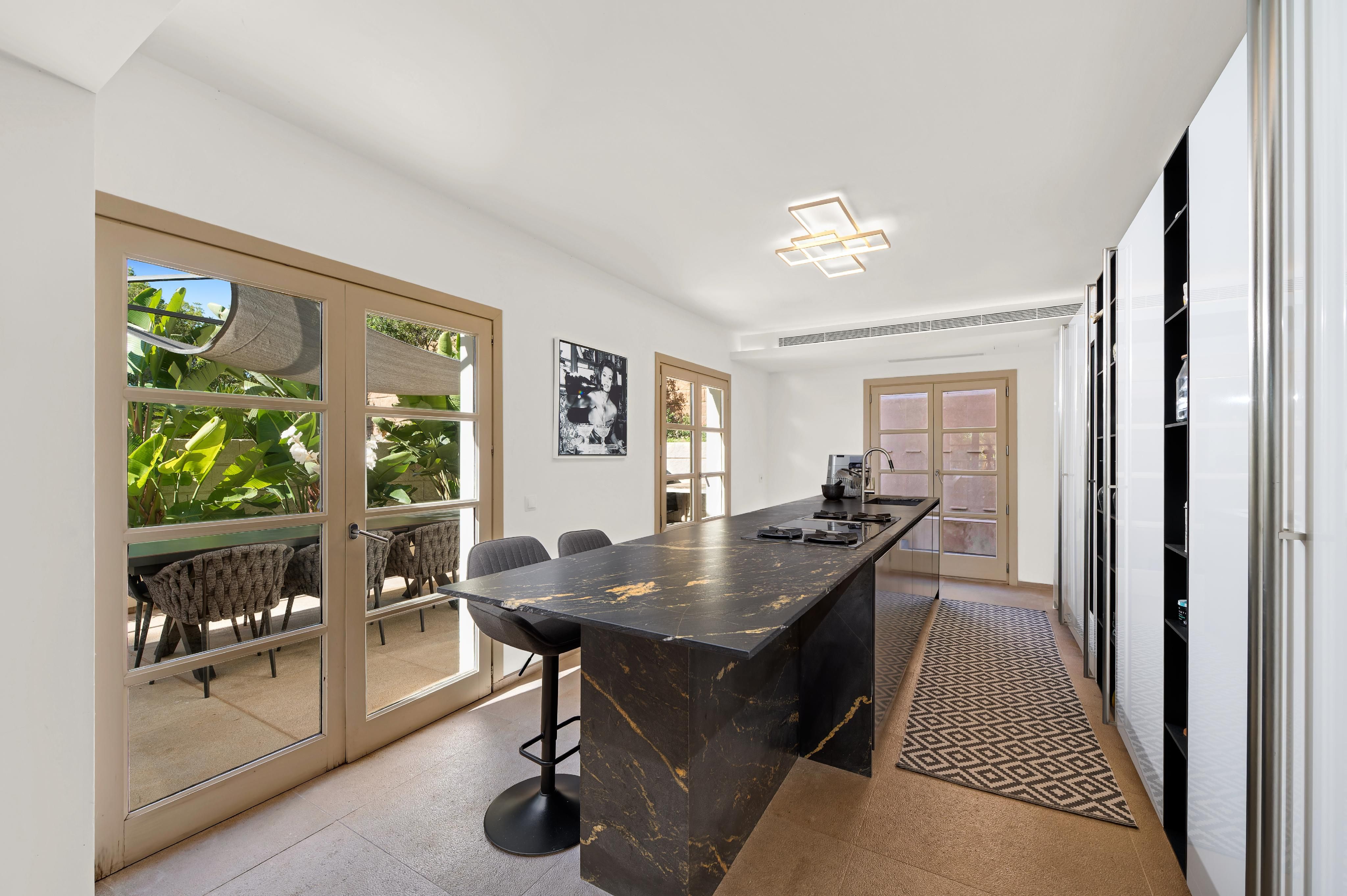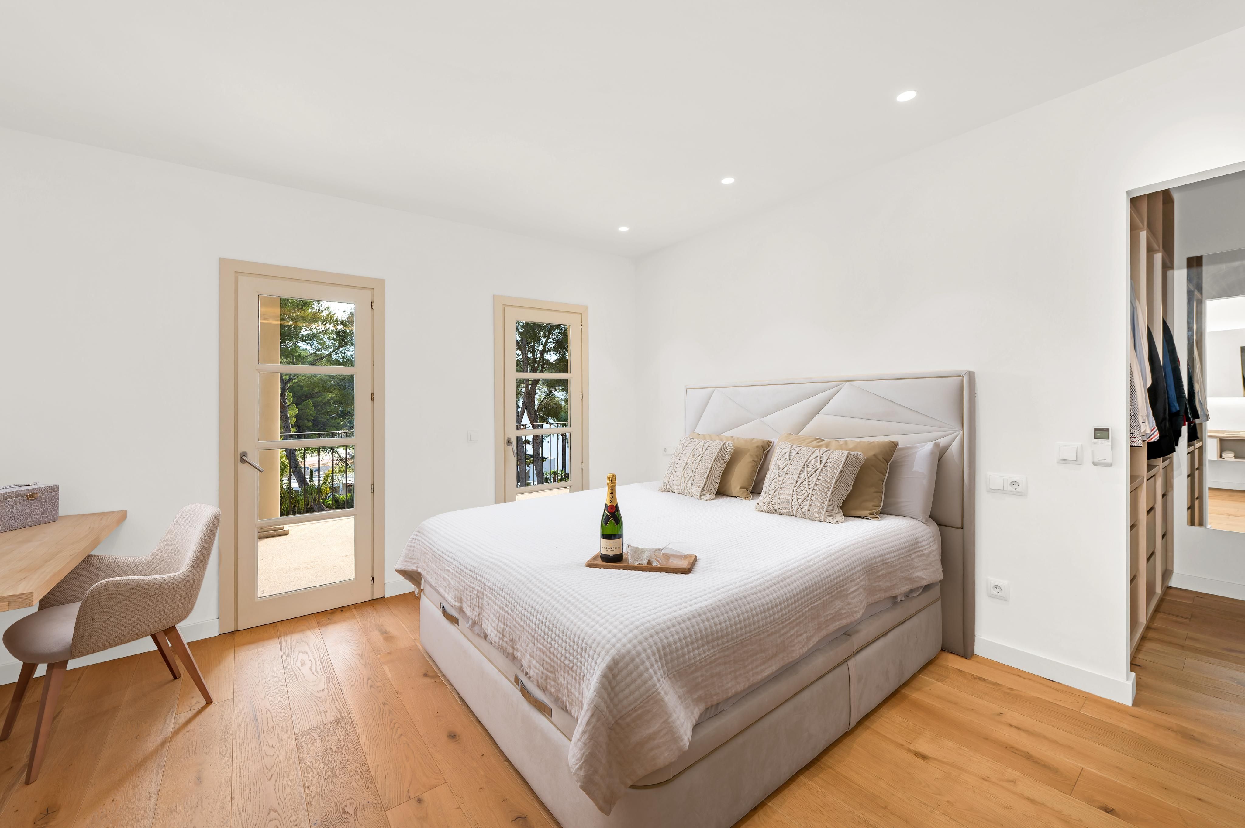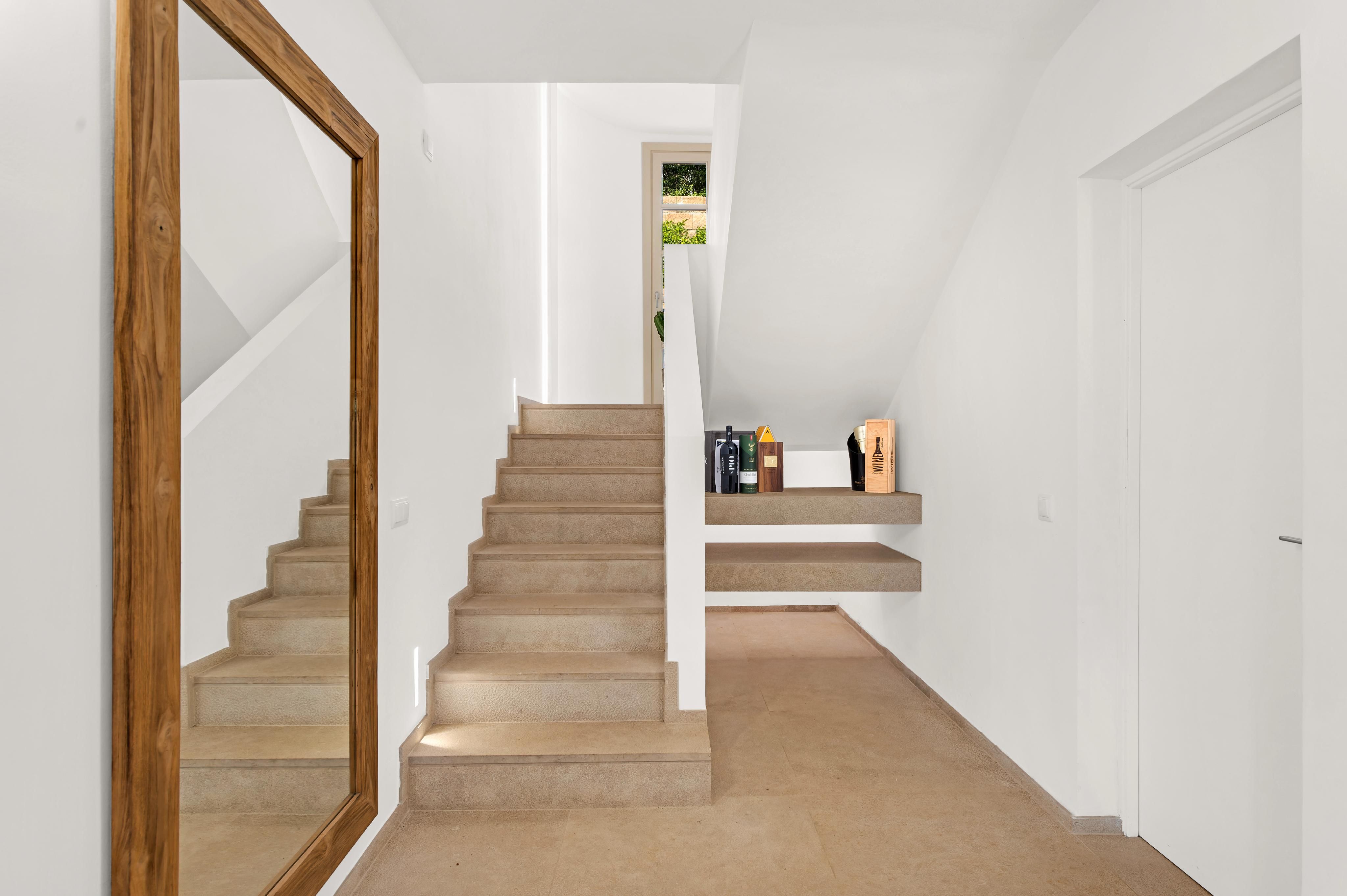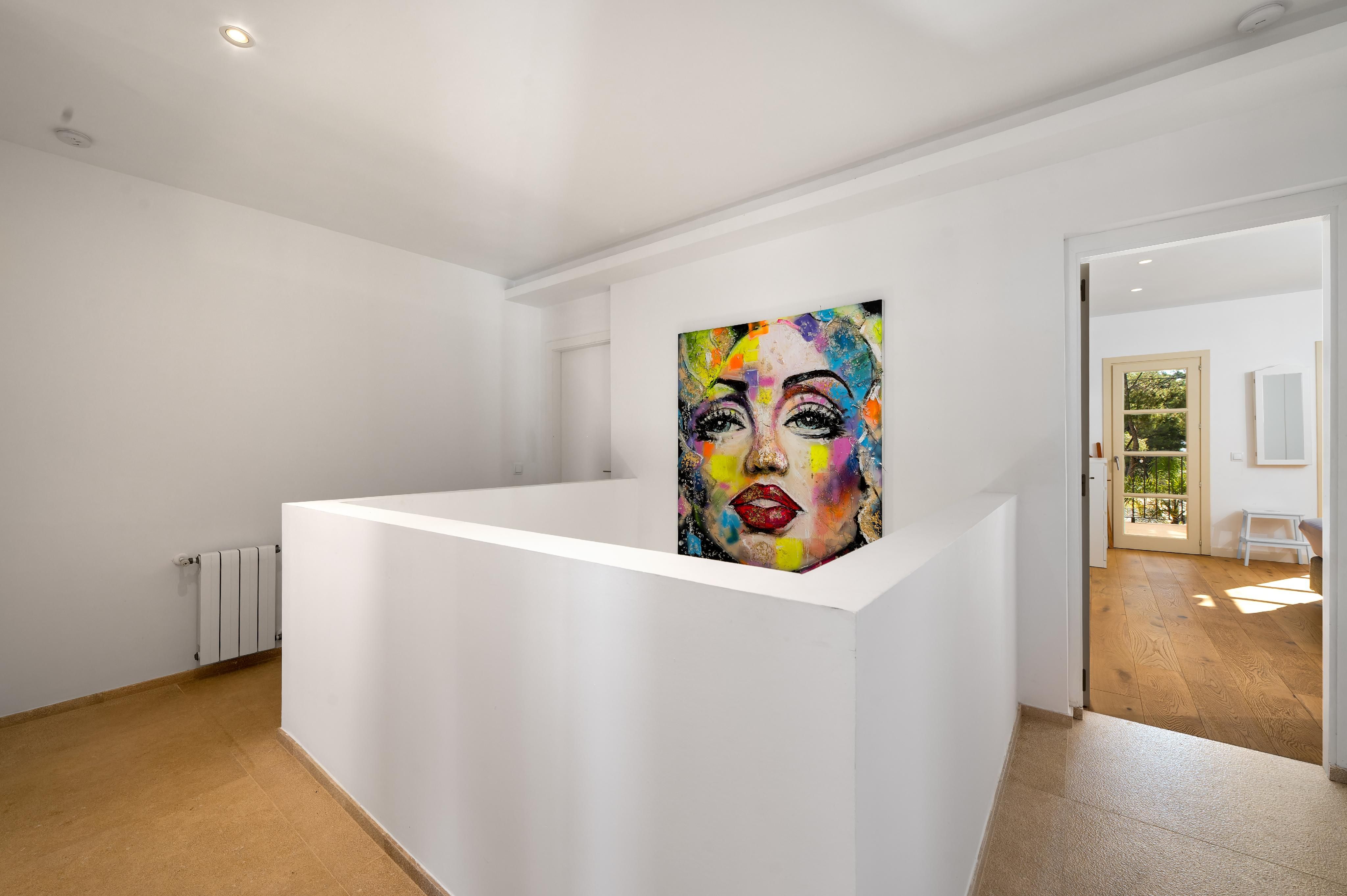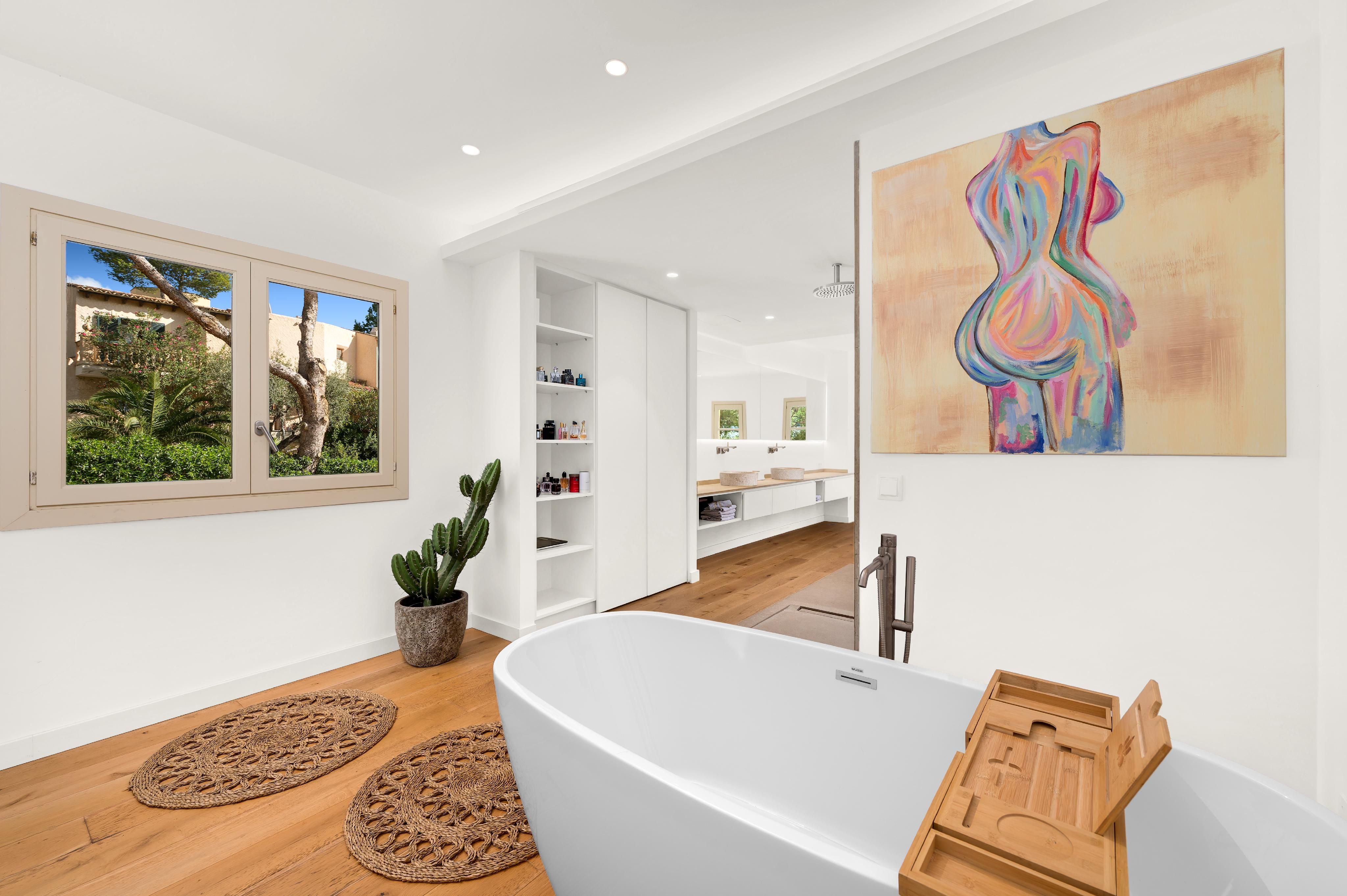 Deze charmante villa ligt in de rustige woonwijk Costa de la Calma, op slechts 600 meter van het strand. Het huis ligt op een ruim perceel van ongeveer 2.000 m² op het zuiden en biedt veel privacy, zon en mediterrane flair. De lichte, open woonkamer creëert een warme en uitnodigende sfeer - perfect voor het gezinsleven en vooral leuk voor de jongere leden van het huishouden. De ruime overdekte en open terrassen bieden ideale ruimtes om te ontspannen of gezellig samen te zijn en nodigen je uit om gezellige avonden door te brengen met familie en vrienden onder de Mallorcaanse hemel terwijl je geniet van culinaire hoogstandjes. Een bijzonder hoogtepunt is het zwembad van 54 m², dat prachtig betegeld is met Granito Verde Paraná van hoge kwaliteit en een vleugje elegantie en verfijning toevoegt aan de buitenruimte. De villa heeft vijf ruime slaapkamers en vier badkamers, evenals verwarming en warme en koude airconditioning voor comfort het hele jaar door. Een gastenappartement biedt extra flexibiliteit en privacy voor bezoekers. Een ideale gelegenheid om te genieten van het mediterrane leven op zijn best - op een van de meest rustige en gewilde locaties in het zuidwesten van Mallorca.