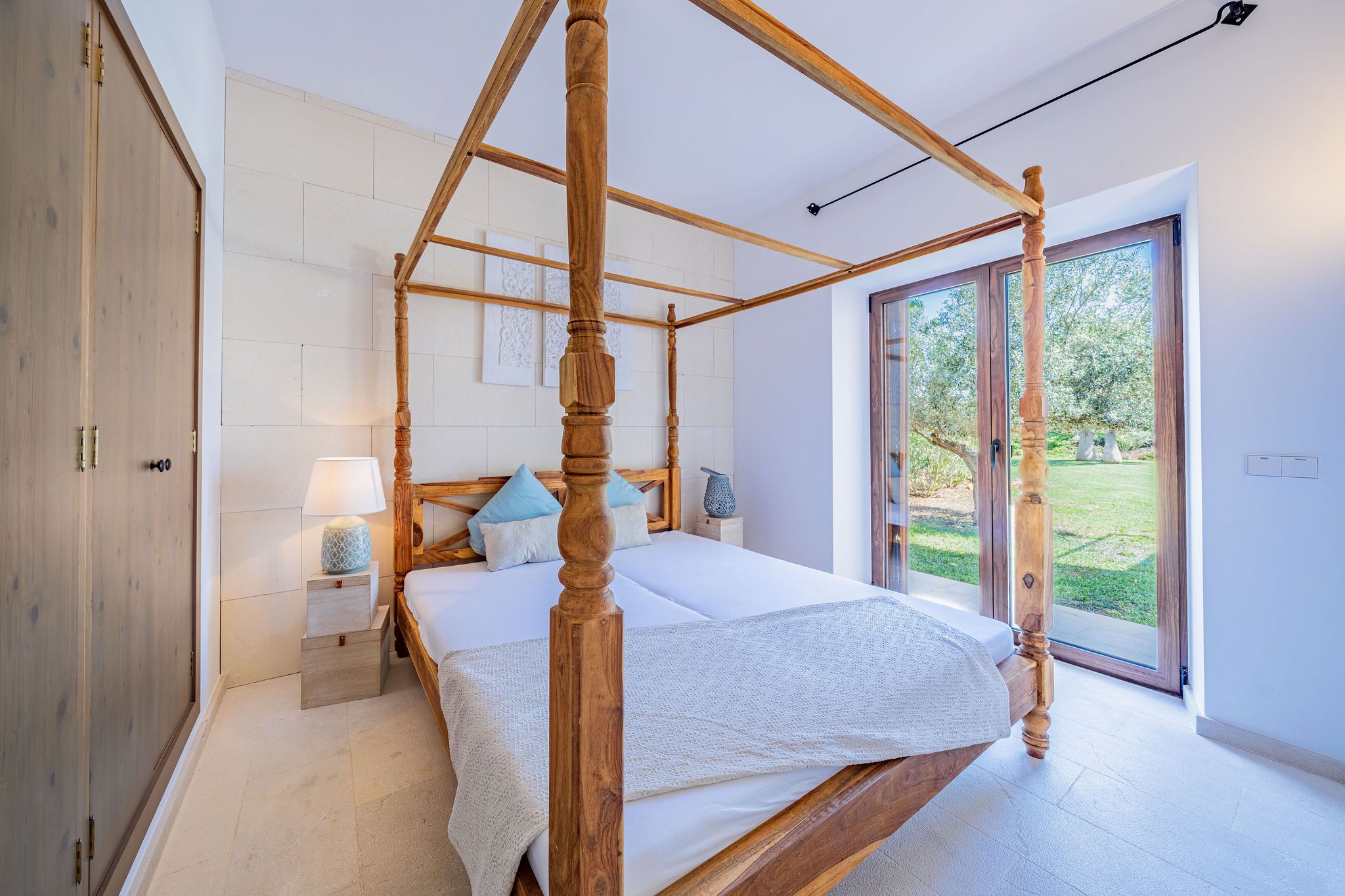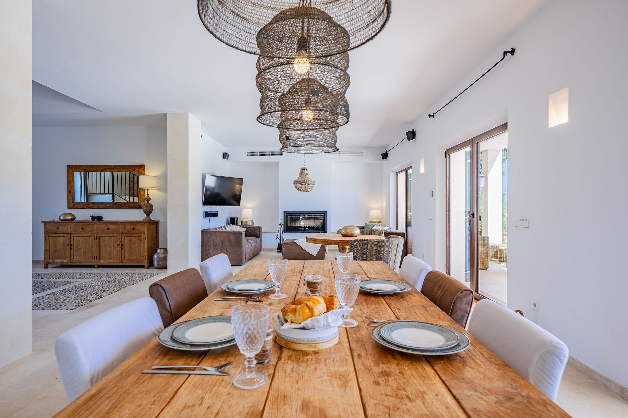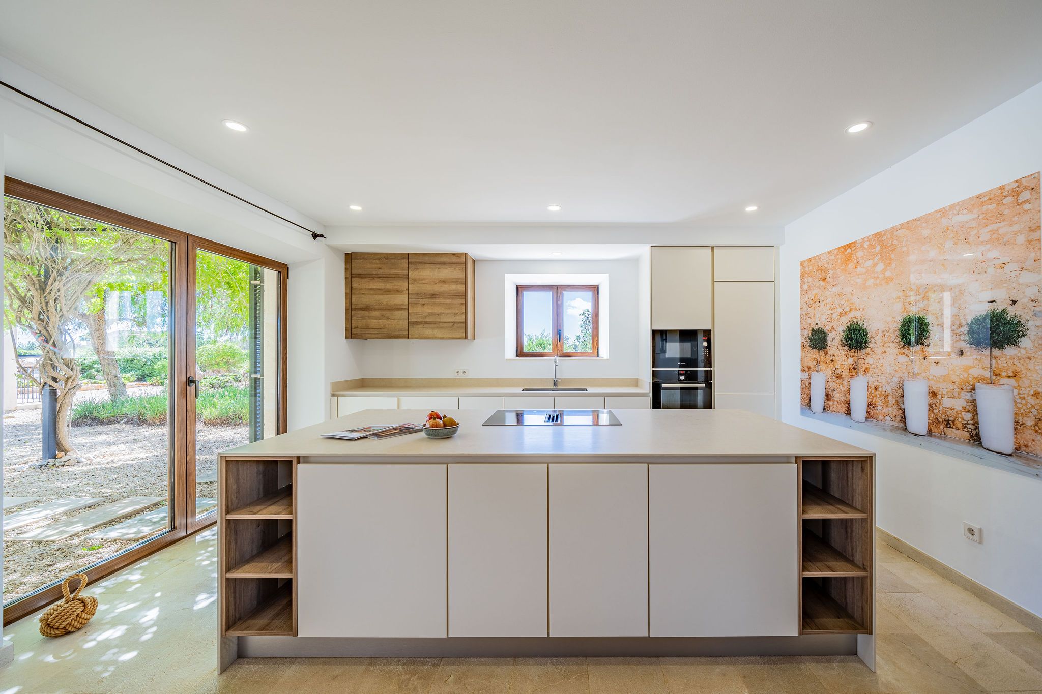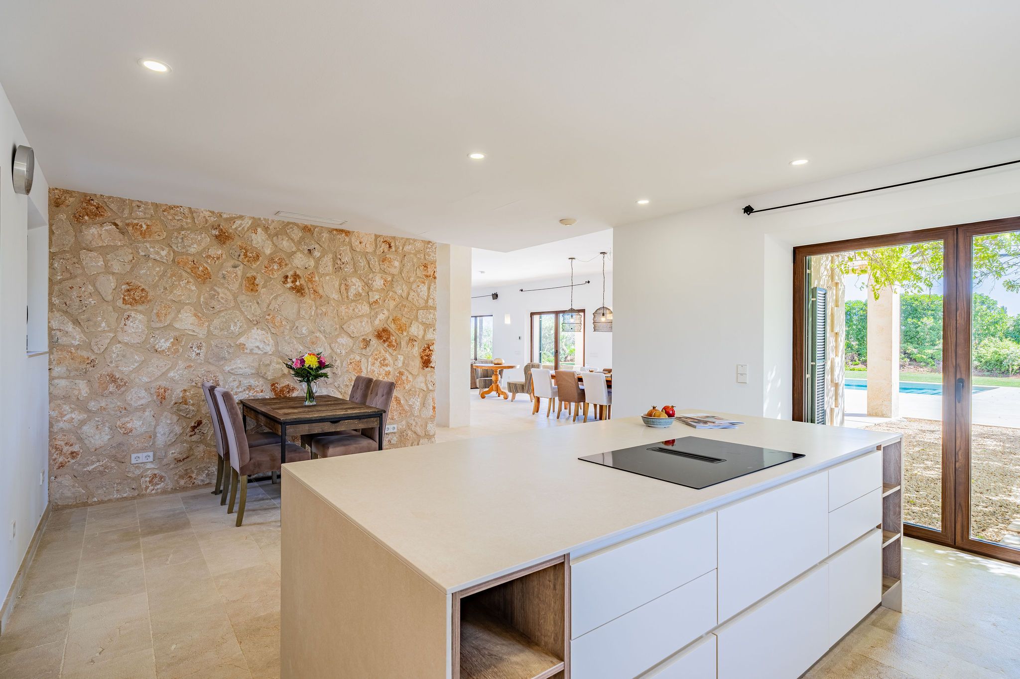 Deze moderne finca is in 2018 gebouwd op een perceel van ca. 15.741 m² en maakt indruk met zijn mediterrane ontwerp. Ramen van vloer tot plafond lopen door het hele huis en bieden uitzicht op de natuurlijke omgeving vanuit bijna elke kamer en de zee op de bovenverdieping. Natuurstenen muren geven het pand een authentieke sfeer, terwijl moderne accenten voor een stijlvol contrast zorgen. Zelfs de entree met zijn mediterrane details straalt een gevoel van welkom uit. De entree loopt naadloos over in de open woon- en eetruimte met open haard, waardoor een harmonieuze verbinding tussen de ruimtes ontstaat. Direct aangrenzend is een volledig uitgeruste keuken. Vanaf hier heb je toegang tot een overdekt terras, dat extra buitenruimte biedt. De begane grond wordt gecompleteerd door twee slaapkamers, elk met een eigen badkamer. Twee praktische bergruimtes, waaronder een aparte wasruimte, bieden extra gemak. Op de bovenverdieping vind je de ruime ouderslaapkamer met eigen badkamer, met als bijzonder hoogtepunt het vrijstaande bad. Er zijn ook nog drie slaapkamers, elk met een eigen badkamer. Je kunt vanuit alle slaapkamers genieten van een fantastisch uitzicht op zee, en twee van de kamers hebben toegang tot een ruim balkon. De mediterrane tuin met een zwembad van 60 m² en gedeeltelijk overdekte terrassen met BBQ, fruitbomen en een eigen wijngaard - een bijzonder hoogtepunt voor wijnliefhebbers - rondt het pand perfect af. De garage biedt plaats aan twee auto's en heeft directe toegang tot het huis. De vloerverwarming en airconditioning kunnen worden geregeld via een smart home systeem.