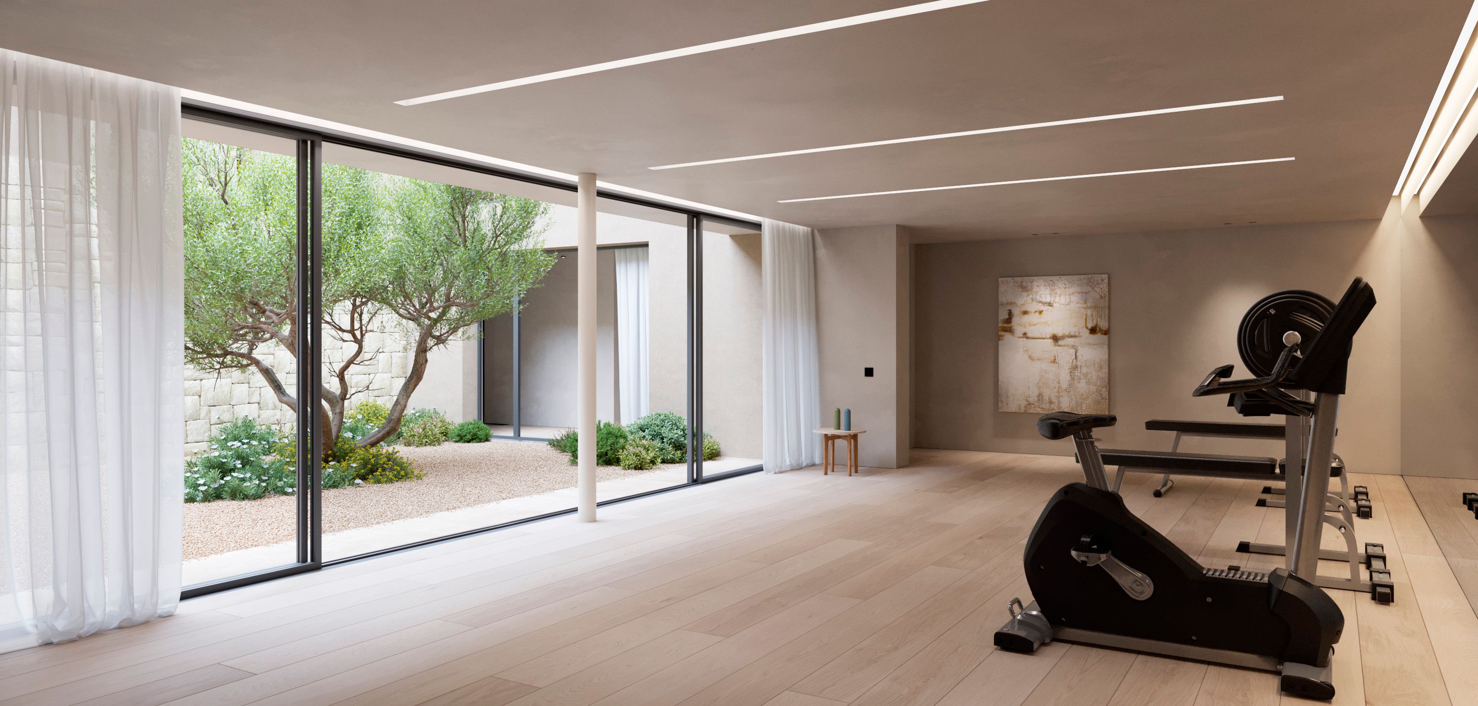 In de kelder is een grote garage en een luxe, privé wellnessruimte met fitnessruimte, sauna en stoombad.