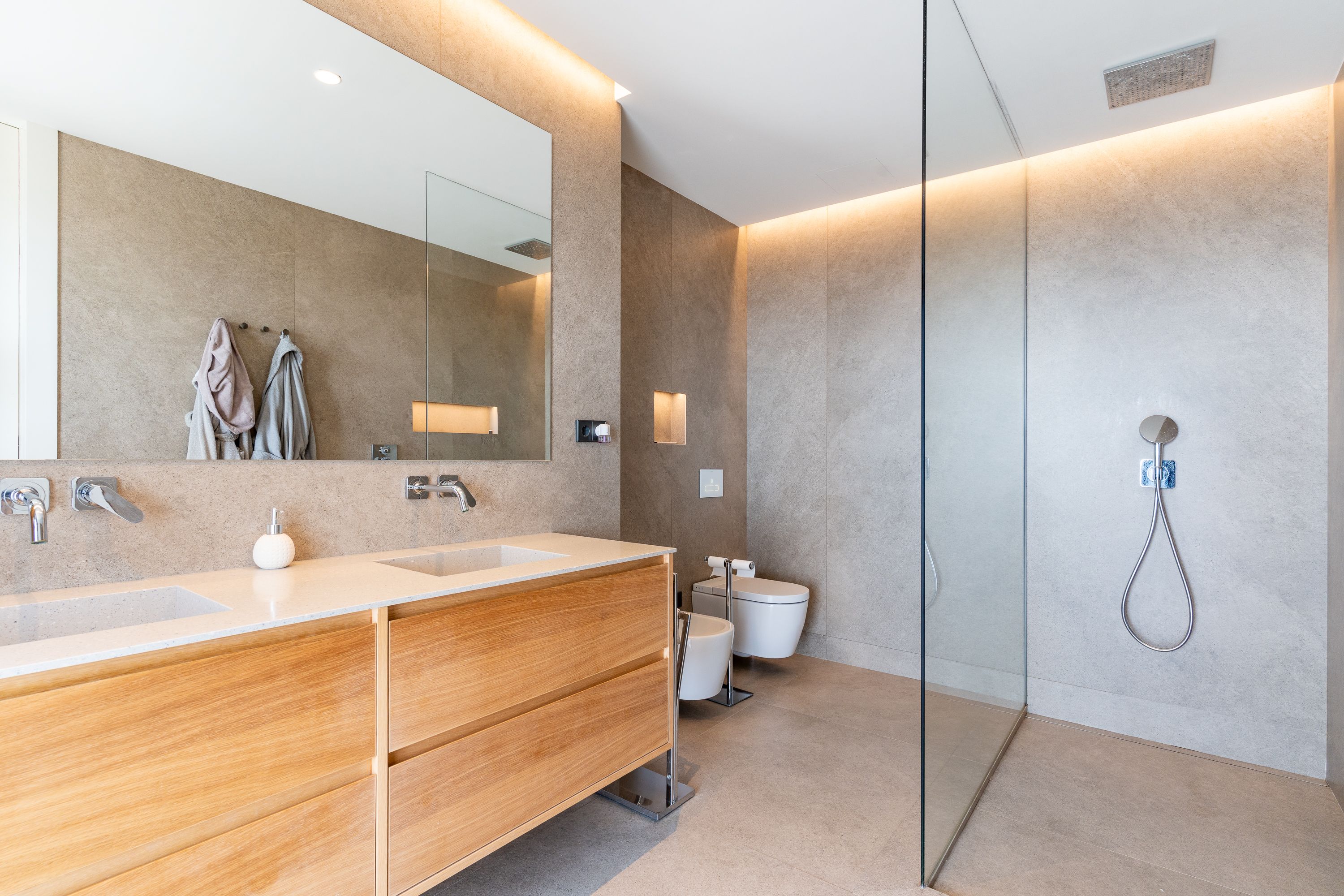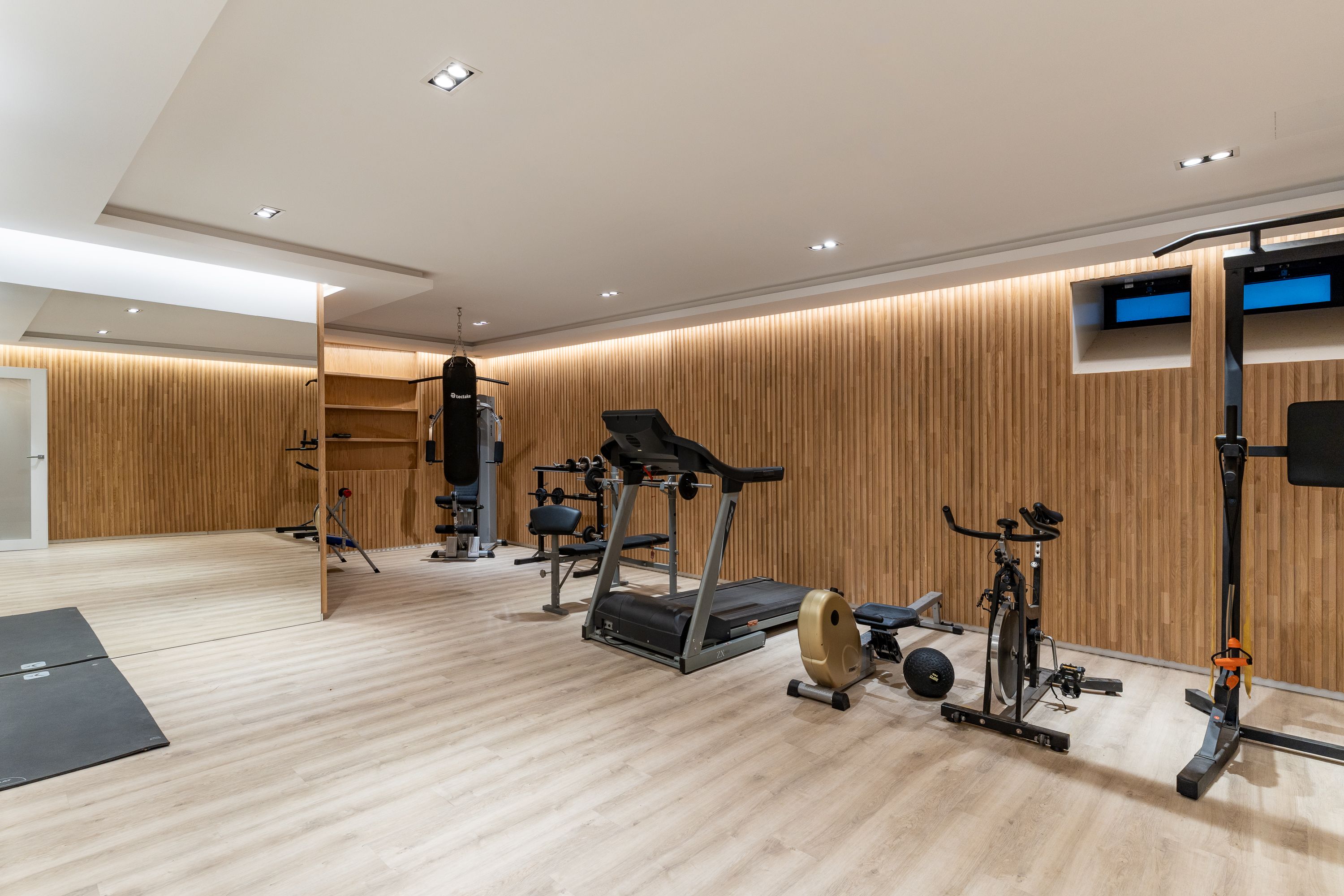De kelder biedt verschillende gebruiksmogelijkheden: een grote garage voor twee auto's, een wijnkelder, een fitnessruimte en een ruime woonkamer met open keuken, daglicht en directe toegang tot buiten. Voor extra gemak is er een lift die alle drie de verdiepingen met elkaar verbindt, evenals een ruimte die is aangewezen voor een mogelijk binnenzwembad.