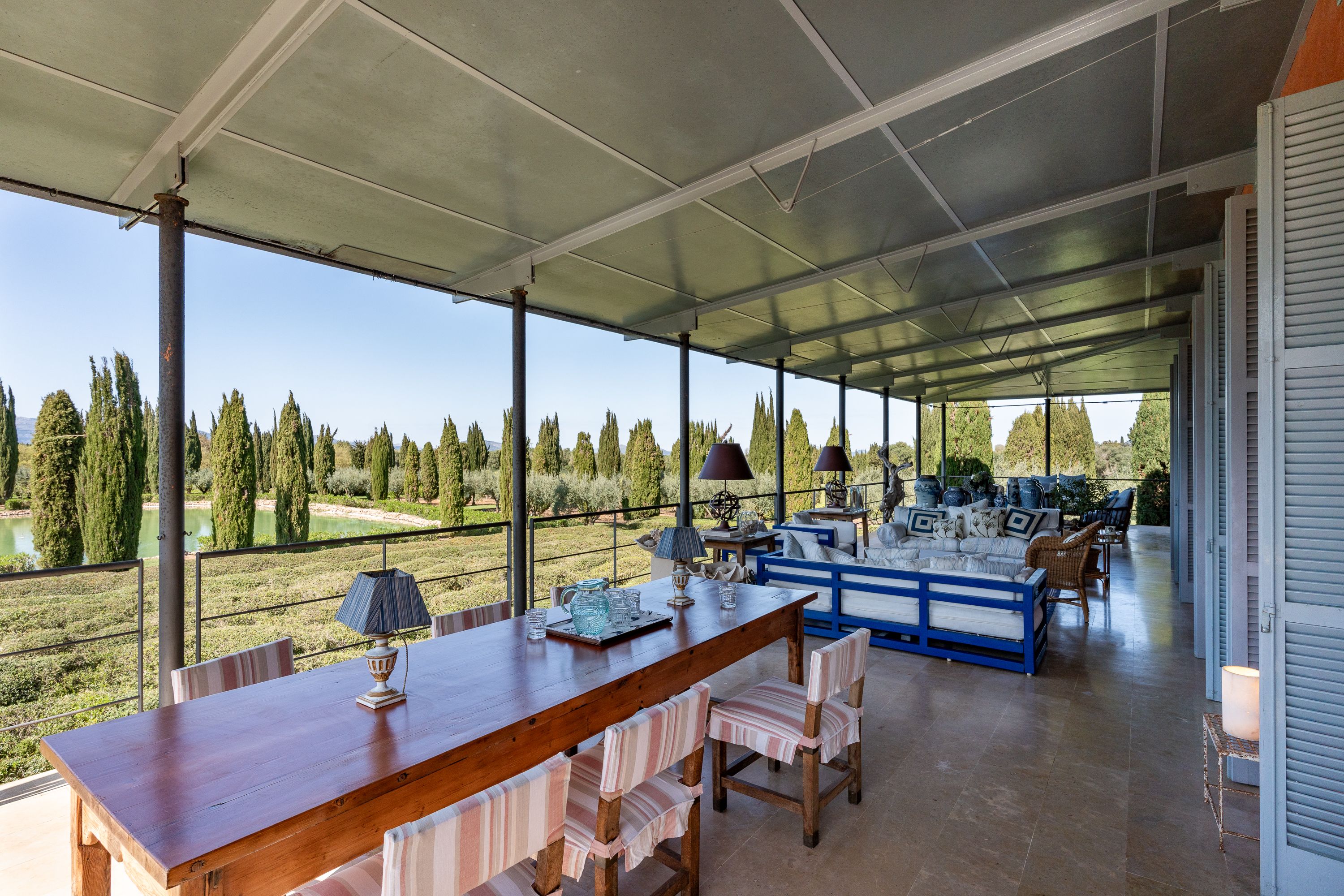 Deze indrukwekkende villa in haciënda-stijl ligt in een rustige landelijke omgeving en combineert klassieke elegantie, modern comfort en absolute privacy in perfecte harmonie. Het pand is ideaal als familieverblijf of luxe retraite, wordt omringd door mediterrane natuur en strekt zich uit over een ruim, zorgvuldig aangelegd perceel dat rust, schoonheid en functionaliteit biedt. Het hoofdgebouw - met uitzondering van het gastenverblijf - is gelijkvloers en heeft ruime, lichte kamers die uitkomen op de spectaculaire overdekte buitenruimte. De belangrijkste woonkamer met directe toegang tot buiten nodigt je uit om te ontspannen en te socializen in een gezellige sfeer. De rustieke keuken is volledig uitgerust en combineert traditionele charme met moderne functionaliteit. Er zijn vier ruime slaapkamers in het hoofdgebouw, elk met een eigen badkamer en toegang tot de buitenruimte - ideaal voor het maximaliseren van privacy en comfort. De ruimte wordt aangevuld met een apart gastenappartement met nog eens twee slaapkamers, die een privé en comfortabele ruimte bieden voor gasten of personeel. Een apart bijgebouw biedt plaats aan vier extra slaapkamers, elk met een eigen badkamer, en biedt zo de perfecte omstandigheden om gasten te ontvangen met maximale onafhankelijkheid. Naast het ruime zwembad liggen verschillende open lounges die naadloos overgaan in de tuin - ideaal als zonneterras, zomerlounge of barbecueplaats om in alle privacy te genieten van het mediterrane klimaat. De tuin is een waar meesterwerk van landschapsarchitectuur, ontworpen door de beroemde architect Fernando Caruncho, die bekend staat om zijn vermogen om harmonieuze en meditatieve ruimtes te creëren. Geometrische lijnen en zorgvuldig geselecteerde beplanting creëren een unieke esthetiek en een diepe band met de natuur. Verdere kenmerken: Groot zwembad met ontspanningsruimtes, Airconditioning in alle kamers, Privé bron, Elektriciteitsaansluiting op het openbare net, Siervijver met paviljoen, Elegante binnenplaats, Exclusief tuinontwerp, Gelijkvloerse bouw (behalve gastenappartement)