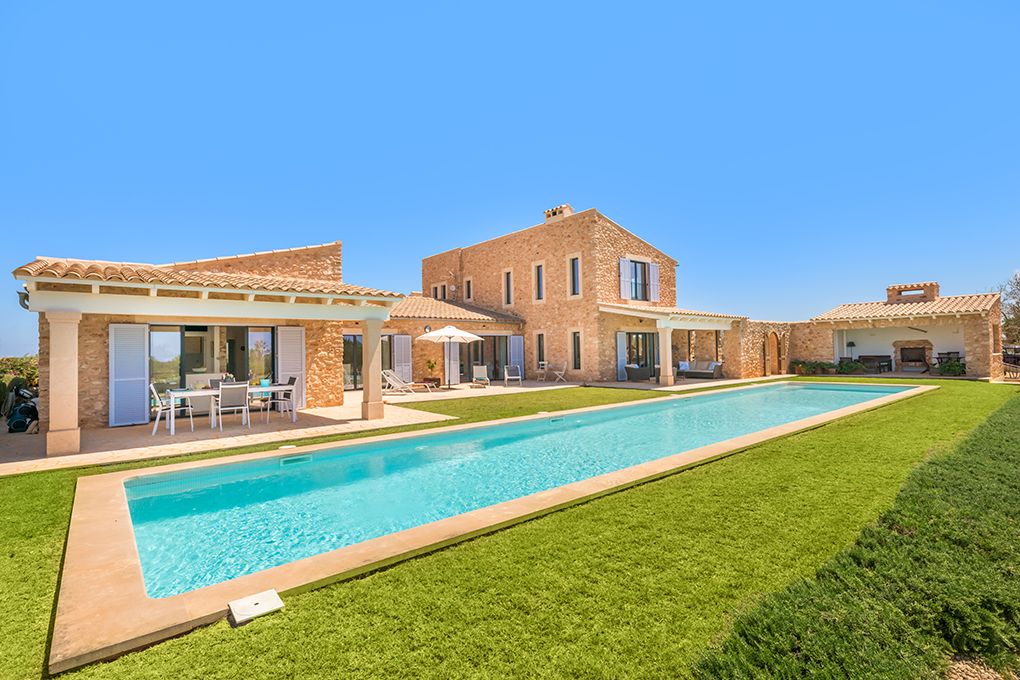 Op een perceel van ongeveer 14.200 m² vind je deze moderne finca, ingericht met veel aandacht voor detail. Het maakt indruk met zijn mediterrane ontwerp met ramen van vloer tot plafond door het hele huis en biedt een sensationeel 360° uitzicht op de natuur tot aan de zee. De begane grond heeft een open woon/eetkamer met open haard en een volledig uitgeruste moderne keuken, die in directe verbinding staat met de eetkamer. Vanaf hier heb je toegang tot een terras, een heerlijke plek om van zonsondergangen te genieten. Deze verdieping wordt gecompleteerd door twee slaapkamers met eigen badkamer. Boven vind je de hoofdslaapkamer met en-suite badkamer, kleedruimte en prachtig uitzicht tot aan het eiland Cabrera en de Middellandse Zee in de ene richting en het Tramuntana-gebergte in de andere. Verder is er nog een kamer met badkamer en suite, die kan worden gebruikt als kantoor of slaapkamer. Vloerverwarming zorgt voor een aangenaam binnenklimaat, zelfs op koelere dagen. In de goed onderhouden tuin vind je het zwembad van 4 x 20 m en gedeeltelijk overdekte terrassen met barbecue, waar je kunt genieten van ontspannende uren met familie en vrienden. Vanuit de garage, die plaats biedt aan twee voertuigen, heb je ook direct toegang tot het huis. Het populaire dorp SesSalines en Santanyì met de wekelijkse markt, talloze restaurants, cafés en winkelmogelijkheden zijn met de auto in een paar minuten te bereiken.