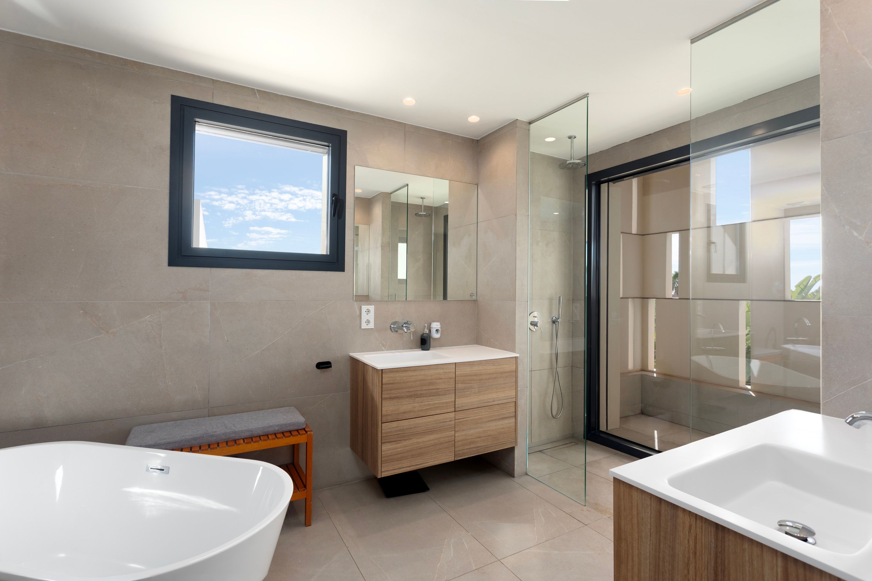 In het souterrain bevinden zich de dubbele garage, een ruime wasruimte, de technische ruimte en een gasten- of personeelsslaapkamer met en-suite badkamer. De begane grond maakt indruk met een open keuken en aangrenzende eethoek, een lichte woonkamer en twee tweepersoonsslaapkamers die een badkamer delen. Vanaf hier heb je direct toegang tot het overdekte terras, de tuin en het zwembad. Op de bovenverdieping is de ruime ouderslaapkamer met kleedkamer en luxe eigen badkamer. Dit niveau wordt aangevuld met nog drie tweepersoonsslaapkamers, elk met een eigen badkamer, en een extra kamer die ideaal is als tv- of speelkamer.