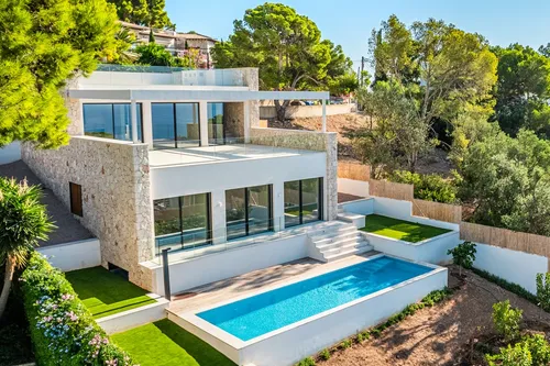 Deze nieuw gebouwde villa in Portals biedt een prachtig zuidzuidwestelijk zeezicht over de baai van Palmanova, waardoor het een ideale plek is om van 's ochtends vroeg tot 's avonds laat van de zon te genieten, terwijl het op slechts een klein eindje lopen ligt van de voorzieningen van de stad, het strand en de haven van Puerto Portals. Bij binnenkomst word je verwelkomd in de open woon-, eet- en keukenruimte, die uitkomt op een groot terras dat ideaal is voor maaltijden en zomerse barbecues met vrienden. Op de benedenverdieping vind je de hoofdslaapkamer met een prachtige eigen badkamer en nog 2 gastenslaapkamers. Vanuit alle slaapkamers is er directe toegang tot het zwembadterras en een vlakke tuin ideaal voor kinderen. Er is een grote kelder met een badkamer, ideaal voor een fitness- of wellnessruimte of een bioscoopruimte. Een ruim dakterras maakt het aanbod compleet. Kenmerken zijn vloerverwarming, airconditioning (h/c), gastentoilet, wasruimte, elektrische rolluiken en een beveiligde parkeerplaats.