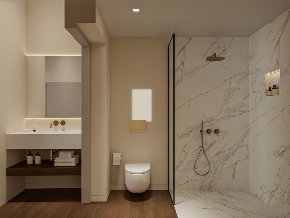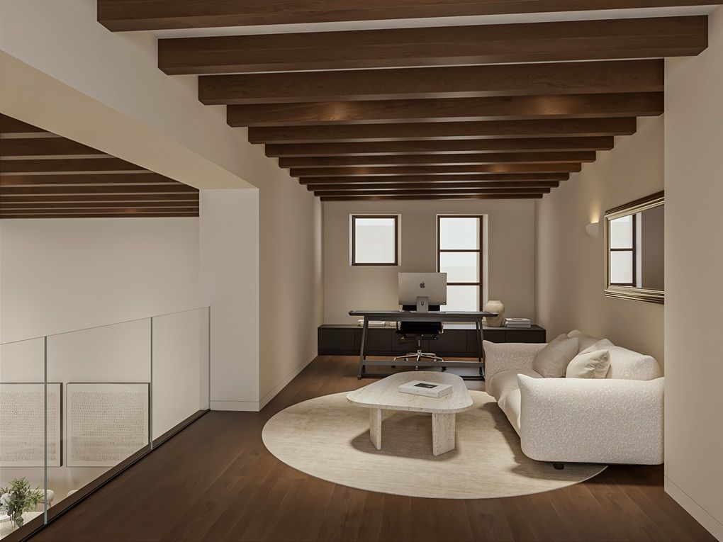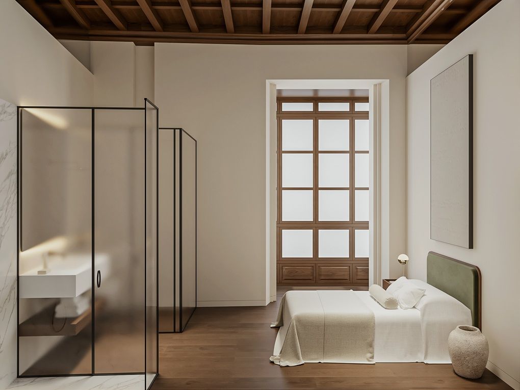 De architecten van vandaag hebben het historische gebouw omgetoverd tot een plek van pure luxe: Creu 5 | The Heritage Residences. Vijf luxe appartementen met een exclusief ontwerp, veel ruimte, licht en comfort worden er momenteel gebouwd. Historische elementen zoals een gotische trap, ronde bogen van Marés-steen, hoge ramen en artistiek ontworpen houten plafonds geven dit verder moderne pand de klassieke charme van een oud gebouw. Een elegante hal met lift en ruim trappenhuis vormt de prestigieuze entree. Deze ruime flat in een oud gebouw met drie slaapkamers en een terras maakt deel uit van een spectaculair renovatieproject in Palma. Het appartement van 215 m² met mezzanine, typisch Spaans glazen balkon en gezellig terras ligt op de eerste verdieping. Het is een echte belle étage met hoge plafonds en een mezzanine. Op de begane grond bevinden zich drie slaapkamers met eigen badkamer, een gastentoilet en een lichte woon/eetkamer met hoge plafonds en antieke houten balken. Direct aangrenzend is de keuken met toegang tot het terras met uitzicht op de tuin. Een kleine trap leidt naar een kamer die je naar eigen wens kunt inrichten - als kantoor of bibliotheek. In ieder geval is dit een exclusief ontworpen appartement met historische charme. Bars, restaurants en boetieks rond Paseo Mallorca en Avenida Jaime III en de populaire wijk Santa Catalina liggen op slechts een steenworp afstand van het gebouw.