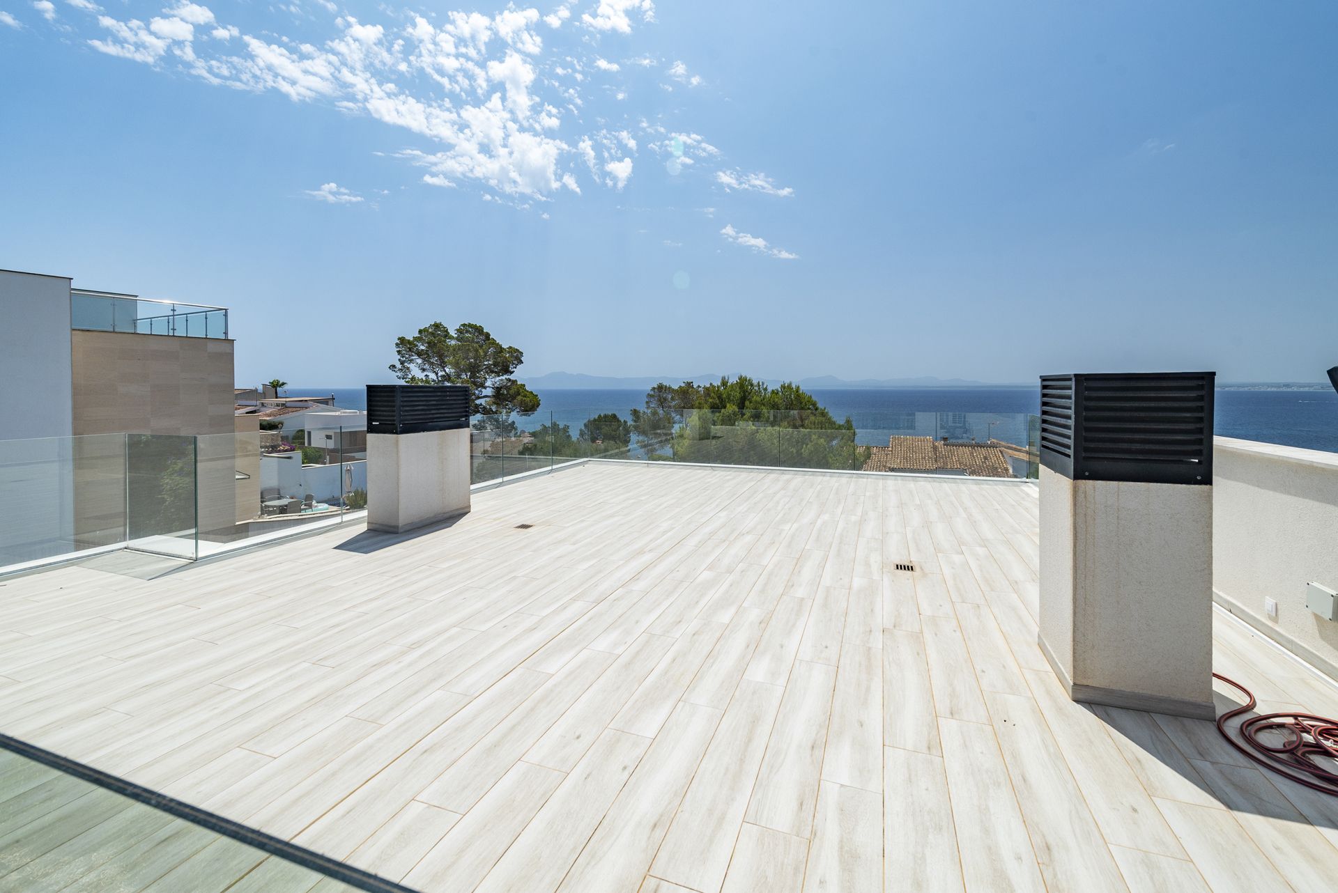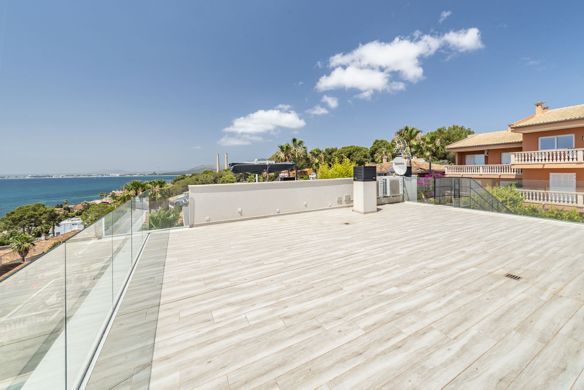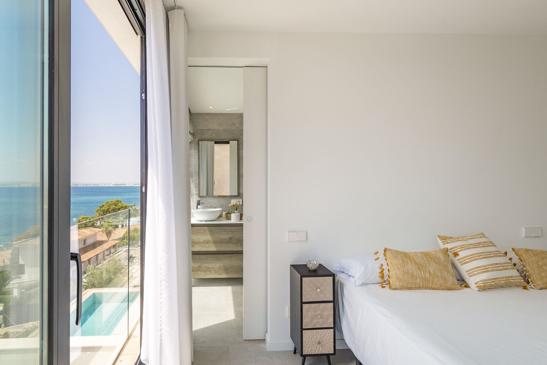 Moderne elegantie met uitzicht op zee in Alcanada. In een van de meest exclusieve gebieden in het noorden van Mallorca ligt deze verfijnde woning in Alcanada, naast een van de meest prestigieuze golfbanen van het eiland en op slechts een korte wandeling van de charmante haven van Alcúdia. Deze woning is gebouwd in 2020 en combineert minimalistische lijnen perfect met traditionele architecturale elementen, zoals de majestueuze natuurstenen trap die van de straat naar de hoofdingang leidt.