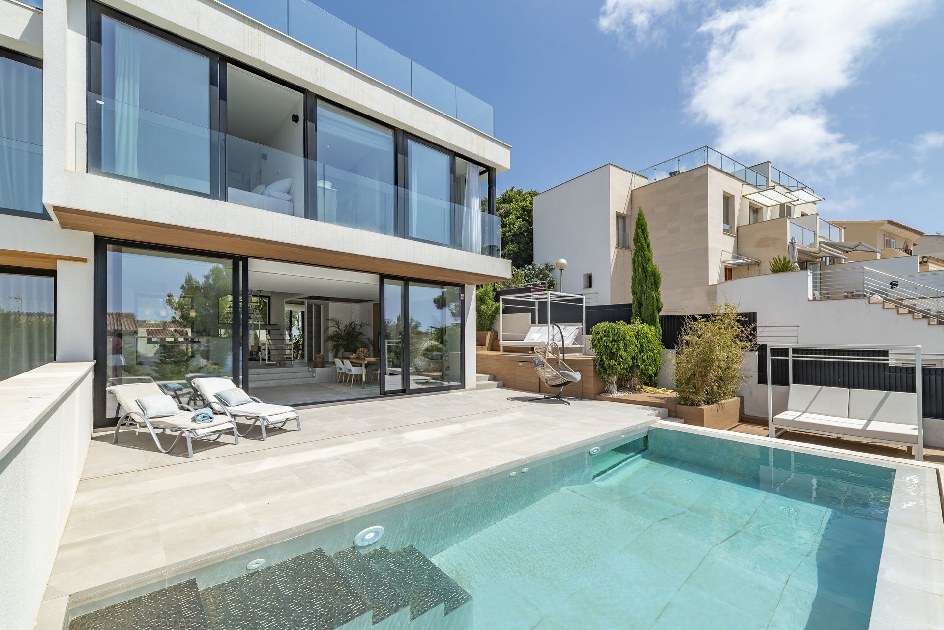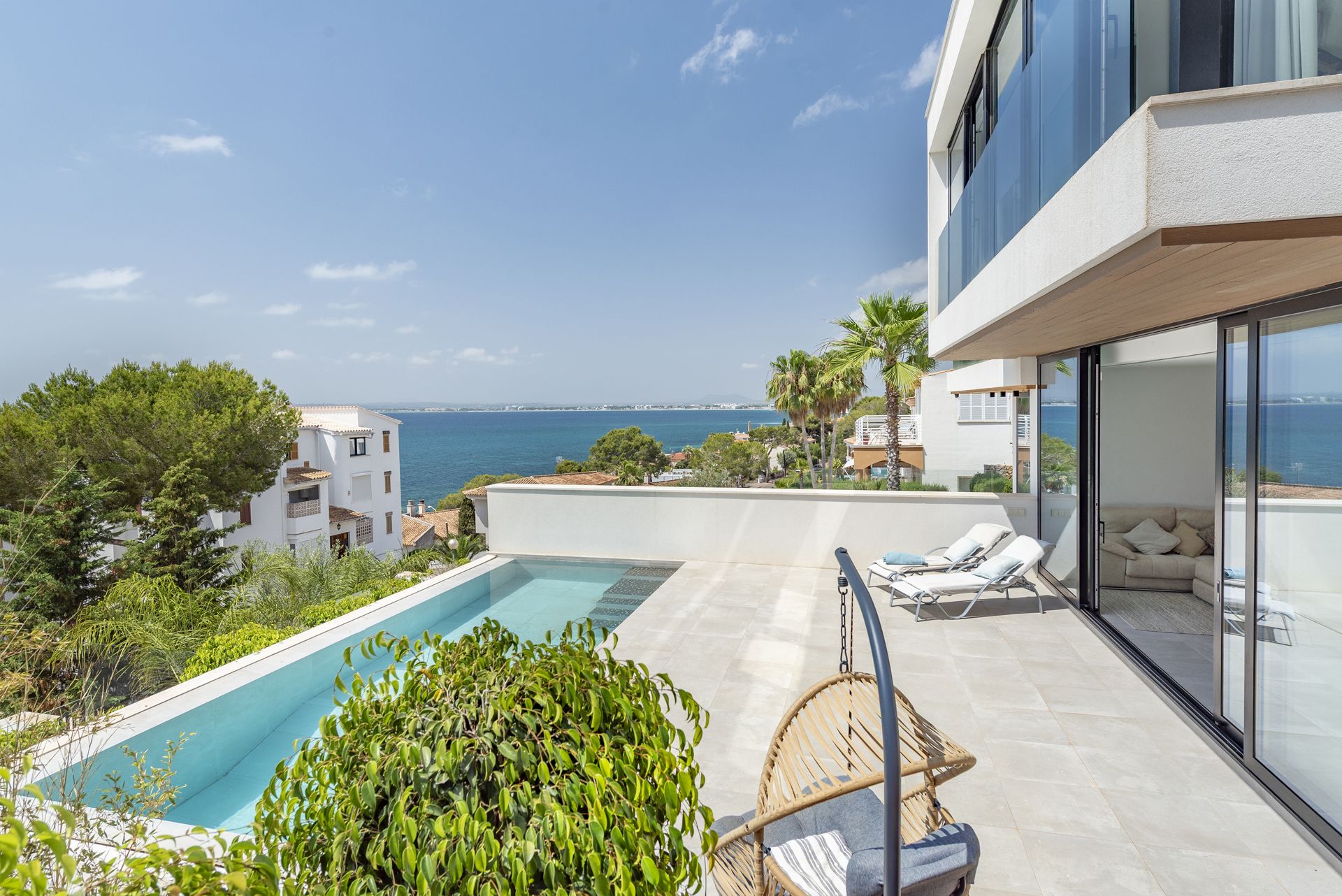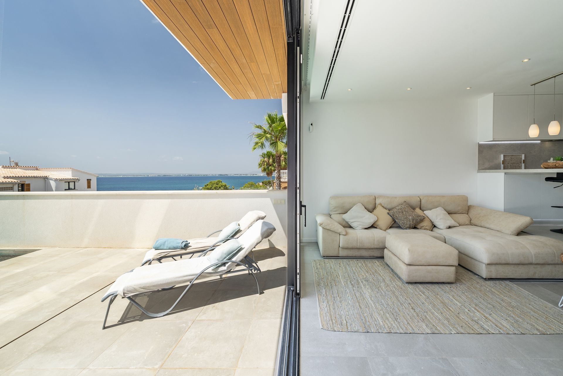 Grote schuiframen overspoelen de kamer met natuurlijk licht en verbinden het interieur op harmonieuze wijze met het prachtige overdekte terras. Deze buitenruimte, ontworpen als een natuurlijk verlengstuk van de woonkamer, wordt het echte middelpunt van het huis, ideaal om te ontspannen voor het spectaculaire turkooisblauwe zwembad en te genieten van de mediterrane levensstijl op de zonnigste dagen.