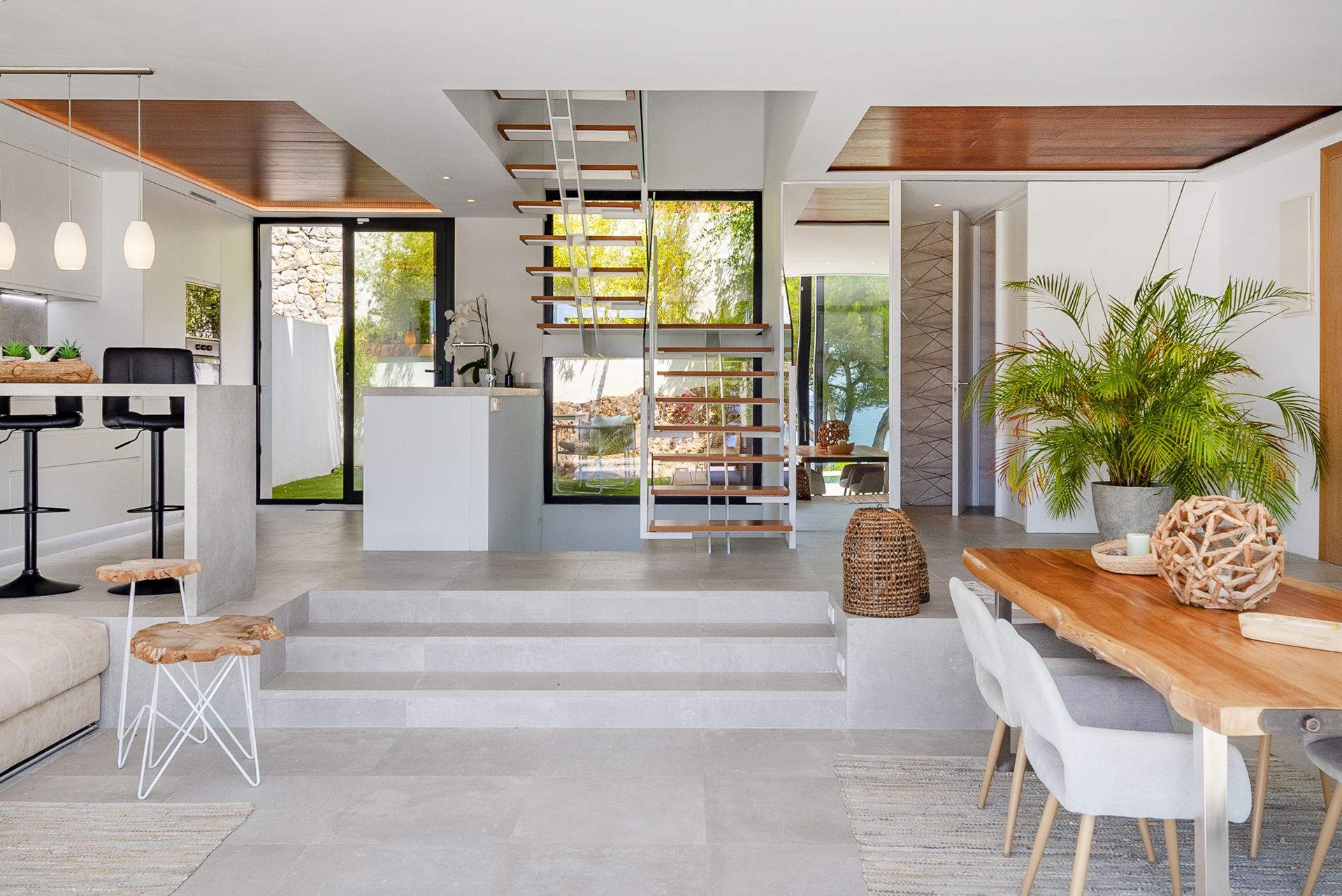 Dankzij de bevoorrechte, verhoogde ligging op de heuvel geniet het huis van betoverend uitzicht op zee en ongeëvenaarde privacy. Op de hoofdverdieping leidt een elegante ontvangstruimte met ingebouwde garderobe en gastentoilet naar een volledig ingerichte designkeuken met hoogwaardige apparatuur. Een eigentijdse open haard fungeert als scheiding tussen de keuken en de iets verhoogde, ruime woon-eetkamer en creëert een gezellige en verfijnde sfeer.
