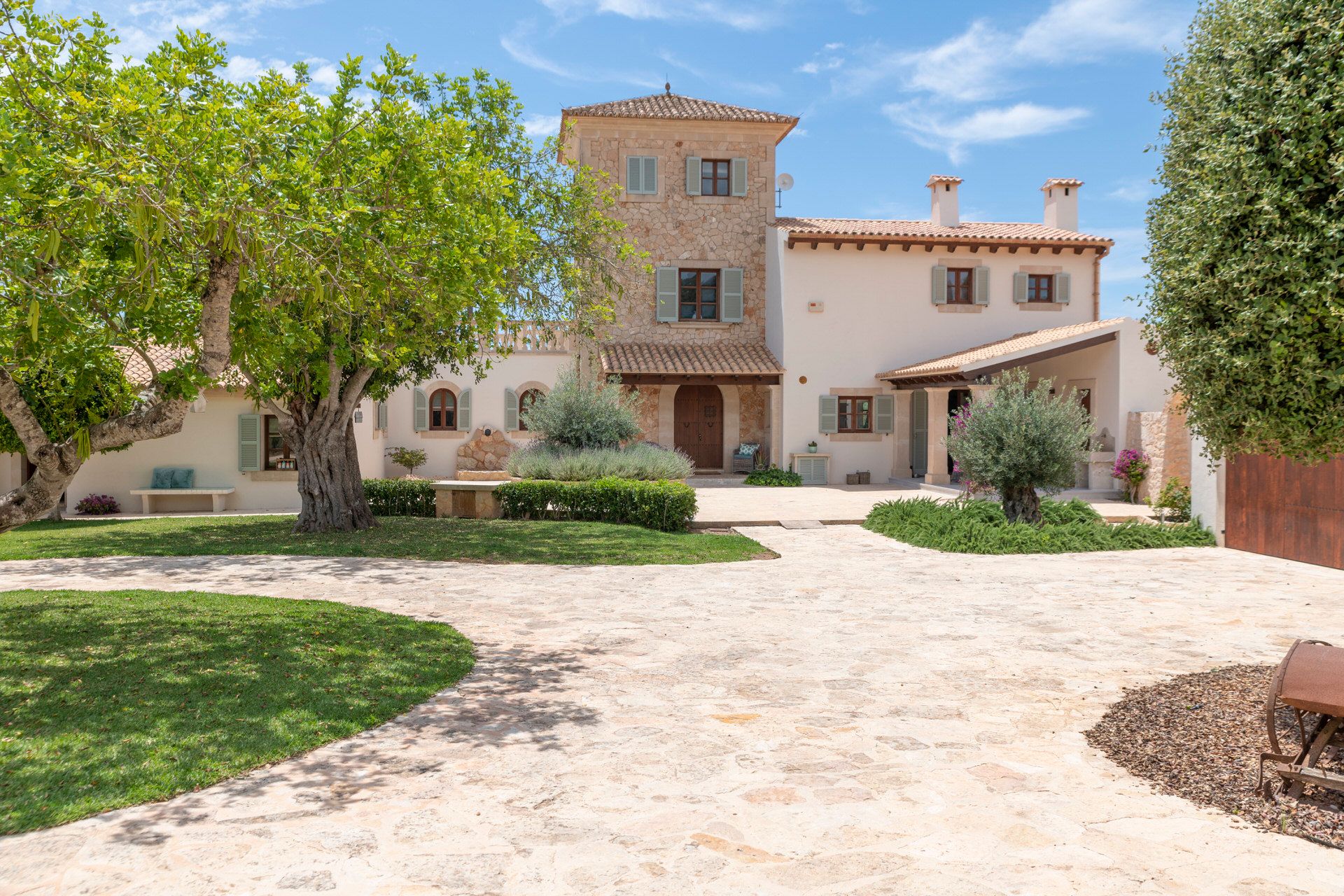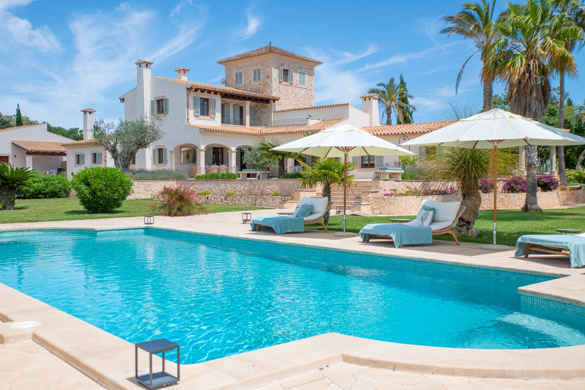 Ta prestiżowa nieruchomość położona jest między Cas Concos i Felanitx na działce o powierzchni ok. 27 000 m² i jest dostępna zarówno na wynajem sezonowy (od 32 dni), jak i długoterminowy. Finca została odnowiona w wysokim standardzie w 2023 roku i urządzona z wielką dbałością o szczegóły. Na parterze głównego domu znajduje się przestronna kuchnia z kominkiem i wyjściem na zadaszony taras, salon z kominkiem, również z wyjściem na taras, dwuosobowa sypialnia z kominkiem i łazienką, a także kolejna sypialnia jednoosobowa i toaleta dla gości. Do głównego domu przylega oddzielne mieszkanie dla gości z własnym wejściem. Znajduje się tu salon z kuchnią na otwartym planie, dwie sypialnie i dwie łazienki. Na piętrze znajduje się główna sypialnia z kominkiem, garderobą, łazienką i dostępem do zadaszonego tarasu. Na 2. piętrze znajduje się również wieża o powierzchni 20 m² ze wspaniałym panoramicznym widokiem na górę klasztorną San Salvador i górę Randa. Ogrzewanie podłogowe gwarantuje przyjemny klimat nawet w chłodniejsze dni. W gorące letnie dni odpowiednie chłodzenie zapewniają nowo zainstalowane klimatyzatory typu split. W ogrodzie w stylu śródziemnomorskim znajdują się liczne palmy i drzewa oliwne, basen ze słoną wodą o powierzchni około 78 m² oraz domek przy basenie o powierzchni 60 m², który idealnie nadaje się do zakwaterowania gości. Obejmuje on salon z kuchnią na otwartym planie, sypialnię i łazienkę z prysznicem. Cała nieruchomość emanuje ciepłą atmosferą, odrobina elegancji i uroku przenika każdy zakątek. Liczne tarasy są rozmieszczone wokół domu, oferując indywidualne i osobiste rekolekcje. Garaż ma miejsce na 4 pojazdy. Dom jest podłączony do publicznej sieci elektrycznej i wodnej, a także posiada dwie cysterny. Ten imponujący wiejski dom jest prawdziwą ostoją spokoju i relaksu. Zwierzęta są akceptowane na życzenie. Przyjdź i przekonaj się sam!