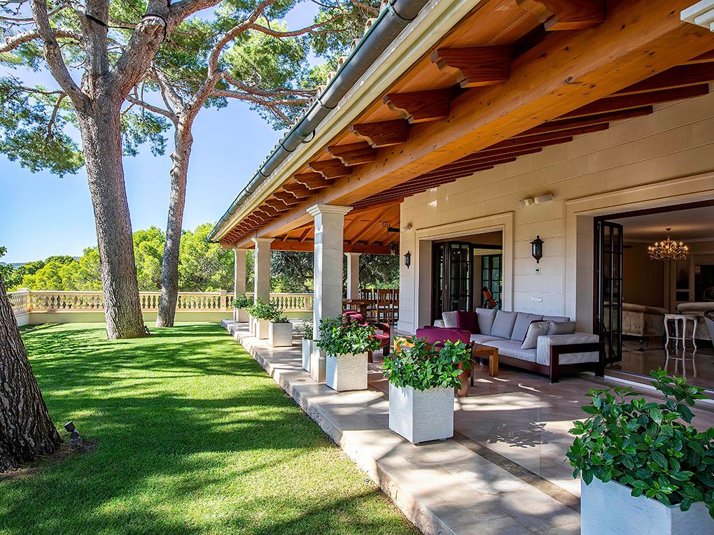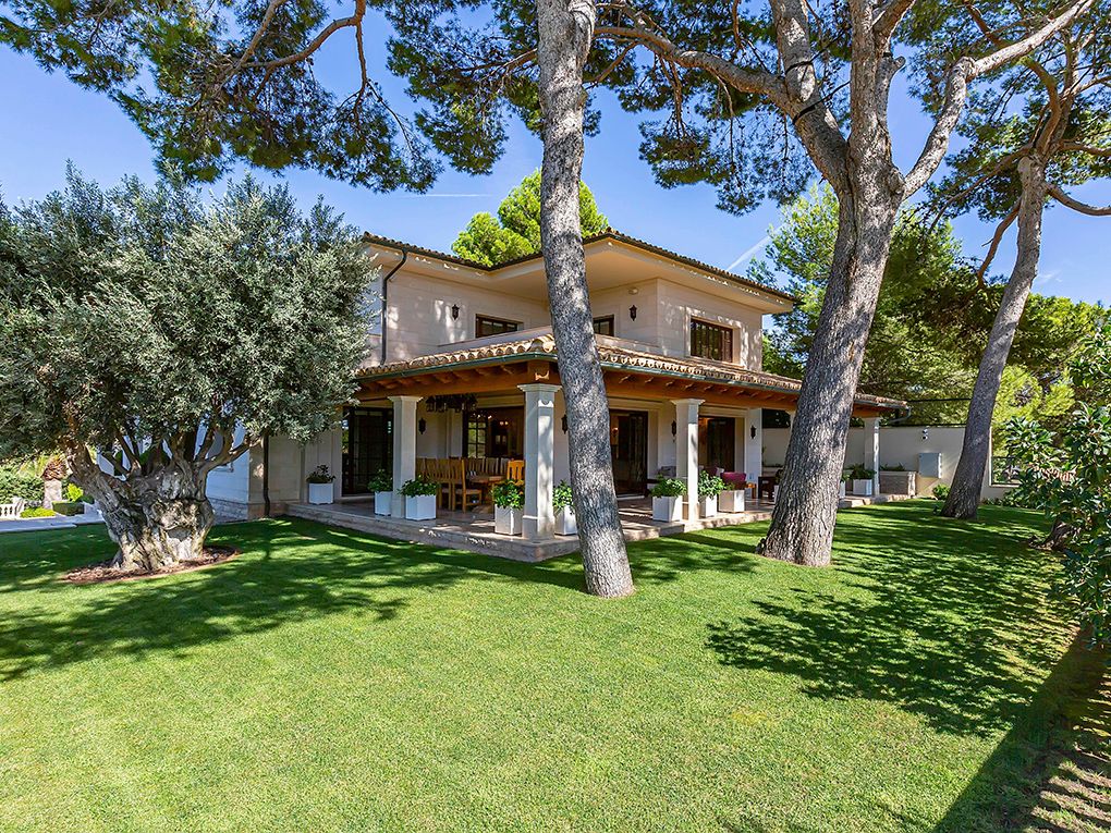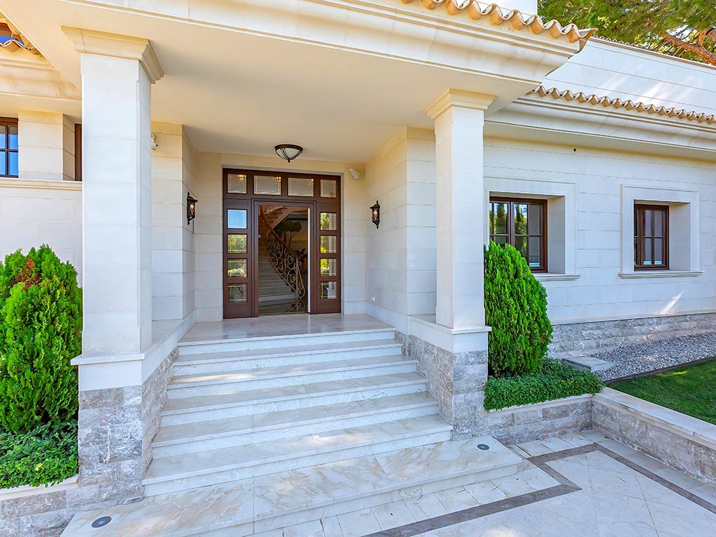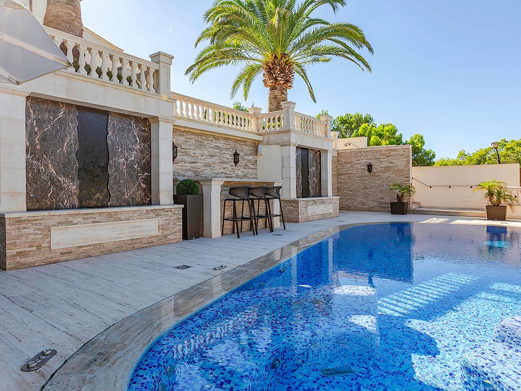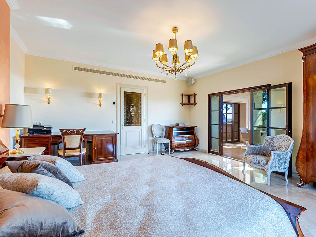Luksusowa trzypiętrowa willa z widokiem na morze i góry położona jest w spokojnej okolicy w południowo-zachodniej części miasta, w odległości krótkiego spaceru od pięknej piaszczystej plaży i bulwaru Paguera z licznymi restauracjami, kawiarniami i sklepami. Dom został zbudowany z najlepszych materiałów w klasycznym stylu i wyposażony w jasne, wykonane na zamówienie włoskie meble. Na parterze znajduje się salon z kominkiem i przestronnym zadaszonym tarasem, jadalnia, kuchnia, dwie sypialnie z łazienkami, toaleta dla gości i pralnia. Na pierwszym piętrze znajdują się cztery kolejne sypialnie z łazienkami, pokój gier i trzy kolejne tarasy z widokiem na morze i góry. W piwnicy znajduje się przestronny garaż na trzy samochody, sauna i pomieszczenia gospodarcze. Atrakcje willi obejmują ogród i basen z adaptacyjnym oświetleniem krajobrazu, barem, podgrzewanym basenem, jacuzzi i systemem muzycznym. Dodatki obejmują technologię inteligentnego domu, ogrzewanie podłogowe, windę, system osmozy i uzdatniania wody, klimatyzację i system bezpieczeństwa.