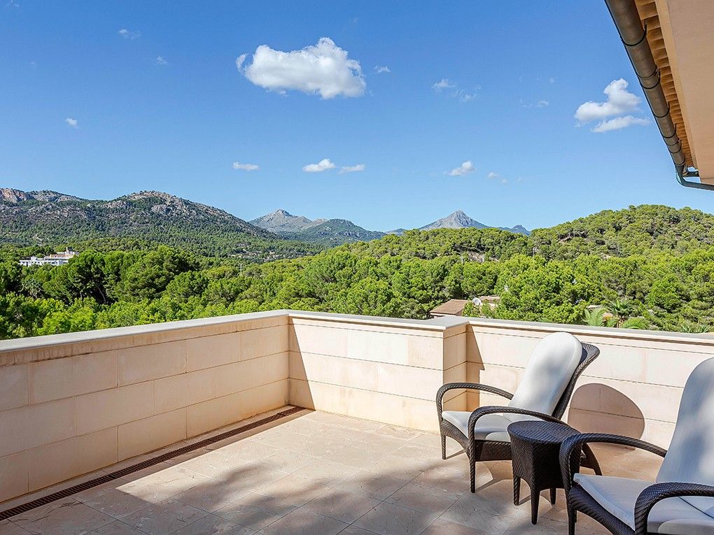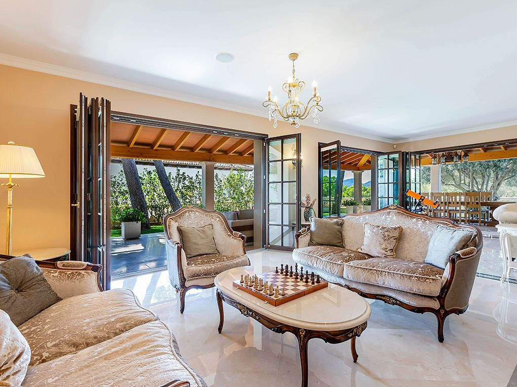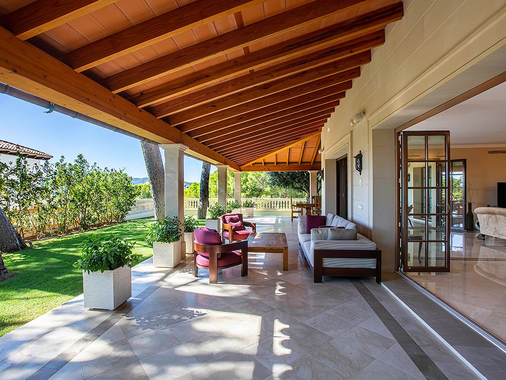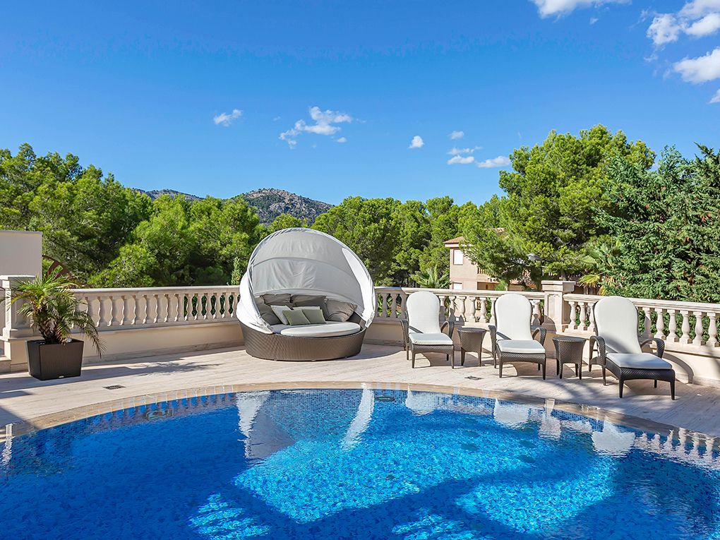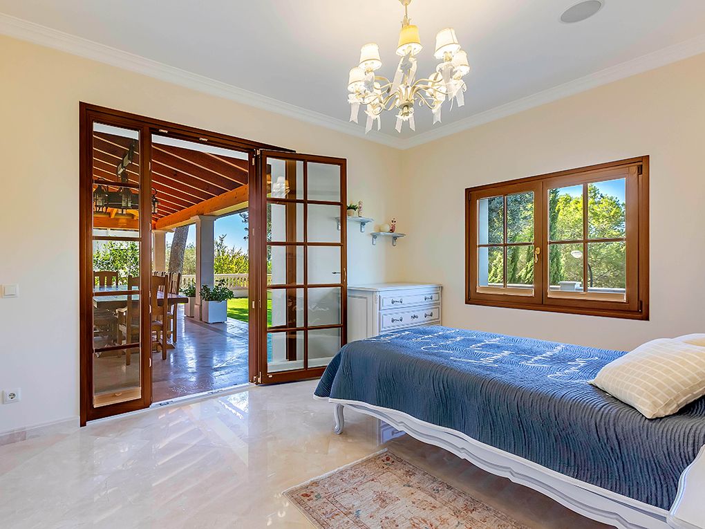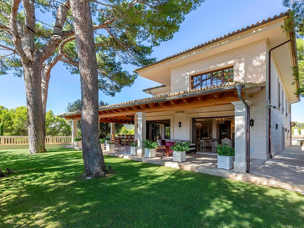 Luksusowa trzypiętrowa willa z widokiem na morze i góry położona jest w spokojnej okolicy w południowo-zachodniej części miasta, w odległości krótkiego spaceru od pięknej piaszczystej plaży i bulwaru Paguera z licznymi restauracjami, kawiarniami i sklepami. Dom został zbudowany z najlepszych materiałów w klasycznym stylu i wyposażony w jasne, wykonane na zamówienie włoskie meble. Na parterze znajduje się salon z kominkiem i przestronnym zadaszonym tarasem, jadalnia, kuchnia, dwie sypialnie z łazienkami, toaleta dla gości i pralnia. Na pierwszym piętrze znajdują się cztery kolejne sypialnie z łazienkami, pokój gier i trzy kolejne tarasy z widokiem na morze i góry. W piwnicy znajduje się przestronny garaż na trzy samochody, sauna i pomieszczenia gospodarcze. Atrakcje willi obejmują ogród i basen z adaptacyjnym oświetleniem krajobrazu, barem, podgrzewanym basenem, jacuzzi i systemem muzycznym. Dodatki obejmują technologię inteligentnego domu, ogrzewanie podłogowe, windę, system osmozy i uzdatniania wody, klimatyzację i system bezpieczeństwa.