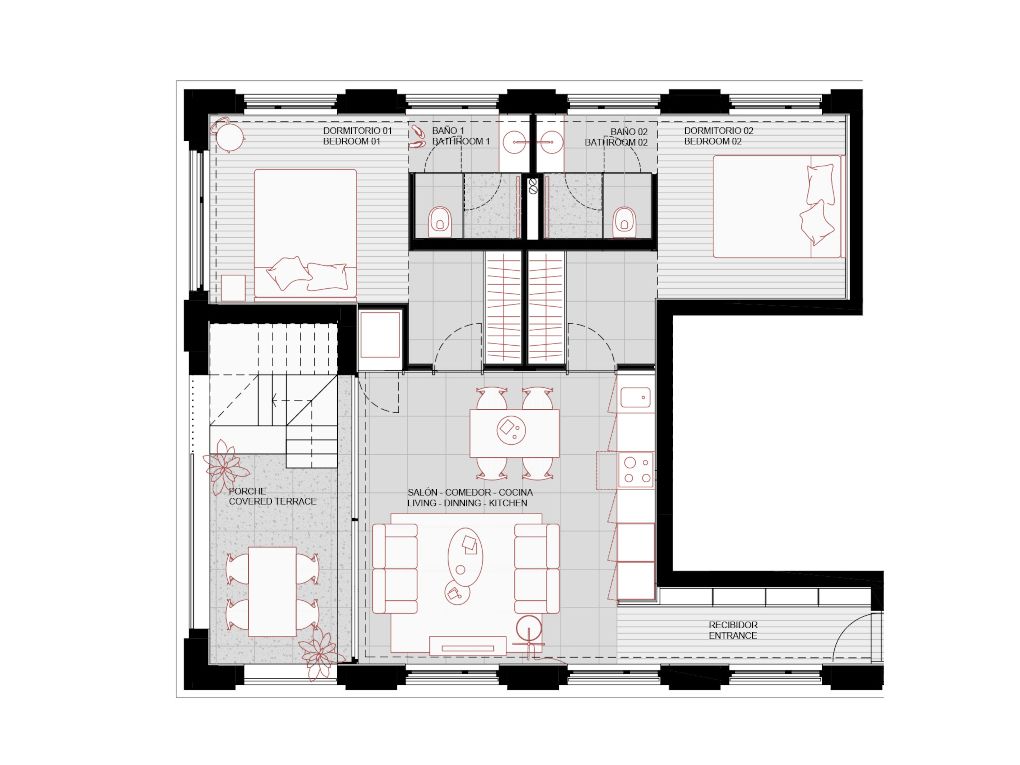 Nowoczesny kompleks mieszkaniowy "Bellver Place" z 8 apartamentami i 2 penthouse'ami oraz małym basenem komunalnym znajduje się w dzielnicy Son Armadams w Palmie, zaledwie kilka minut spacerem od pięknego zamku Bellver i rozległego zielonego parku, który go otacza. Port w Palmie, modna dzielnica Santa Catalina i centrum miasta również znajdują się w odległości krótkiego spaceru. Różne sklepy i restauracje znajdują się tuż przy drzwiach. Atrakcyjna architektura i design, wykorzystujące głównie naturalne materiały, a także stolarka na elewacji, wraz z piękną roślinnością, tworzą małą oazę w mieście. Na każdym piętrze budynku znajdują się 2 apartamenty, z których wszystkie oferują salon i jadalnię na otwartym planie ze zintegrowaną kuchnią, oknami sięgającymi od podłogi do sufitu i dostępem do tarasu. Centralnym punktem dwóch penthouse'ów jest prywatny taras na dachu z basenem i częścią wypoczynkową. Wszystkie apartamenty od pierwszego piętra mają 2 dwuosobowe sypialnie z łazienkami, z których co najmniej jedna ma również dostęp do tarasu. Apartamenty na parterze wyposażone są w 1-2 sypialnie i 1-2 łazienki. Ponadto wszystkie apartamenty wyposażone są w ogrzewanie podłogowe, klimatyzację, oświetlenie pośrednie i dębową stolarkę wewnętrzną. Porcelanowe podłogi o wyglądzie mikrocementu oraz designerskie kuchnie i łazienki pochodzą od renomowanej firmy Porcelanosa. W cenę wliczona jest również komórka lokatorska dla każdego apartamentu oraz miejsce parkingowe dla penthouse'ów. Dla pozostałych apartamentów istnieje możliwość dokupienia miejsca postojowego w garażu podziemnym.