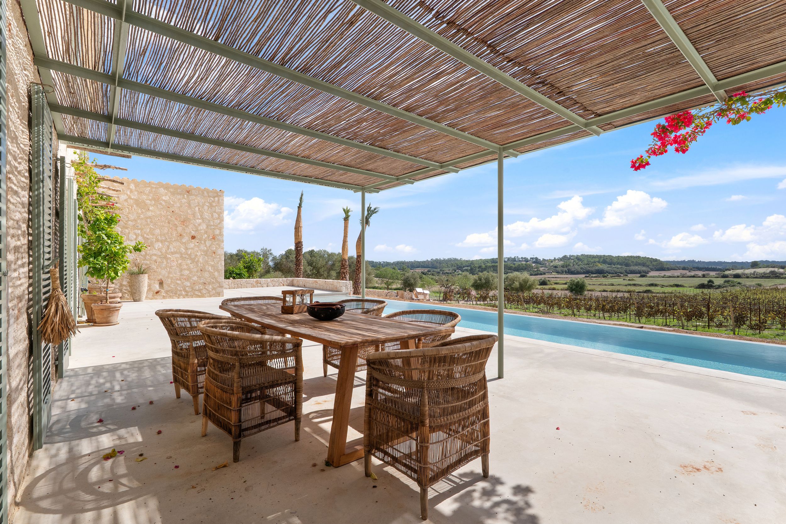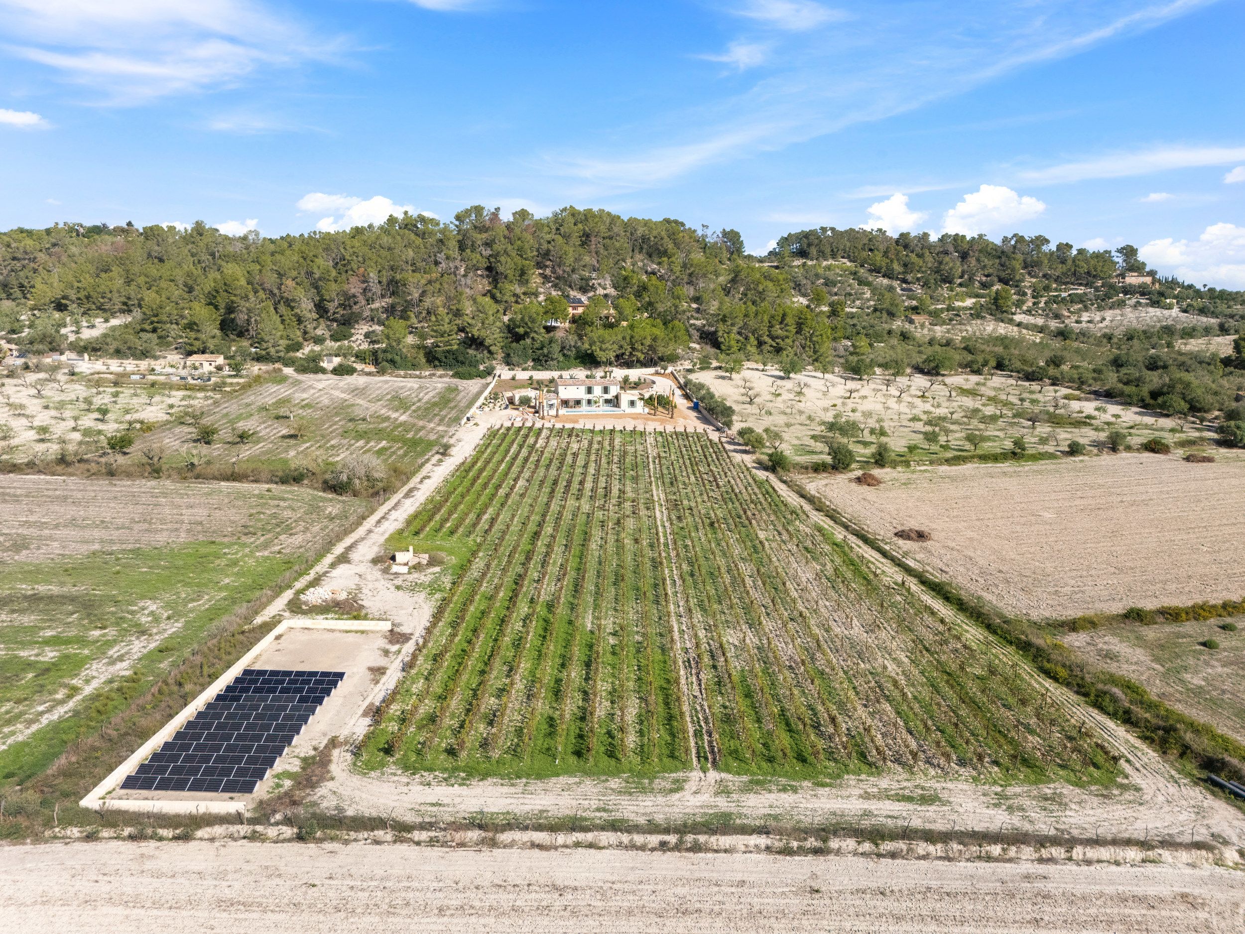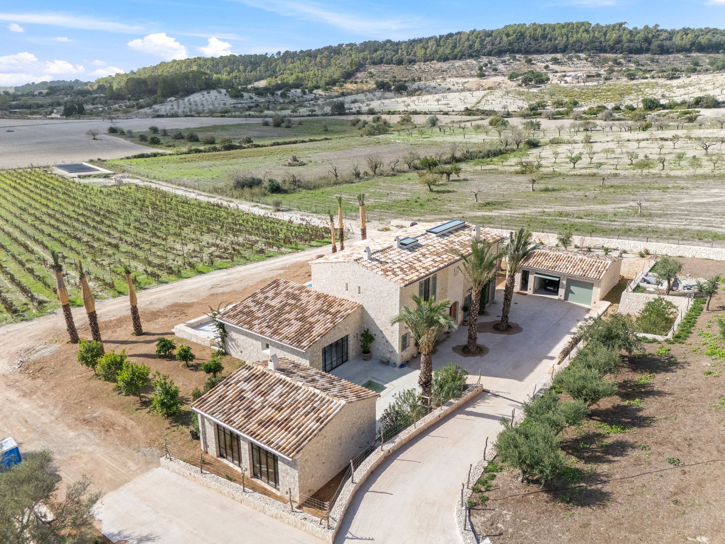 Otoczony piękną przyrodą Majorki, na cichej i prywatnej działce w pobliżu Montuiri, budowany jest ten piękny wiejski dom, który został zaprojektowany przez znanego architekta z Majorki. Nieruchomość składa się z głównego domu i dwóch oddzielnych budynków gospodarczych. Główny dom ma dwa piętra i łącznie 5 sypialni, każda z własną łazienką. Na parterze znajduje się przestronny salon i jadalnia połączona z kuchnią. Znajduje się tam również główna sypialnia z garderobą i kolejna sypialnia. Na pierwszym piętrze znajduje się kolejny przestronny salon i dwie sypialnie, z których można podziwiać niesamowite widoki na okolicę i winnice. W jednym z budynków gospodarczych, do którego prowadzi piękny dziedziniec, znajduje się kolejna sypialnia. Po przeciwnej stronie znajduje się garaż, pralnia i maszynownia. Najważniejszym punktem nieruchomości jest teren zewnętrzny z pięknym ogrodem otaczającym nieruchomość i basenem, z którego można podziwiać panoramiczny widok na rozległy krajobraz i winnicę. Należy podkreślić, że finca będzie miała wyraźny majorkański charakter, co znajduje odzwierciedlenie w ogromnych ścianach z naturalnego kamienia. Jest samowystarczalna i posiada panele słoneczne do zasilania w energię elektryczną, własną studnię, ogrzewanie podłogowe z energią aerotermalną i klimatyzację kanałową - w sumie wymarzona luksusowa nieruchomość, która zaprasza do korzystania z majorkańskiego stylu życia.
