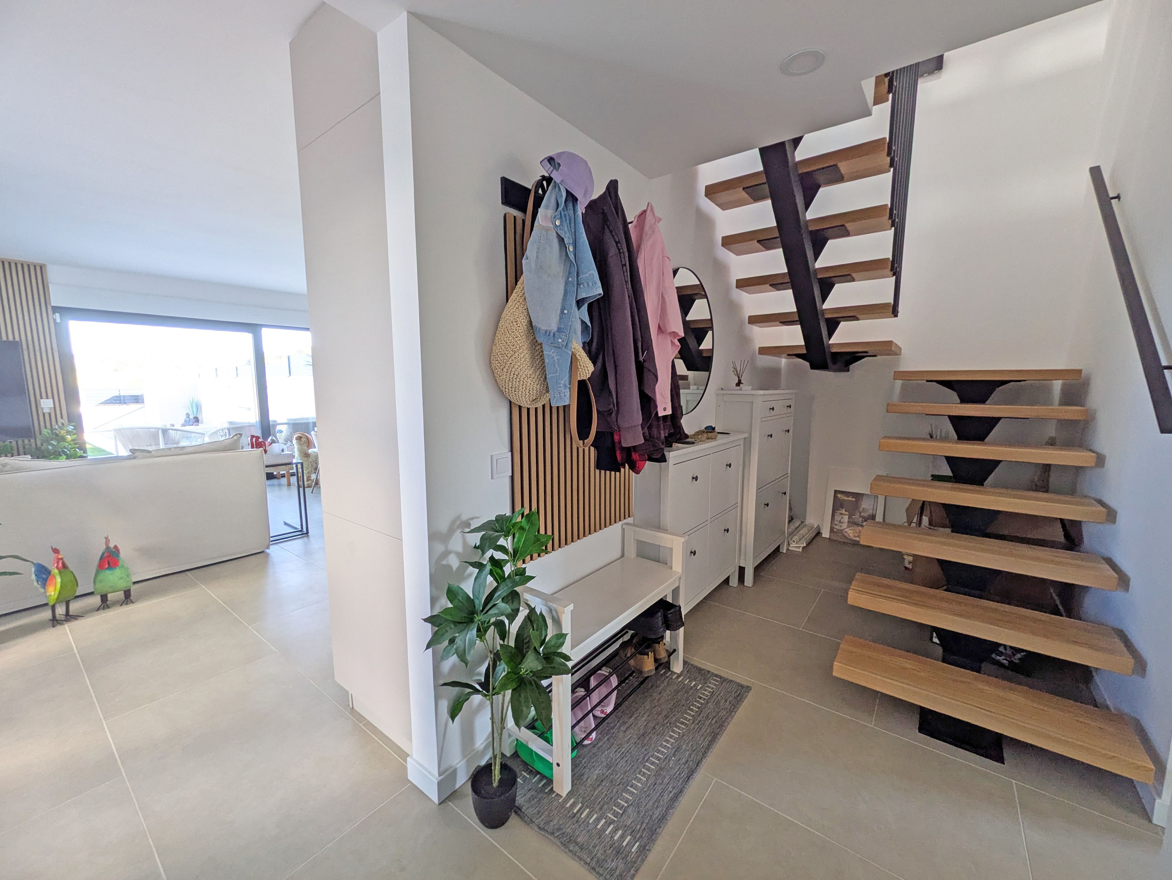 Nieruchomość rozciąga się na parterze, pierwszym i pierwszym piętrze i ma przestronną część dzienną na otwartym planie o powierzchni do 40 m² z umeblowaną iw pełni wyposażoną kuchnią. Oferuje 4 sypialnie i 3 łazienki, w tym główną sypialnię z łazienką i garderobą. Na drugim piętrze znajduje się kolejna duża część dzienna ze wspaniałym widokiem na zatokę. W ogrodzie znajduje się prywatny basen i miejsce parkingowe z pergolą.