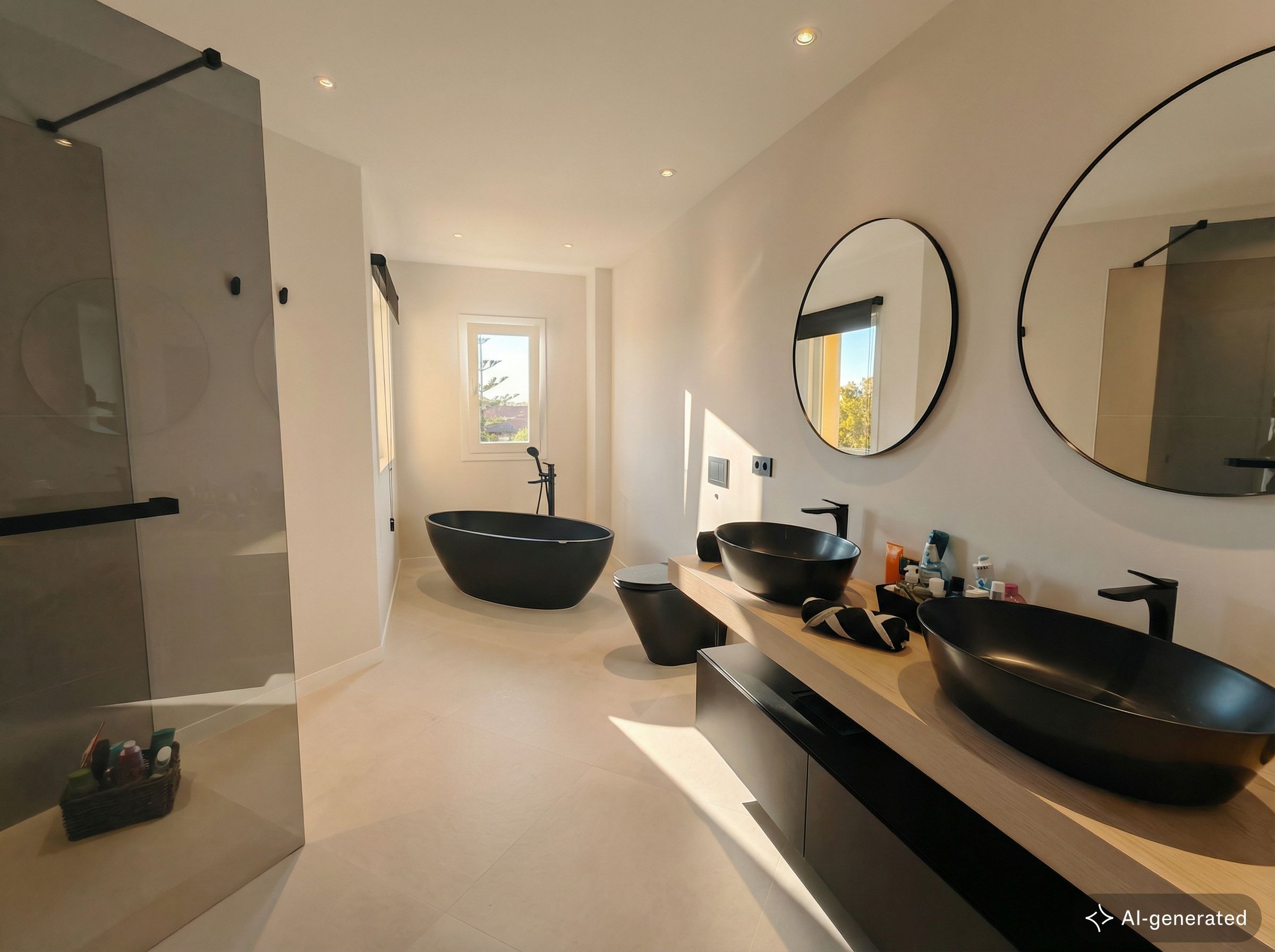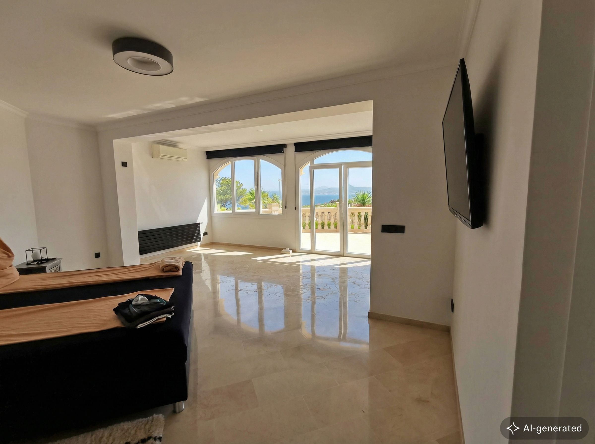 Wewnątrz znajduje się pięć jasnych pokoi, w tym cztery sypialnie. Główna sypialnia na piętrze ma elegancką łazienkę, garderobę i prywatny taras ze spektakularnym widokiem na morze i zatokę Palma. Kolejna sypialnia również oferuje prywatny taras z widokiem na morze - idealny dla gości lub dzieci.