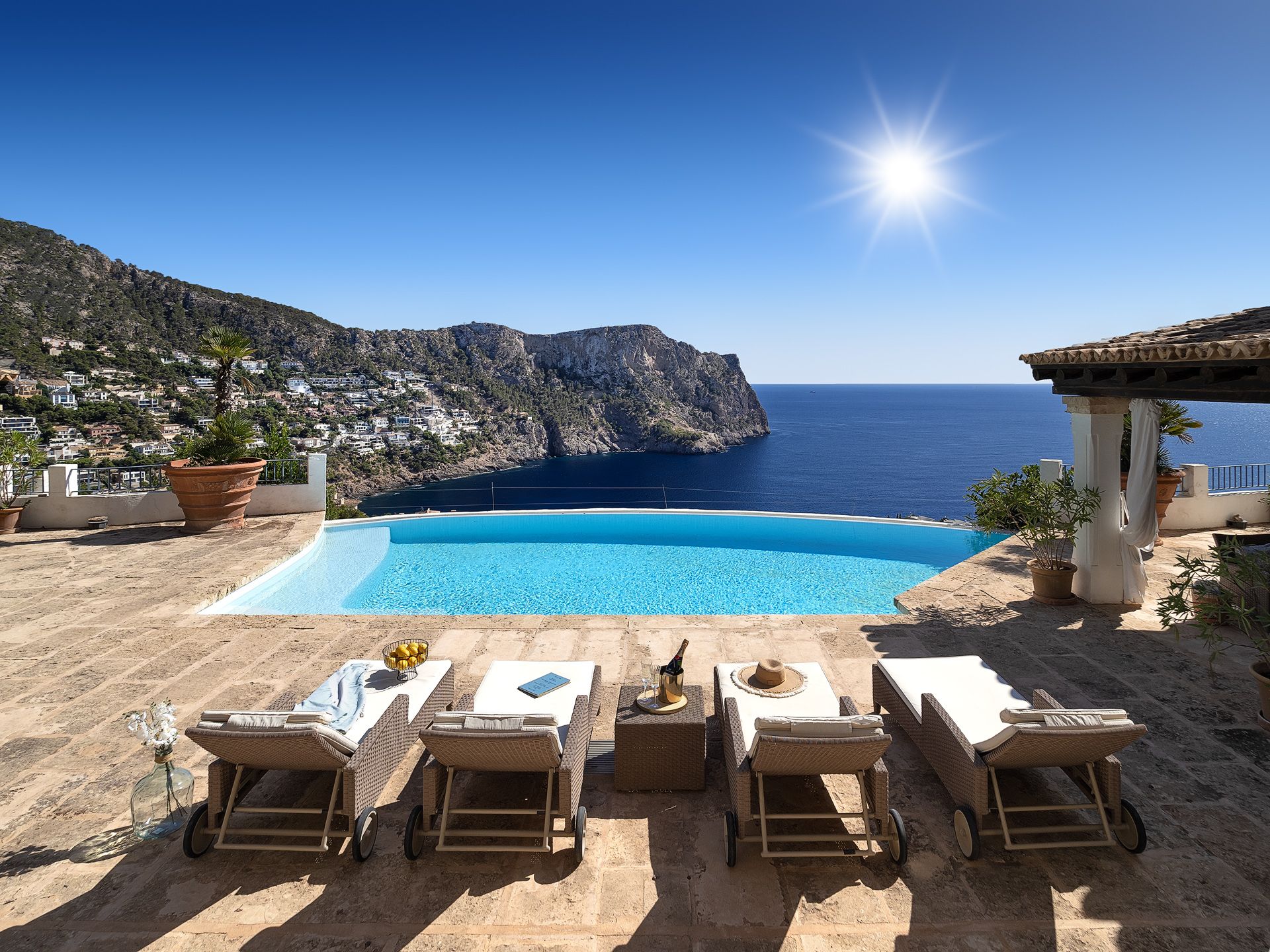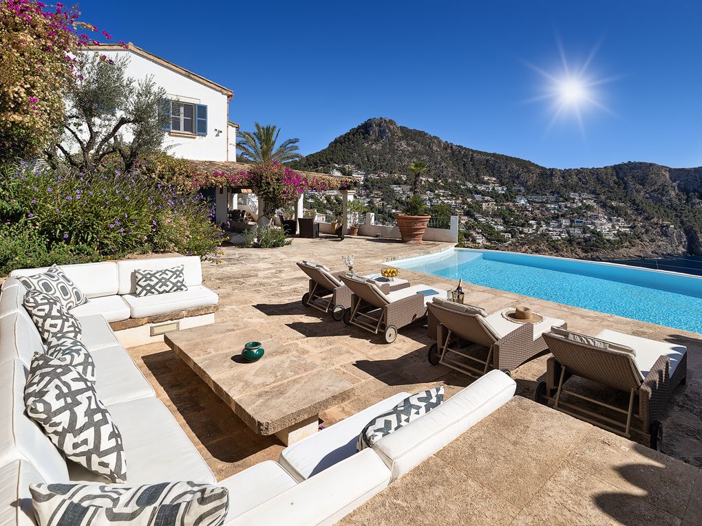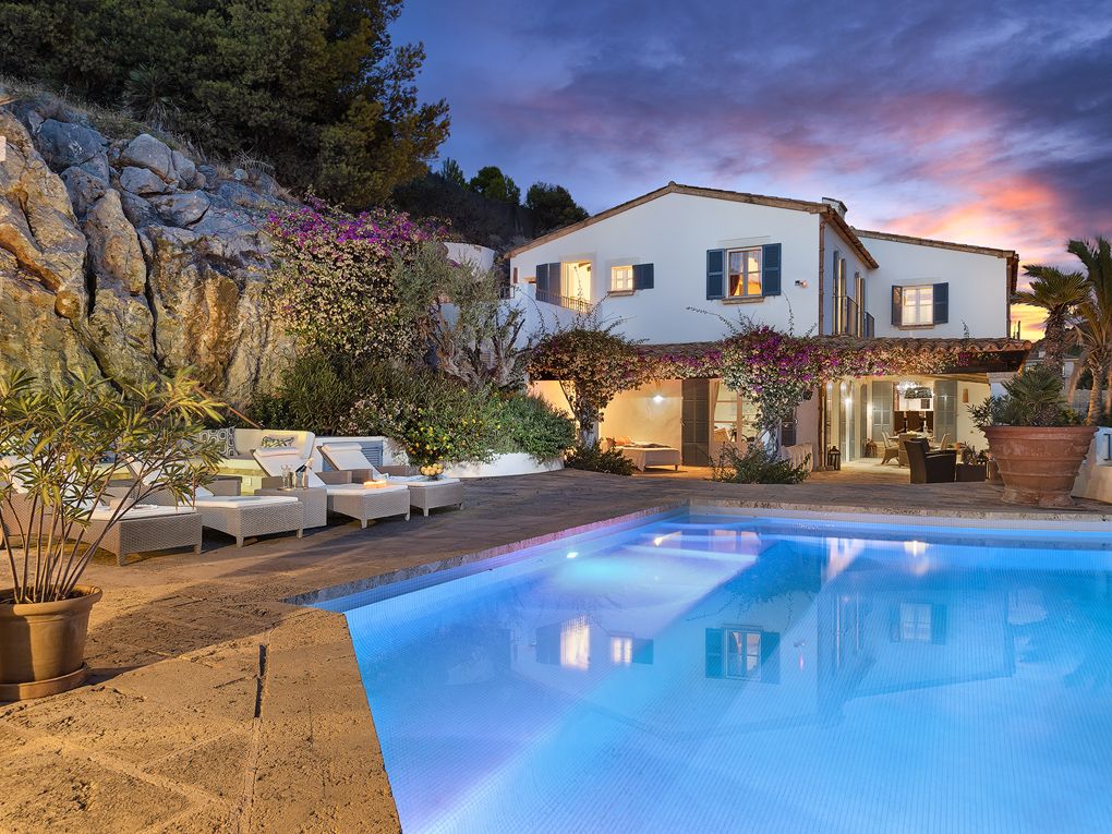 Ta tradycyjna willa w stylu finca znajduje się w jednej z najlepszych dzielnic mieszkaniowych Port Andratx, znanego naturalnego portu w południowo-zachodniej części Majorki. Działka o powierzchni ponad 2000 m² położona jest na wzgórzu i oferuje absolutną prywatność, a także panoramiczne widoki na otwarte morze aż do Ibizy. Nieruchomość ma w sumie pięć sypialni i pięć łazienek, rozmieszczonych w głównym domu i dwóch domach gościnnych. Bardzo imponujący jest duży teren zewnętrzny z grillem i basenem, śródziemnomorski ogród i wiele pięknych miejsc, które są idealne do relaksu i sprawiają, że ta nieruchomość jest idealnym domem wakacyjnym. Inne dodatki obejmują pomieszczenie gospodarcze, centralne ogrzewanie olejowe, kilka kominków, klimatyzację i podwójny garaż.
