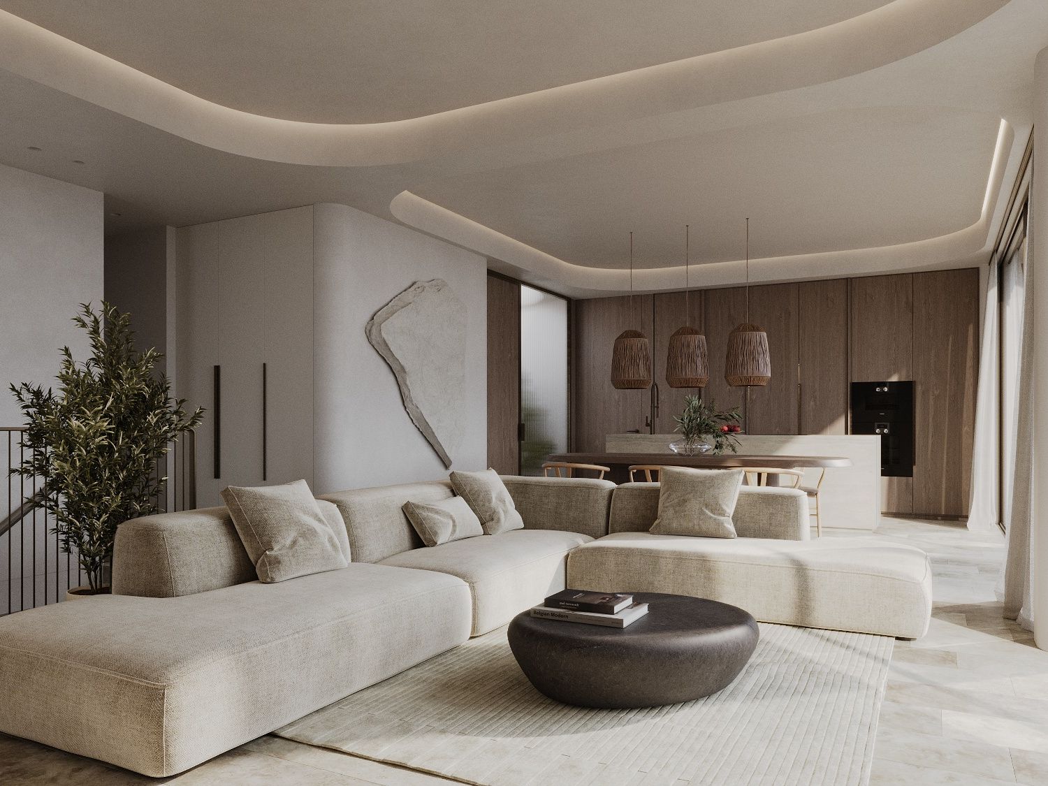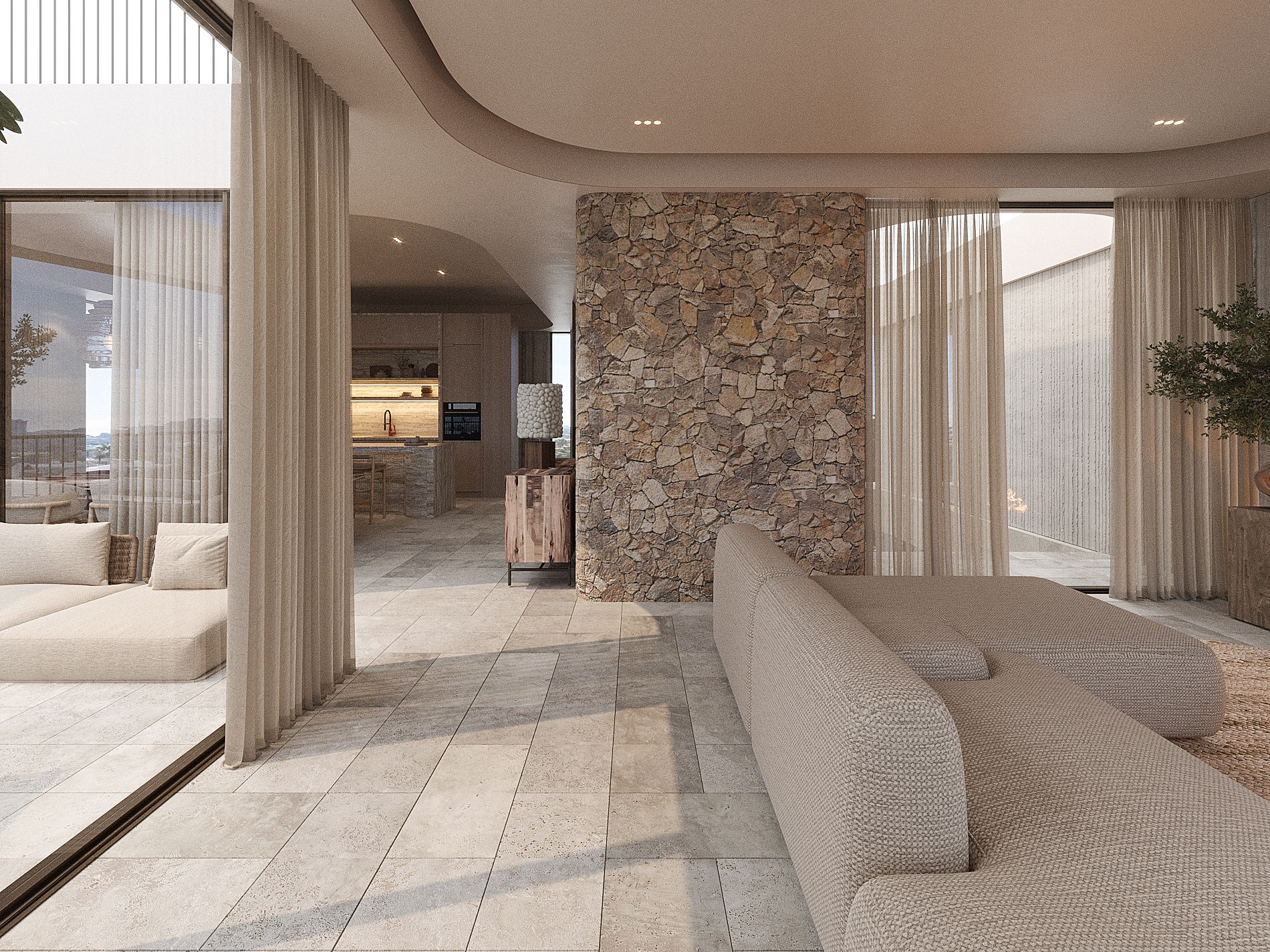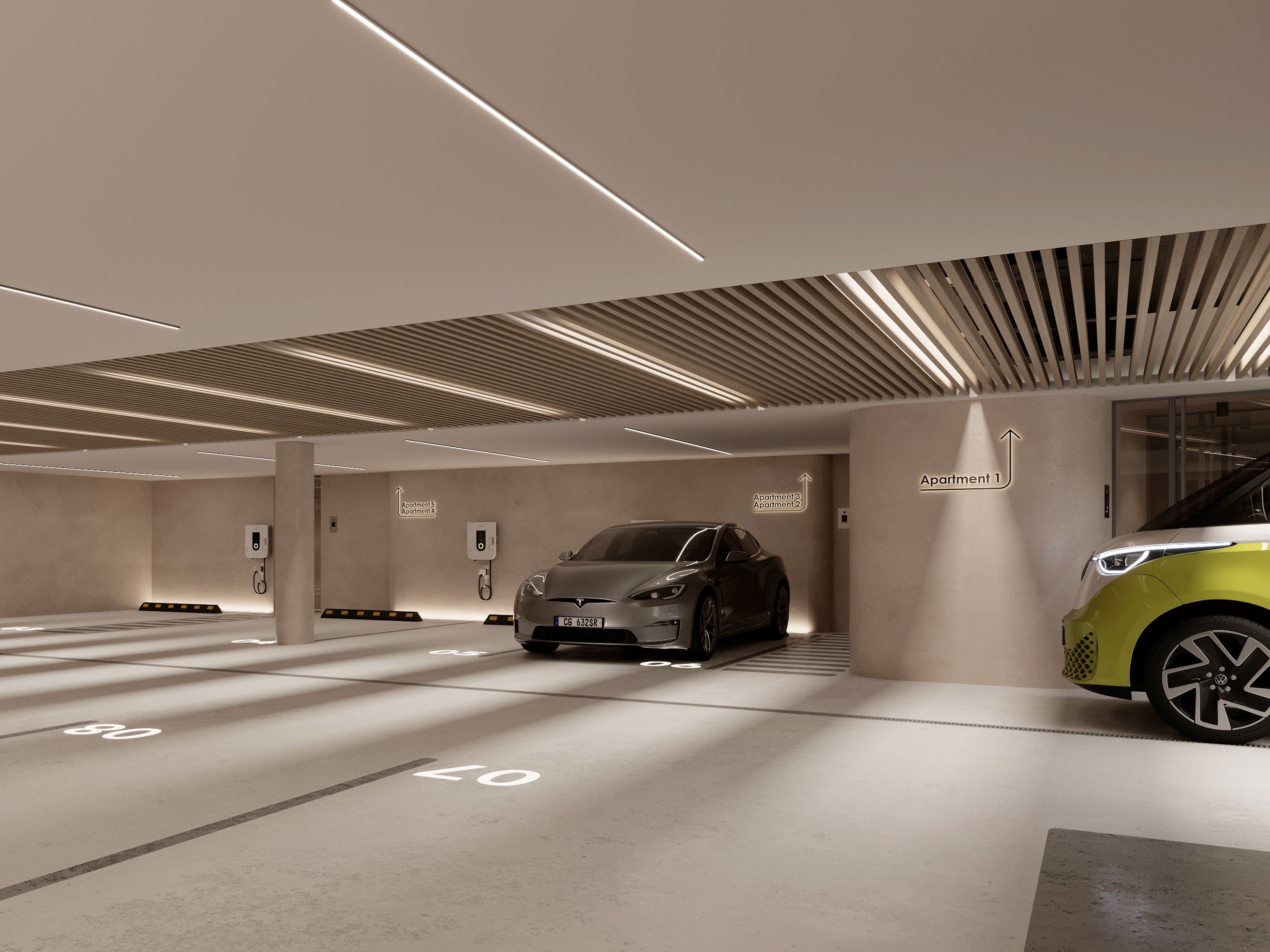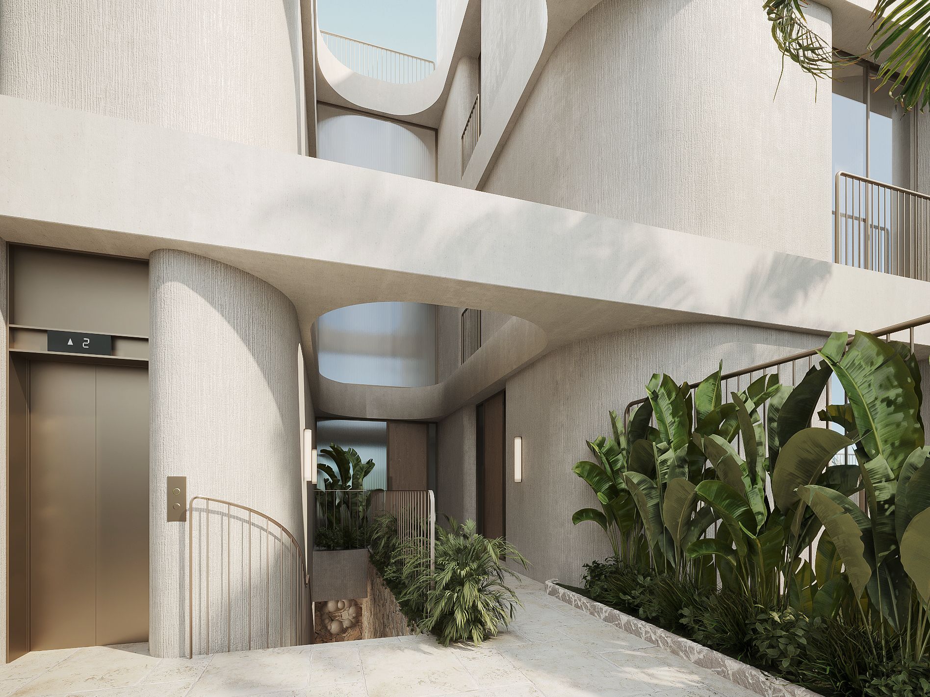 Każde mieszkanie ma trzy sypialnie i trzy łazienki - w tym dwie z łazienkami - a także toaletę dla gości. Salon i jadalnia na otwartym planie są wyposażone w indywidualnie zaprojektowaną kuchnię, która obejmuje wysokiej jakości wbudowane urządzenia Gaggenau i Miele. Ogromne, sięgające od podłogi do sufitu przesuwane drzwi zapewniają mnóstwo światła we wnętrzach i zapewniają bezpośredni dostęp do prywatnych terenów zewnętrznych.