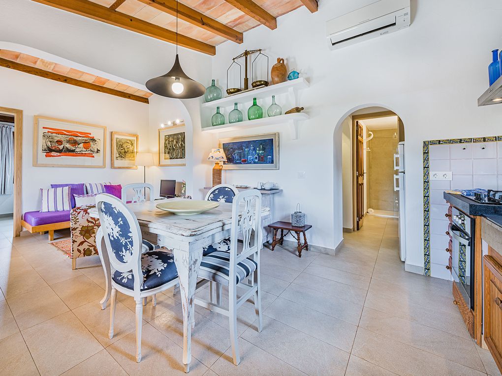 Romantyczna kryjówka dla dwojga w Pollensa. Ta niewielka posiadłość, położona na obrzeżach Pollensy, jest idealnym miejscem dla pary poszukującej spokoju i naturalnego piękna. Z panoramicznym widokiem na Vall de Colonya i majestatyczny Puig de María, oferuje idealne miejsce do wyłączenia się i cieszenia się otaczającą przyrodą. Drewniany taras otaczający wspaniały basen ze słoną wodą, wyposażony w rzymskie schody, zachęca do relaksu w majorkańskim słońcu. Oferuje on również wygodne leżaki i jadalnię na świeżym powietrzu, idealną do spożywania posiłków na świeżym powietrzu. Budynek przypomina urocze wiejskie ustronia z przeszłości i zachowuje oryginalne kamienne ściany portyku wejściowego, gdzie parasol przeciwsłoneczny zapewnia przyjemny cień. Obszar ten jest idealny do relaksu w tradycyjnych majorkańskich fotelach bujanych i podziwiania kolorowych zachodów słońca. Wnętrze łączy rustykalny urok z nowoczesnymi akcentami, z kamienną fasadą, drewnianymi belkami stropowymi i białymi ścianami, które tworzą jasną i przyjazną atmosferę. Współczesne dzieła sztuki doskonale współgrają z tradycyjnymi detalami, takimi jak kamienna podstawa w kuchni i przytulny piec opalany drewnem w salonie. Dom obejmuje przestronną część dzienno-jadalną podzieloną na dwie części, idealną na relaksujące chwile. Dwuosobowa sypialnia jest przytulna, a nowoczesna łazienka jest w pełni wyposażona, aby zapewnić gościom komfort. Urocze miejsce, idealne do cieszenia się prawdziwym spokojem i ciszą w jednym z najbardziej malowniczych zakątków Majorki. NRA: ETV/5980. VUD: ESFCTU00000703000041193600000000000000000000000000ETV/59806Udogodnienia