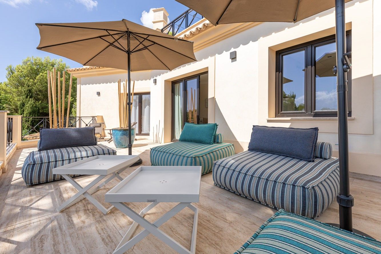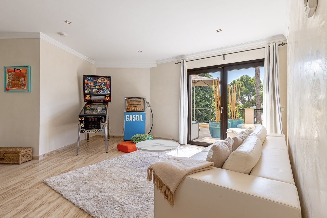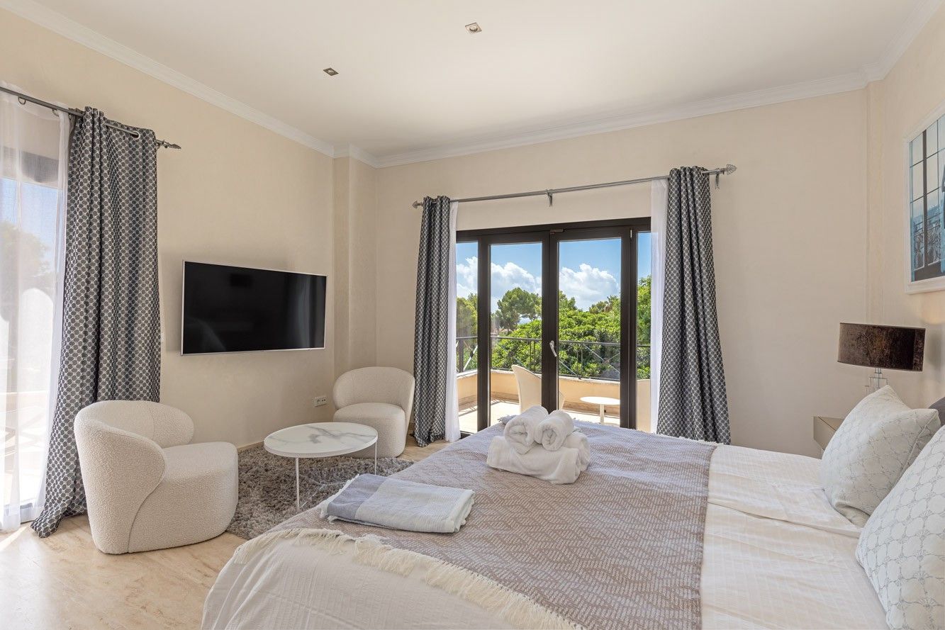 Ta piękna willa z zapierającym dech w piersiach panoramicznym widokiem na morze znajduje się w cichej i ekskluzywnej dzielnicy Nova Santa Ponsa i oferuje wszystko, czego potrzeba do relaksujących wakacji. Na zewnątrz znajduje się prawdziwa oaza z dużym basenem otoczonym zadbanym ogrodem. Dwa przestronne zadaszone tarasy zapewniają idealne miejsca do spożywania posiłków na świeżym powietrzu przy dużym stole lub relaksu w przytulnej strefie relaksu. Kiedy dzień dobiega końca, rozległy taras na dachu staje się ostatecznym miejscem, w którym można cieszyć się zapierającymi dech w piersiach zachodami słońca, grillem i niezakłóconymi widokami. Wewnątrz willa jest gustownie urządzona i może pomieścić do 10 osób w pięciu dwuosobowych sypialniach. W pełni wyposażona kuchnia na otwartym planie zachęca do wspólnego gotowania, a przestronny salon z trzaskającym kominkiem tworzy ciepłą i zachęcającą atmosferę w chłodniejsze wieczory. Piaszczysta plaża i przystań Port Adriano, znana z luksusowych restauracji, butików i tętniącego życiem nocnego życia, znajdują się zaledwie 15 minut spacerem od hotelu. Dla miłośników golfa, pola golfowe Santa Ponsa i Poniente oraz kilka innych popularnych pól golfowych na wyspie znajdują się w odległości krótkiej przejażdżki od willi. ETV 7175