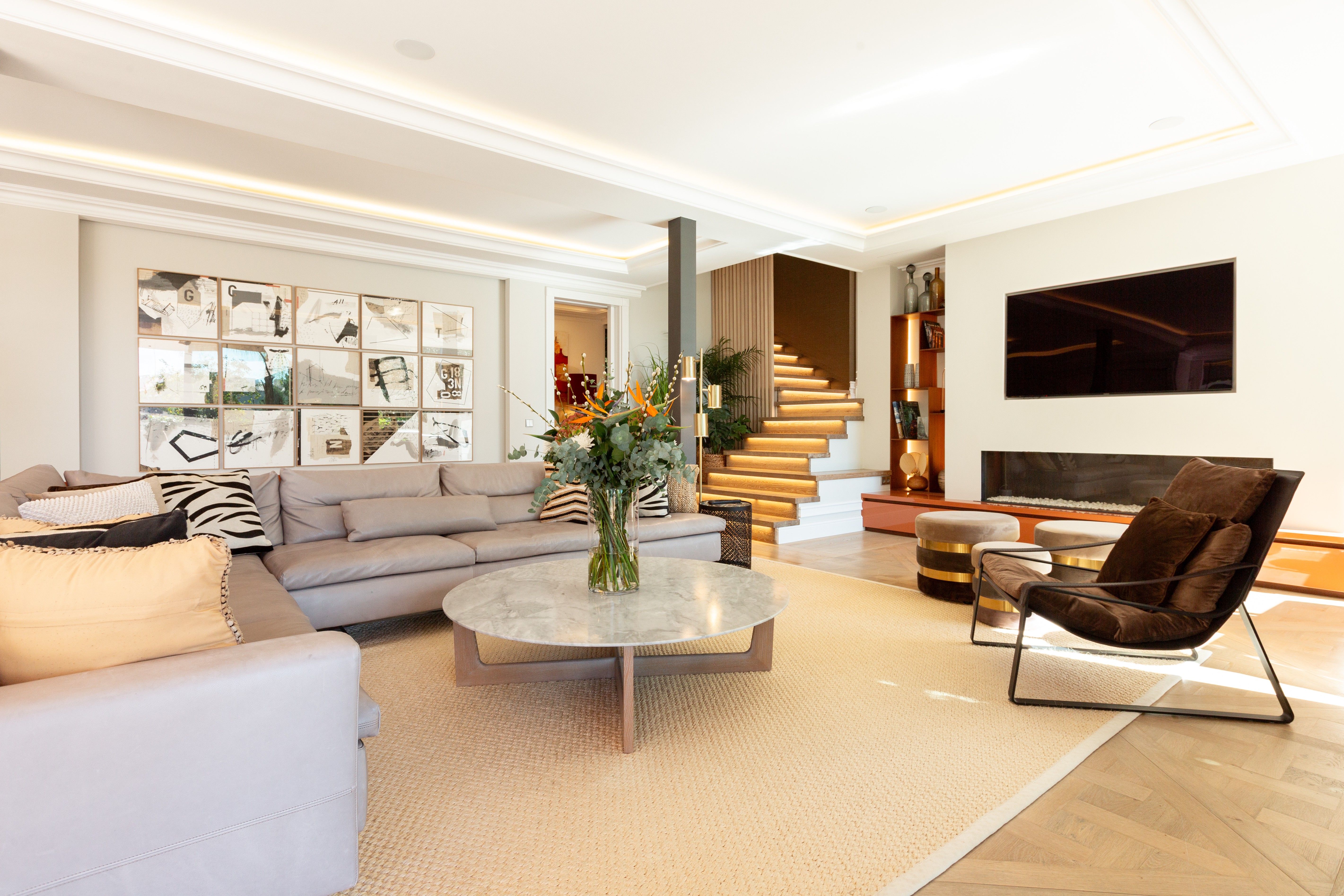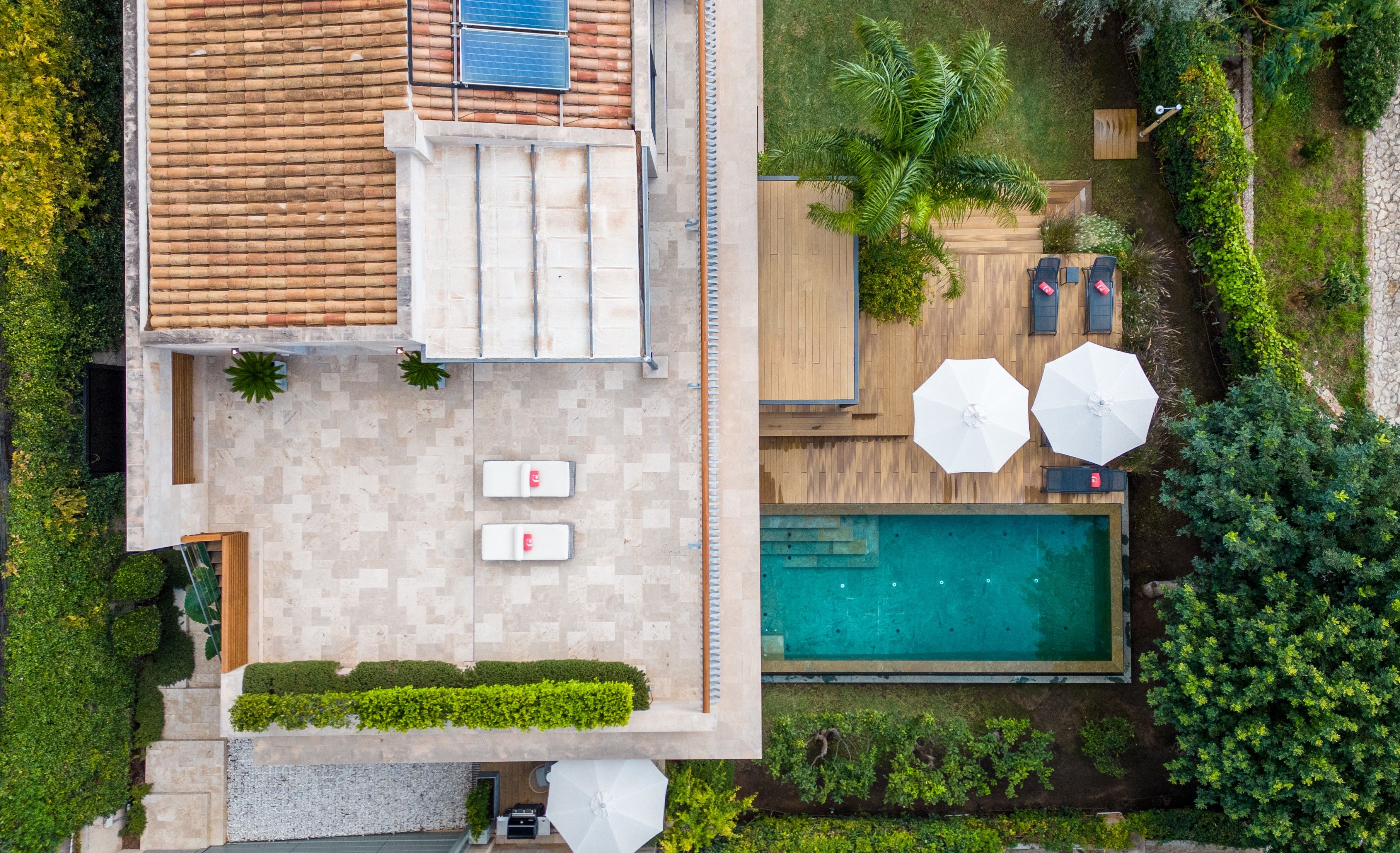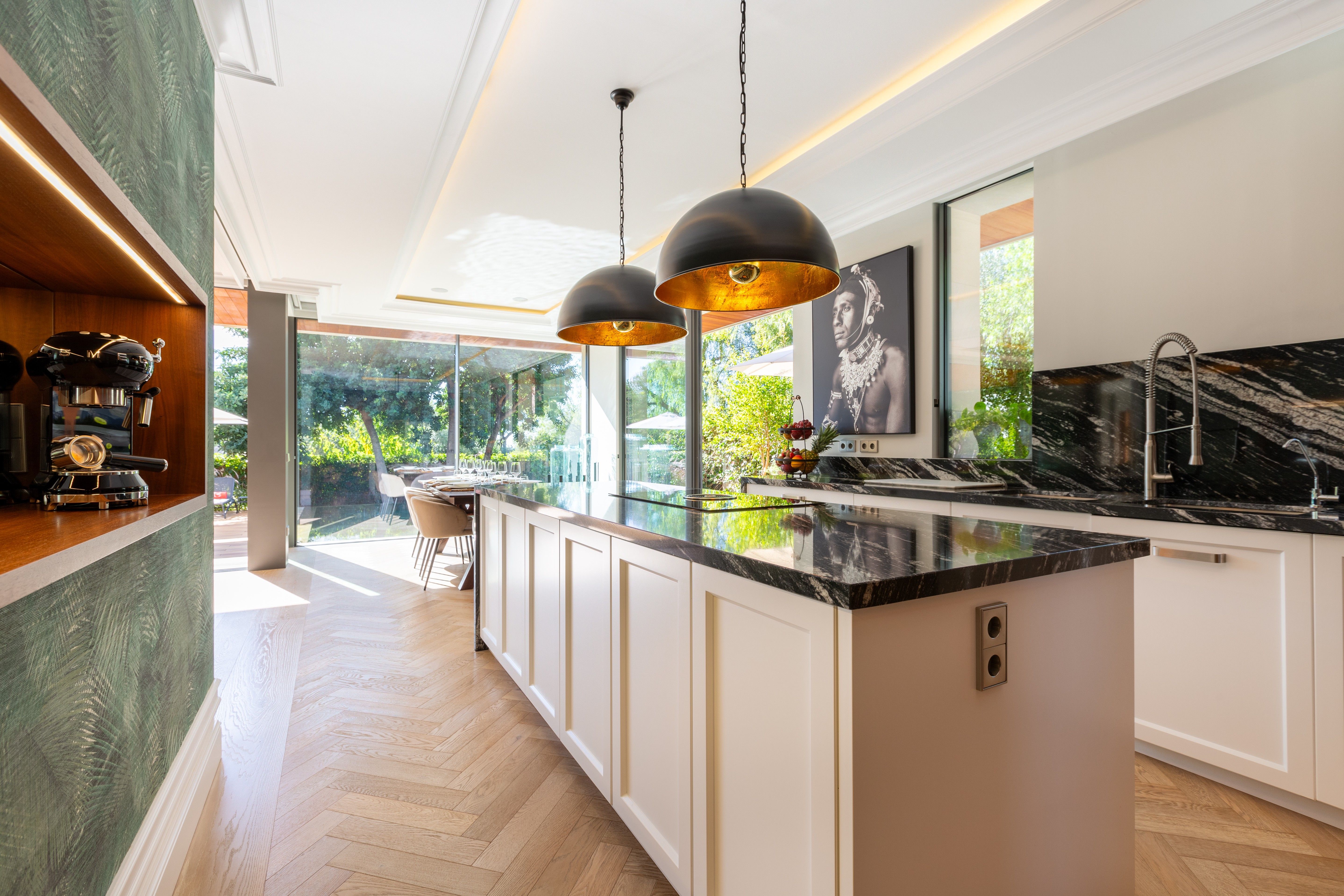 Ta willa została zbudowana z najwyższej jakości materiałów i ozdobiona pięknymi designerskimi meblami, takimi jak włoska skórzana sofa centralna Poltrona Frau. Willa ma podłogi z naturalnego drewna z ogrzewaniem podłogowym, klimatyzację we wszystkich pomieszczeniach, system muzyczny Sonos, duży telewizor ze Sky, ultraszybkie Wi-Fi, nowoczesny kominek gazowy i system zarządzania domem. Główną atrakcją nieruchomości jest elegancki basen bez krawędzi z indyjskiego zielonego marmuru, do którego można dostać się z tarasu z nastrojowym oświetleniem i wbudowanym jacuzzi, otoczony kamieniem i trawnikiem. Położony na 2 poziomach, ten stylowy dom o powierzchni 500 m2 ma płynny przepływ między przestrzenią mieszkalną a zewnętrzną dzięki dużym oknom wykuszowym, które składają się z powrotem w czyste zagięcie. 3 sypialnie są rozmieszczone na parterze z dostępem do zewnątrz z niektórych pokoi i wszystkie z naturalnym światłem. Główna sypialnia jest dziełem sztuki z dużym podwójnym łóżkiem Divan z widokiem na taras i morze. Wszystkie łóżka wyposażone są w materace sprężynowe Vi i pościel ze 100% egipskiej bawełny 800TC. Wszystkie łazienki wyposażone są w baterie Hans Grohe, prysznice ze strumieniem deszczowym i ceramikę Duravit. W całym domu zainstalowano ogrzewanie podłogowe i klimatyzację. Imponująca, przestronna część dzienna, która otwiera się bezpośrednio na zadaszony taras, a także na piękną, nowoczesną kuchnię Nowoczesna rodzinna jadalnia z widokiem na basen i zewnętrzną kuchnię i jadalnię Tygodniowa cena obejmuje zmianę pościeli i ręczników dwa razy w tygodniu oraz 4 godziny sprzątania 5 dni w tygodniu. Ogrodnik i zwykłe koszty utrzymania wliczone w cenę