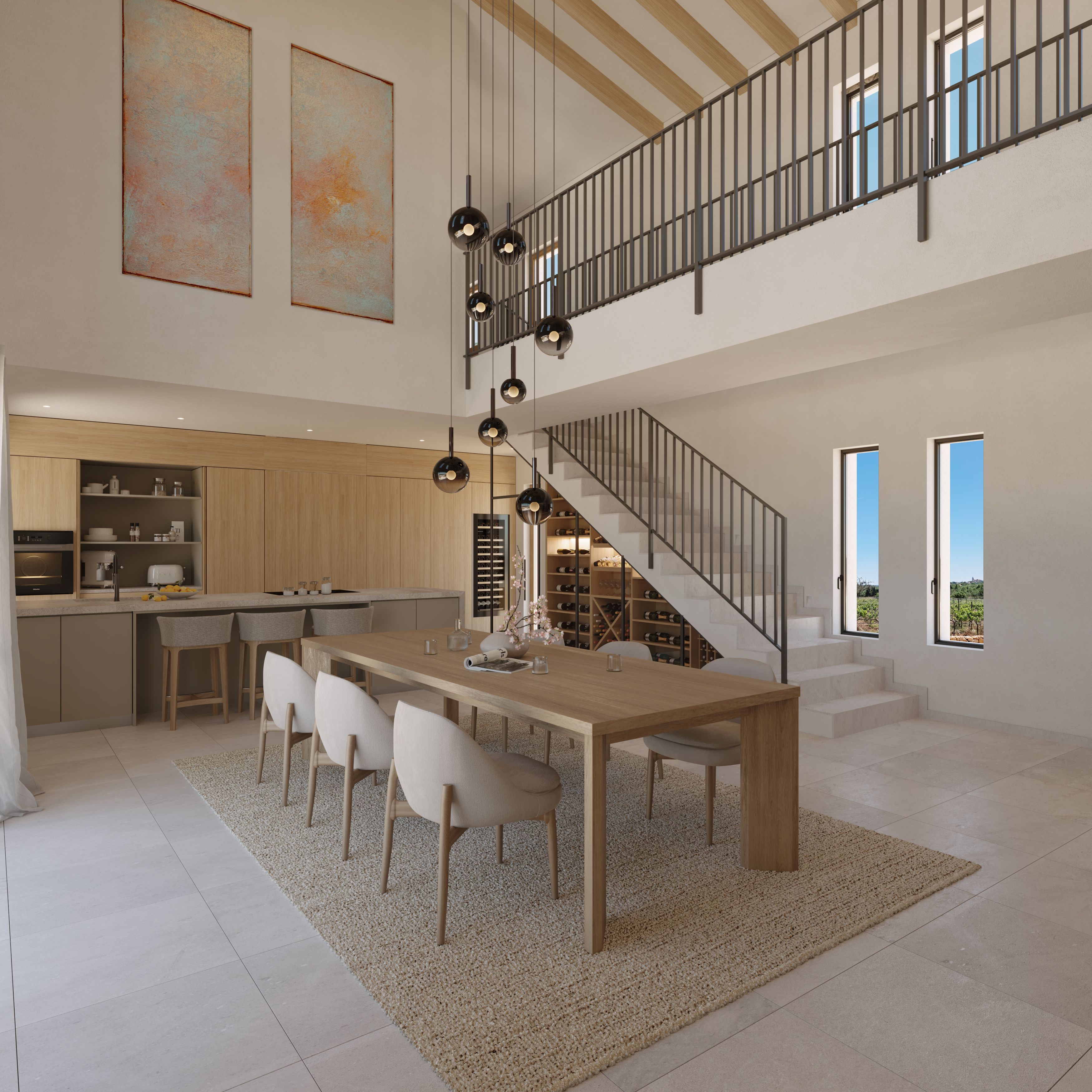 Эта финка - архитектурная жемчужина, в которой гармонично сочетаются современная элегантность и майоркинские традиции. Обрамленная стенами из натурального камня и с великолепным видом на горы Трамунтана, эта вилла представляет собой вневременное уединение высочайшего качества. Центральным элементом дома является впечатляющая гостиная, открытая планировка которой отличается исключительным простором благодаря галерее и комнатам двойной высоты. Особое внимание привлекает двухэтажная стена из натурального камня со встроенным туннельным камином, который наполняет уютным теплом не только гостиную, но и кухню и столовую, а открытые деревянные балки подчеркивают средиземноморский характер.