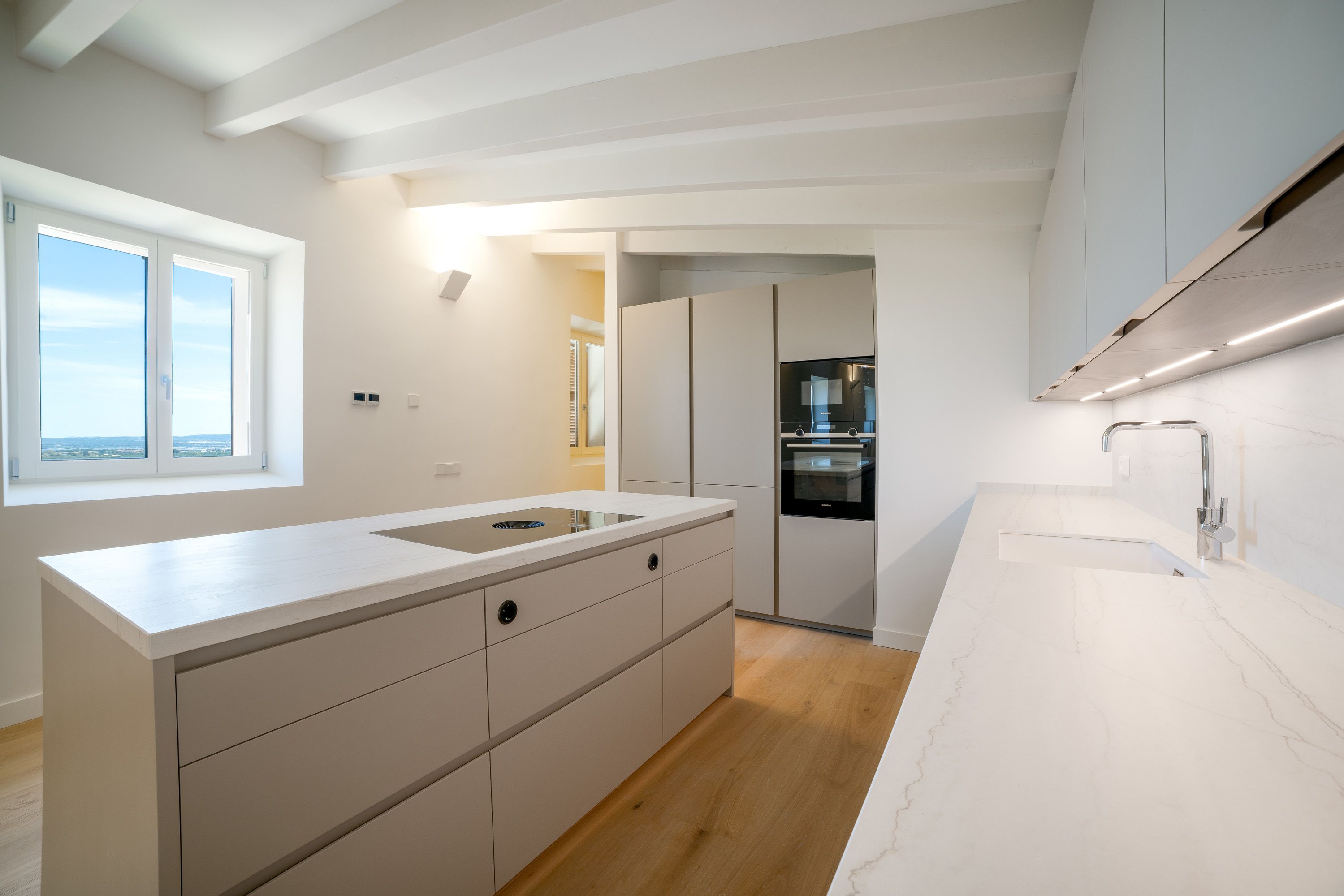 Кухни, спроектированные компанией Caire Espai Cuina, оснащены высококачественной мебелью Mobalco, столешницами Dekton, фурнитурой Dornbracht и бытовой техникой Siemens и Bora. В элегантных ванных комнатах установлена сантехника Duravit, фурнитура Dornbracht и раковины Dekton.