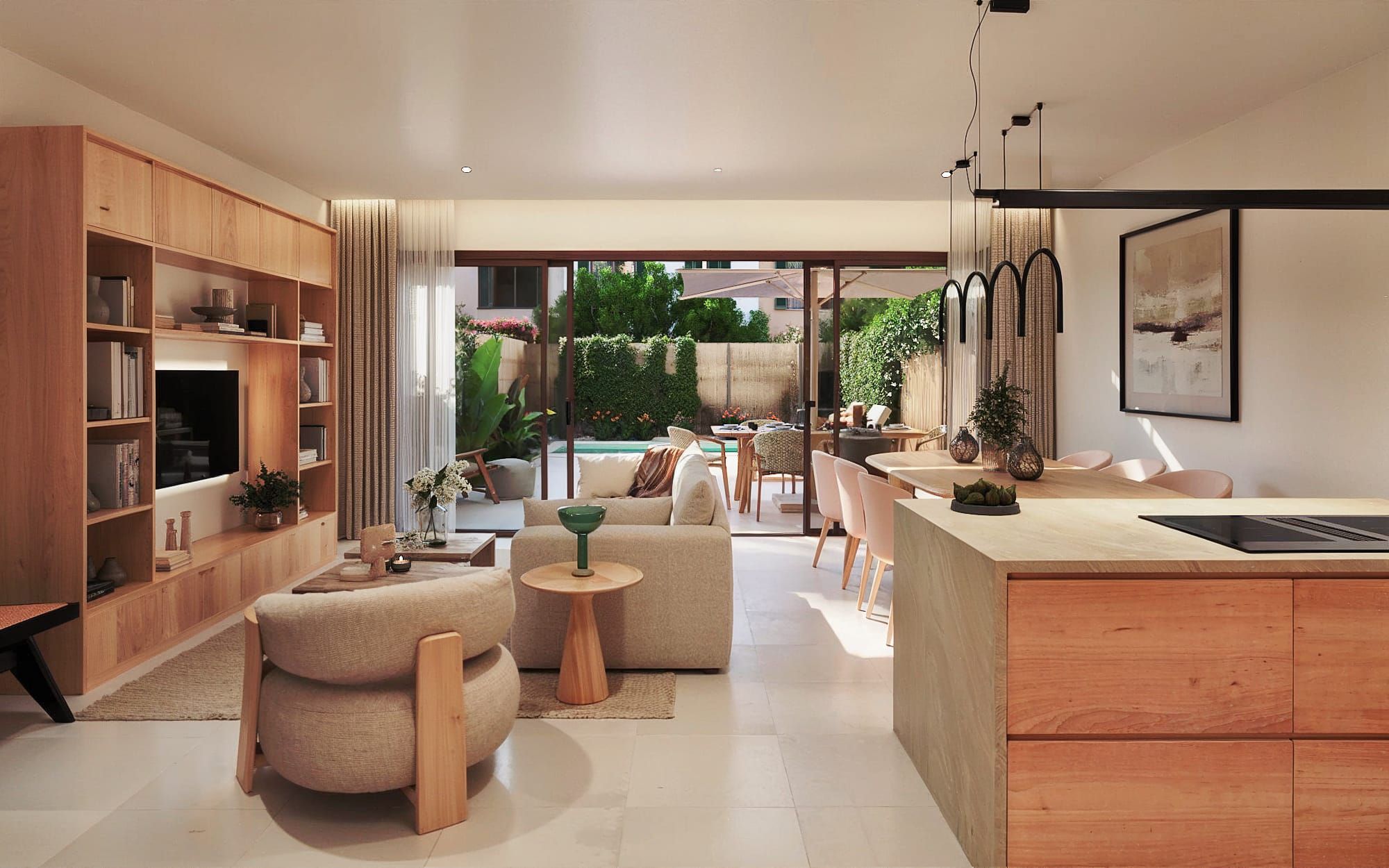 Открытая площадка является изюминкой: наслаждайтесь мягким климатом Майорки в частном саду с собственным бассейном, который оснащен современной электролизной системой. Крытая терраса и великолепная зона барбекю приглашают вас провести часы отдыха на свежем воздухе.