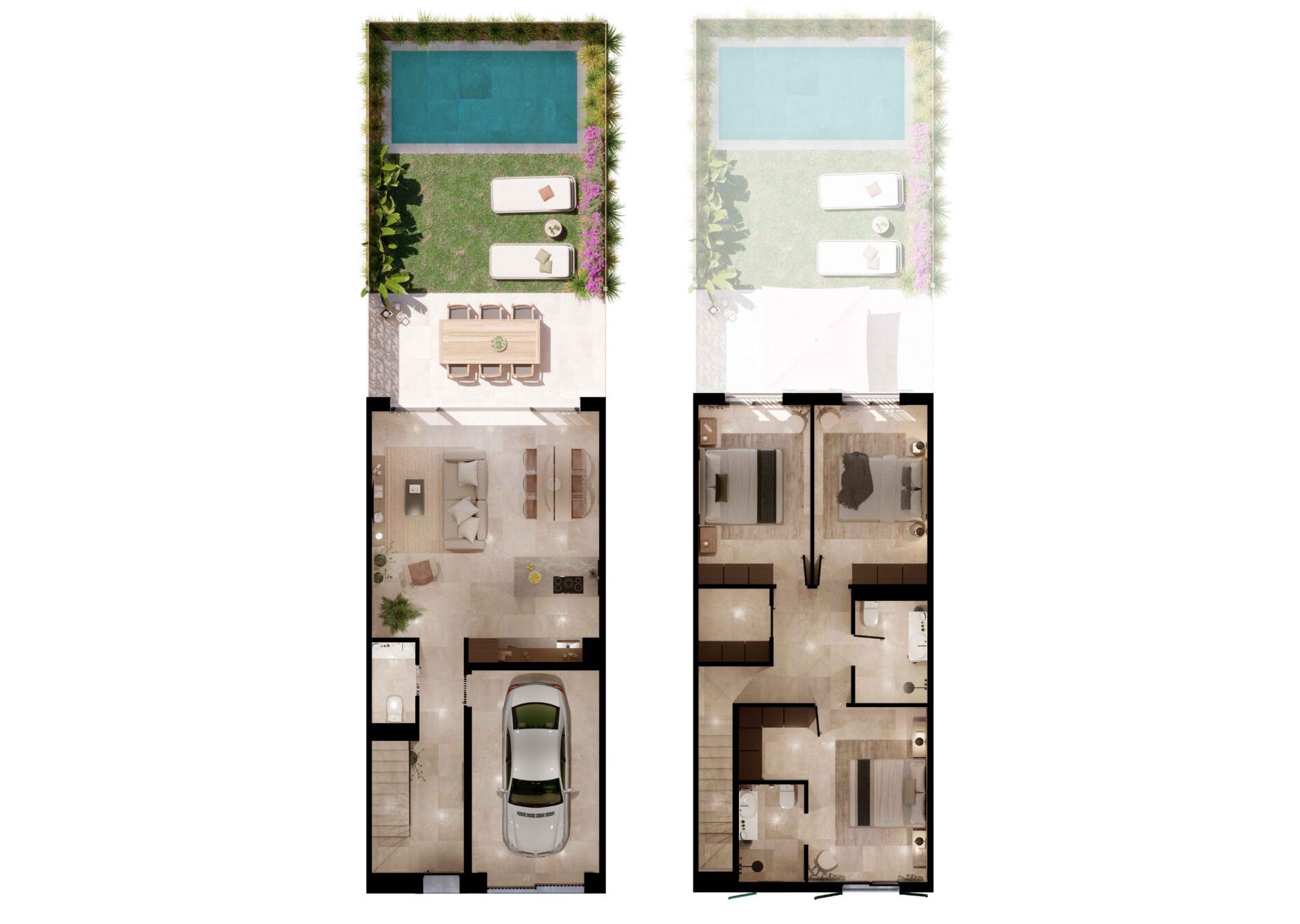 Каждый дом имеет три спальни, две ванные комнаты и гостевой туалет и предлагает достаточно пространства для современной жизни на обширной площади около 144 м². Продуманная планировка с открытыми, залитыми светом комнатами создает приятную атмосферу, в ней использованы высококачественные материалы. Полностью оборудованная высококачественная кухня не оставляет желать лучшего и предлагает все необходимое для средиземноморского образа жизни.