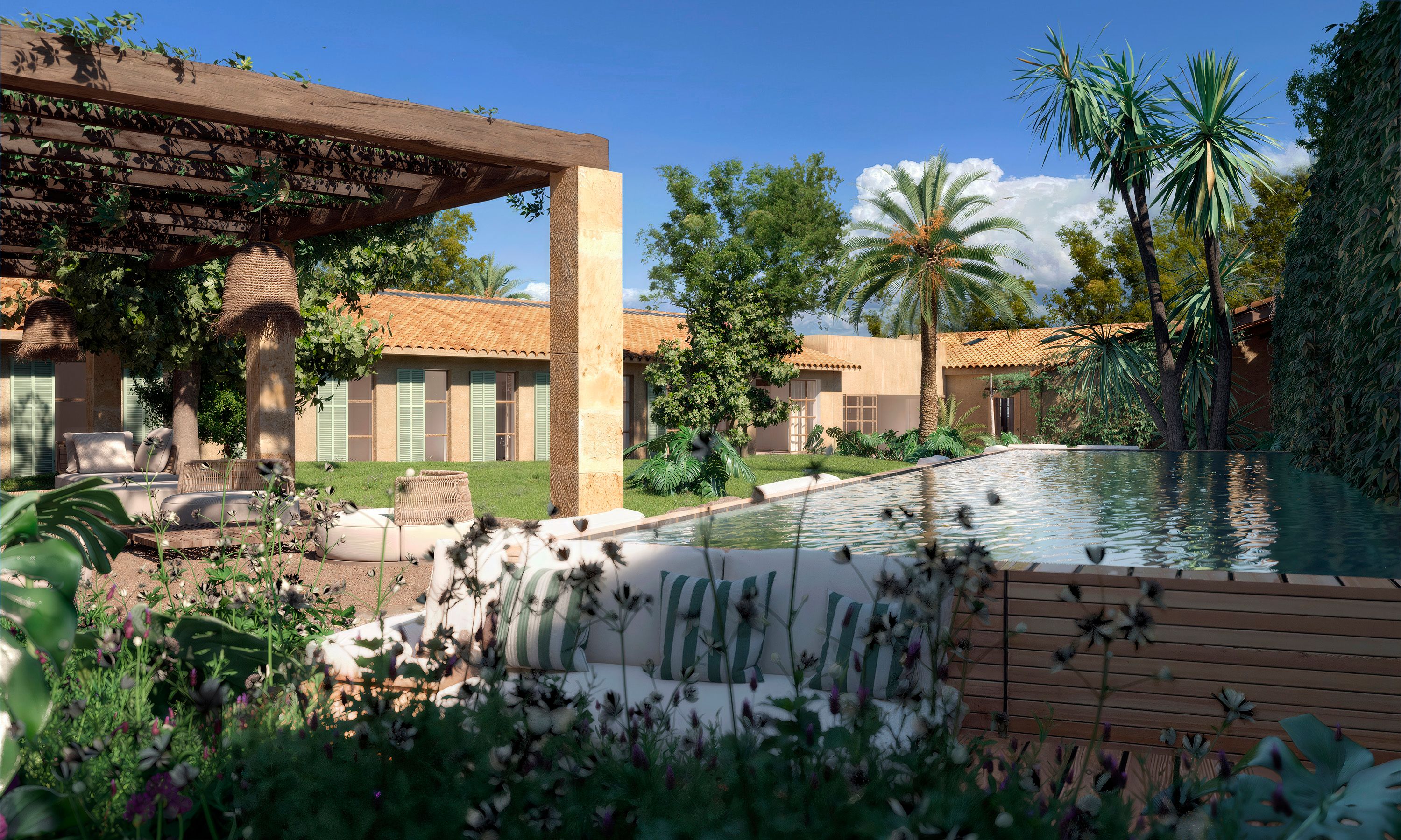 Тип: Дом • Регион: Окрестности Пальмы и Сон Вида • Общая площадь: 480 ㎡ • Спальни: 4 • Ванные комнаты: 4 • Площадь участка: 1.200 ㎡ • Парковка: 1 • Бассейн