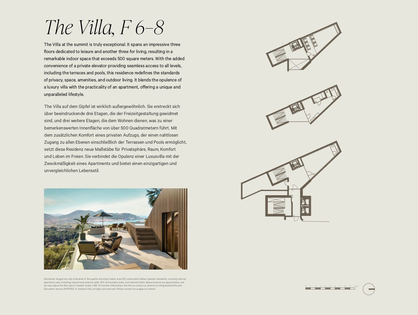 Над портом Андрач, с великолепным видом на идиллическую гавань и предгорья гор Трамунтана, в настоящее время строится эксклюзивный жилой комплекс Andratx Hills с 9 резиденциями в собственном классе! Пентхаус под названием "Вилла" с 4 спальнями, 6 ванными комнатами и частным лифтом предлагает чистую роскошь на общей площади 500 м² плюс 355 м² частных открытых площадок. Гостиная и спальни расположены на двух уровнях. Тренажерный зал, оздоровительная зона и домашний кинотеатр расположены на 3 этажах. Обширная терраса с садом и большим бассейном, доступная из гостиной, а также сад на уровне спален и огромная терраса на крыше с частным бассейном также являются частью этого дома мечты. Помимо большого пространства, уединения и великолепного дизайна, вы сможете наслаждаться великолепным видом на идиллические горные пейзажи, гавань и море! Уникален не только пентхаус, но и архитектура всего проекта! Она сочетает в себе органичные формы и современный футуристический дизайн с использованием множества натуральных материалов, излучающих тепло. Сочетание бетона, дерева и стекла просто великолепно. Большие оконные фасады привносят много естественного света в жилые помещения и создают идеальный переход изнутри наружу. Все материалы и отделка были тщательно отобраны, чтобы соответствовать самым высоким международным стандартам. Эксклюзивные особенности пентхауса включают открытую кухню с островом для приготовления пищи и встроенной техникой Gaggenau, Miele и Bora, фурнитуру Vola, встроенные шкафы/гардеробные на заказ, полы с подогревом, кондиционеры и 3 парковочных места в гараже.